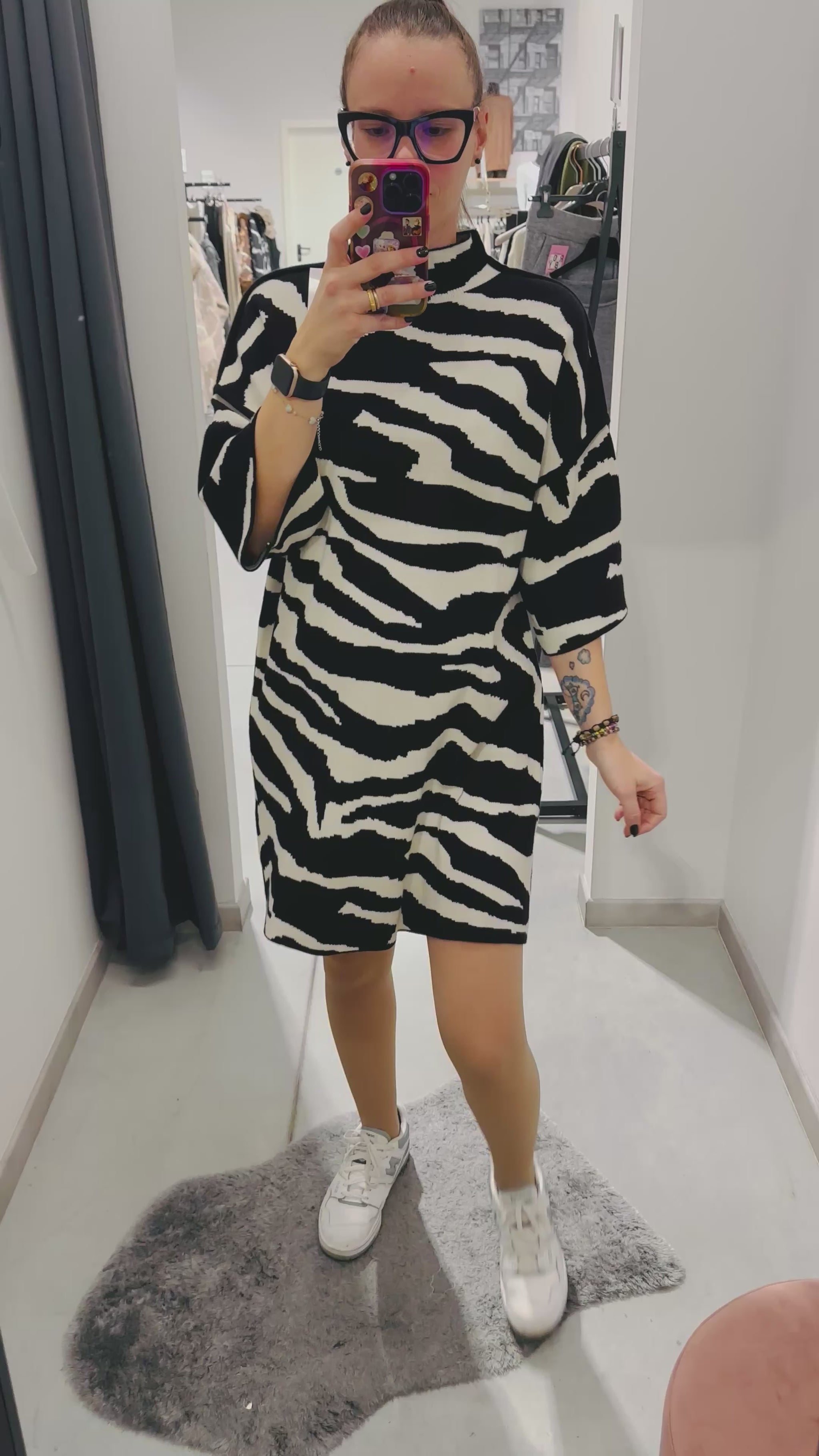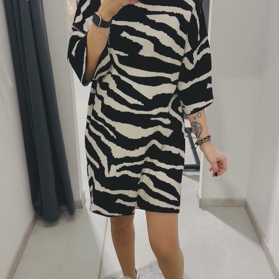 Abito in calda viscosa, collo a lupetto e maniche 3/4 larghe. Vestibilità morbida