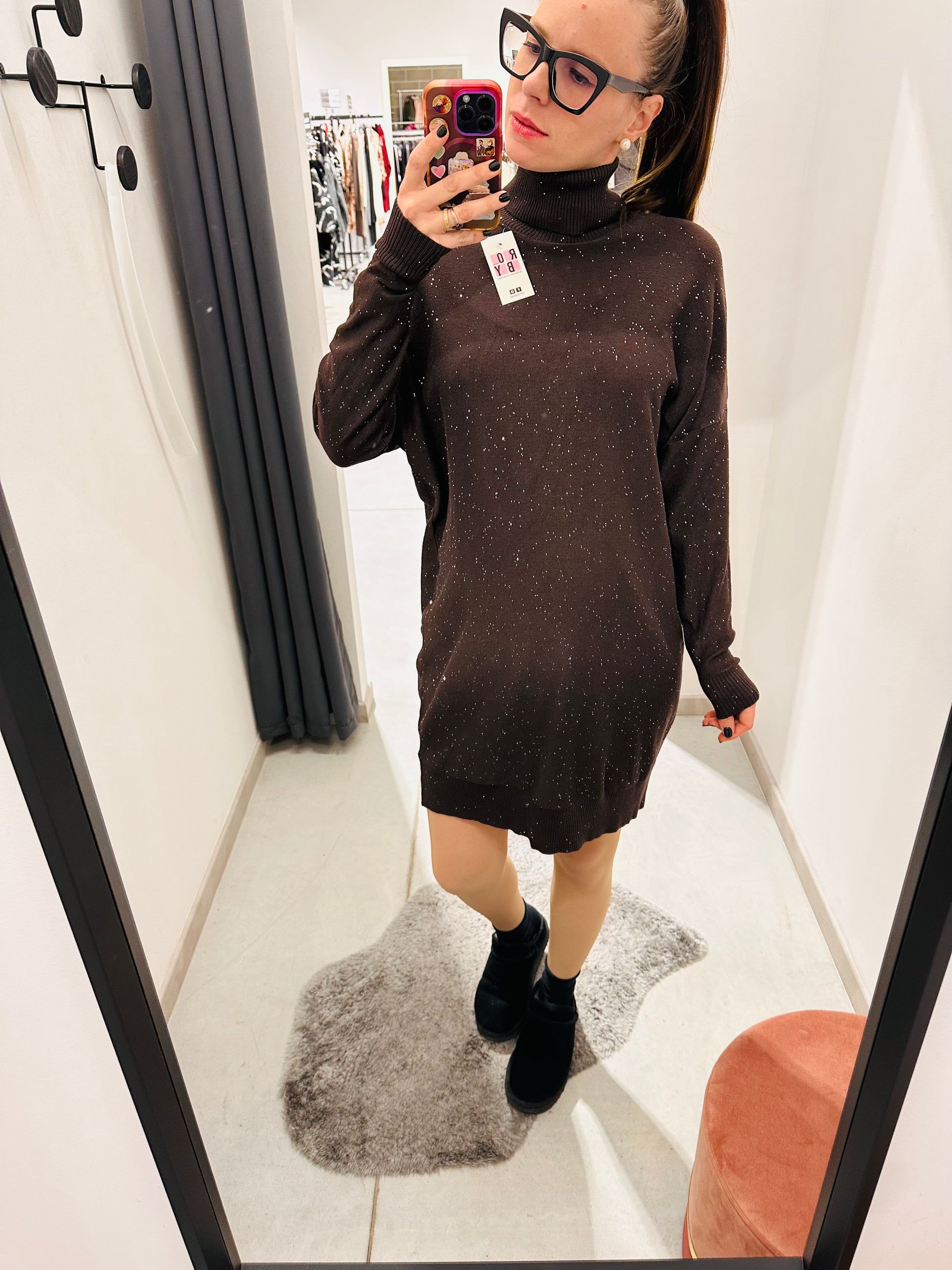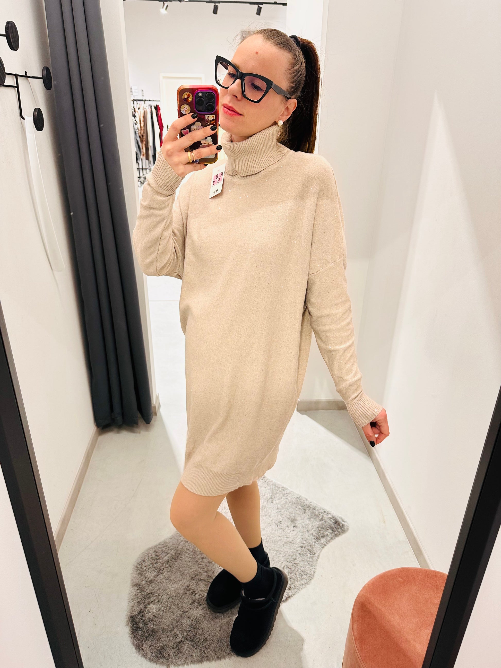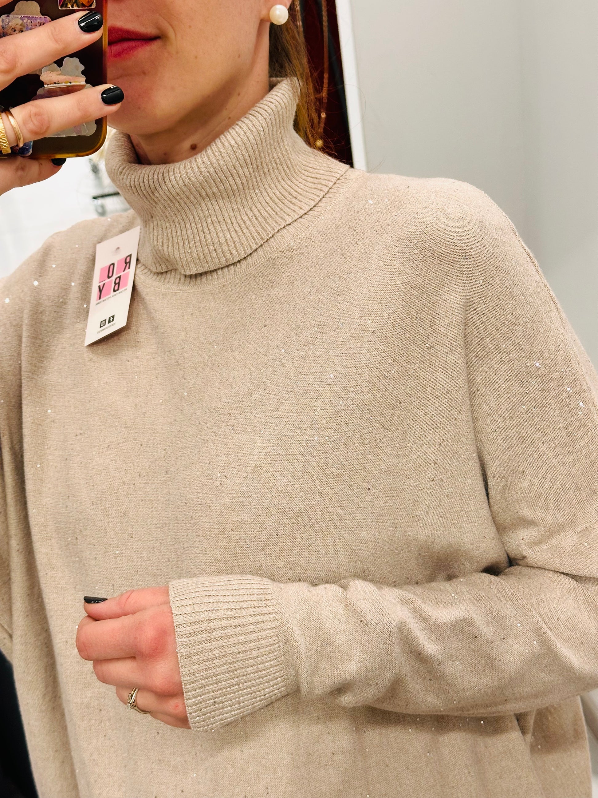Abito over in calda viscosa, collo alto. Paillettes cucite, vestibilità morbida