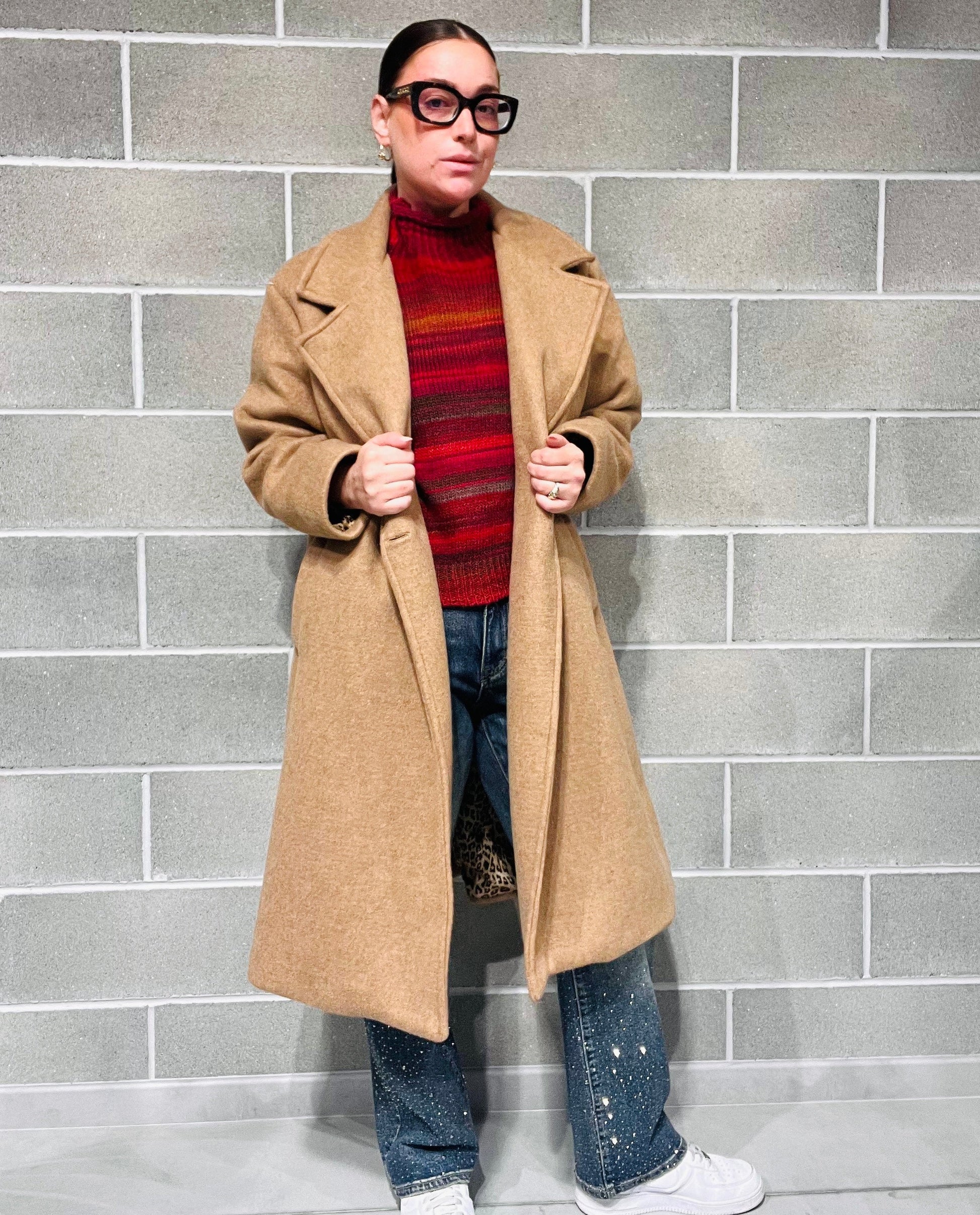 Cappotto lungo in panno, foderato internamente con fantasia animalier. Vestibilità morbida