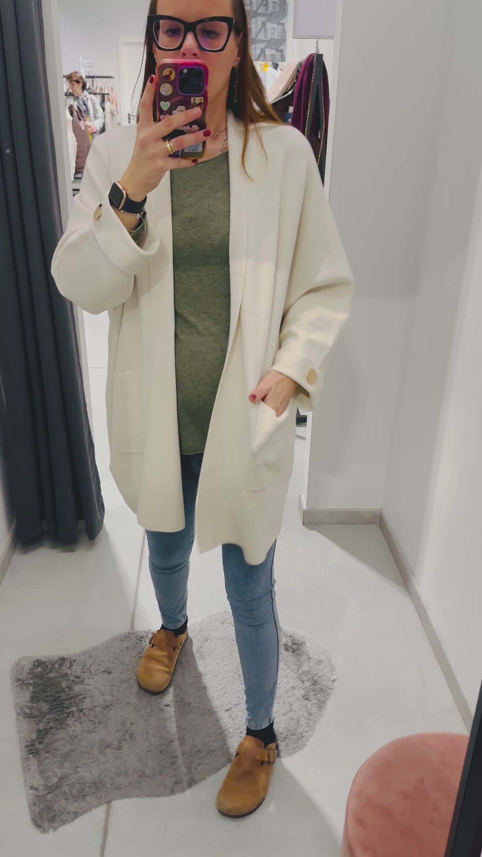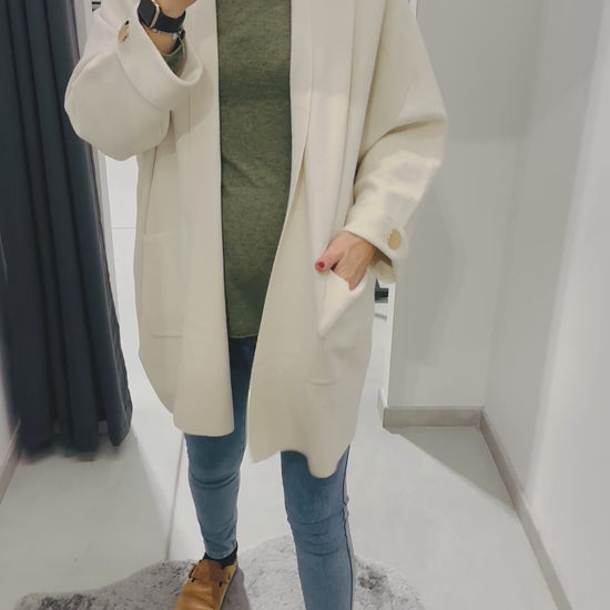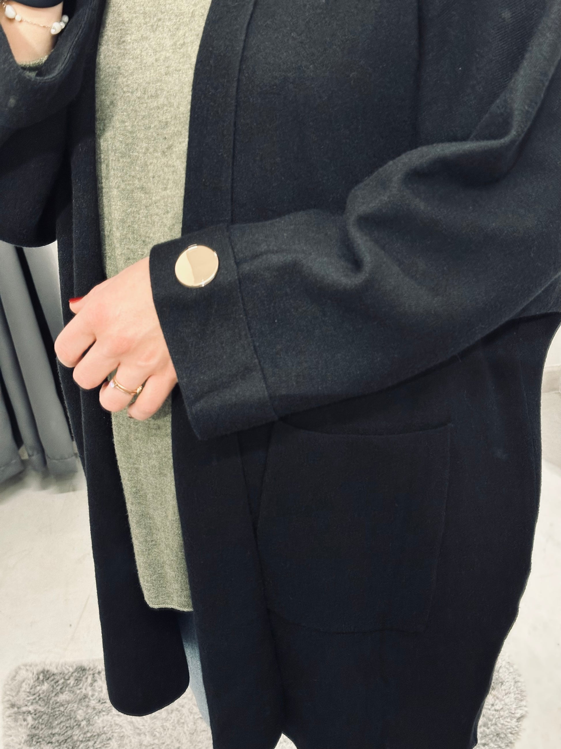 Cardigan oversize in calda viscosa con bottoni gioiello sui polsi, taglio aperto. Vestibilità morbida