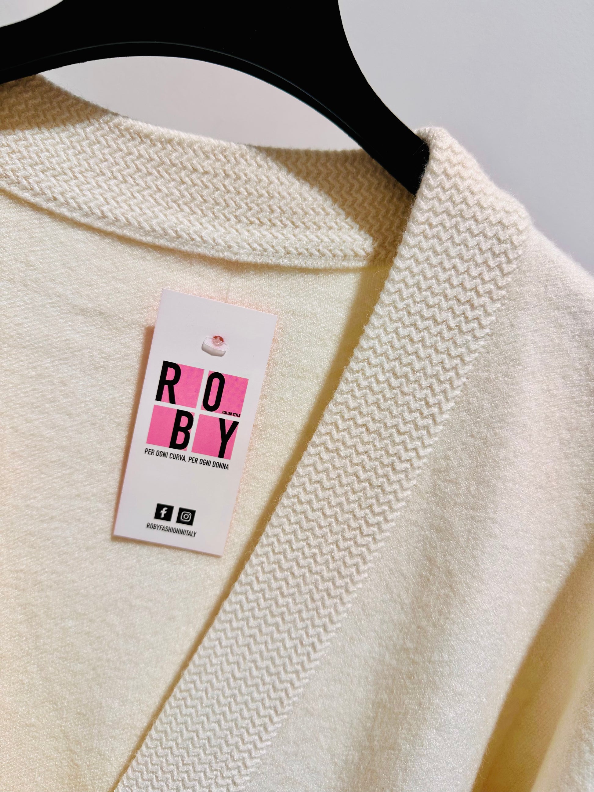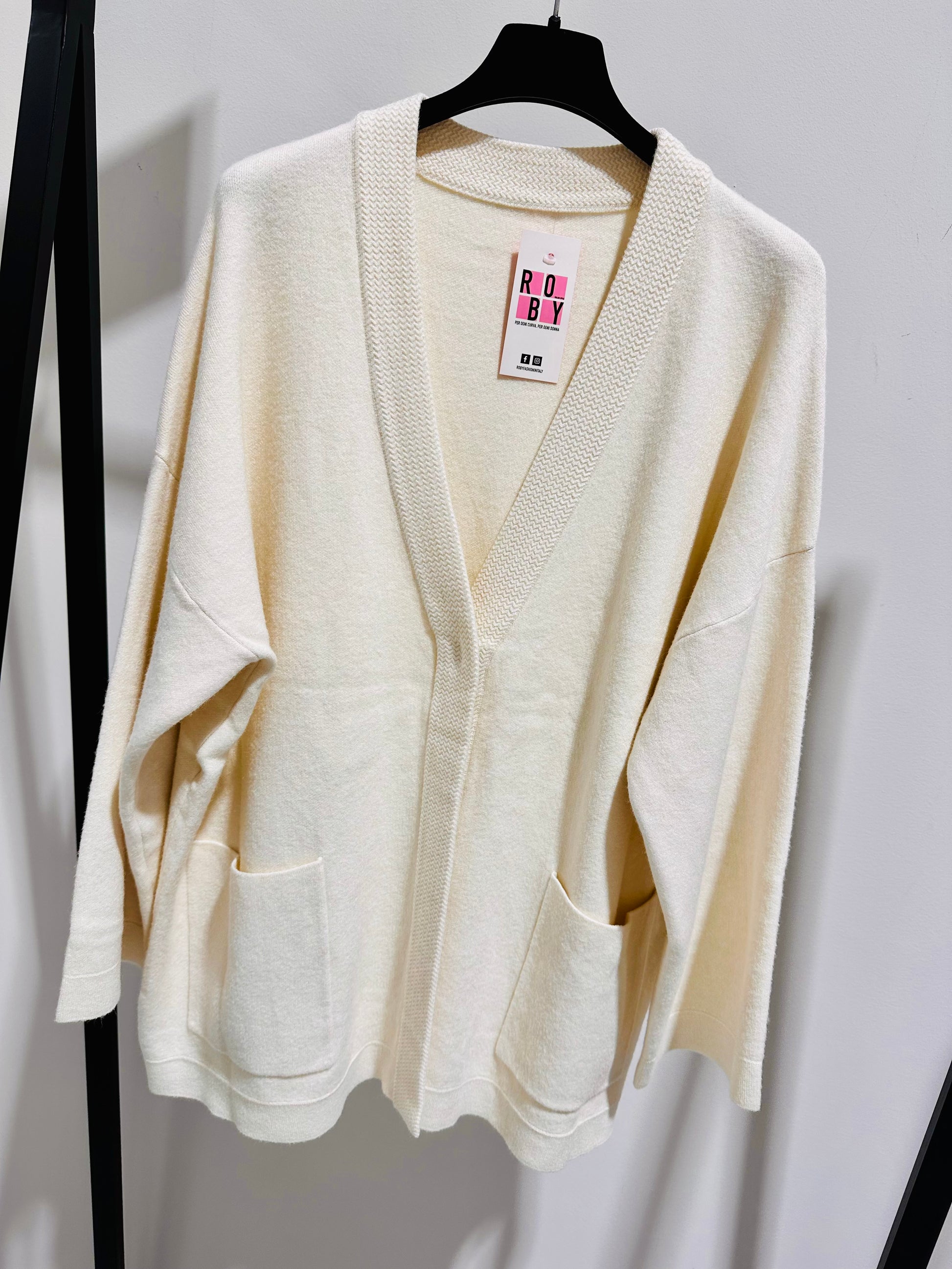 Cardigan in calda viscosa, chiusura con bottone automatico e taschine. Maniche leggermente morbide e taglio over