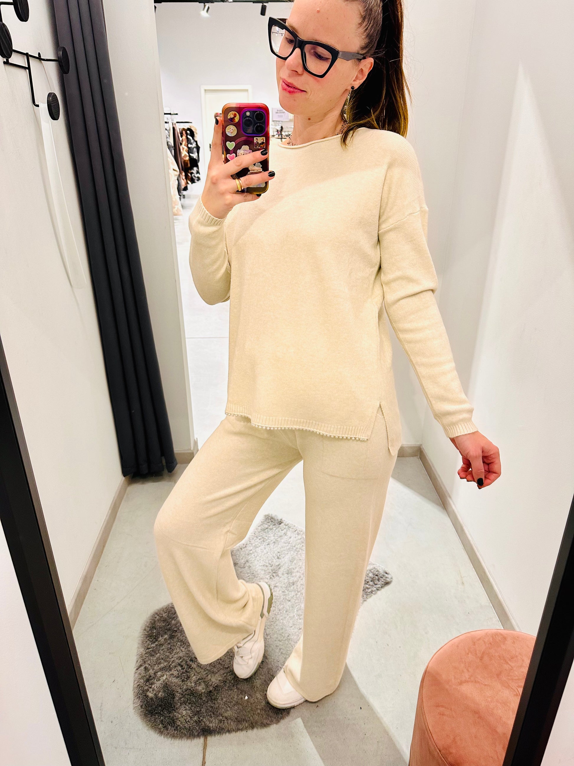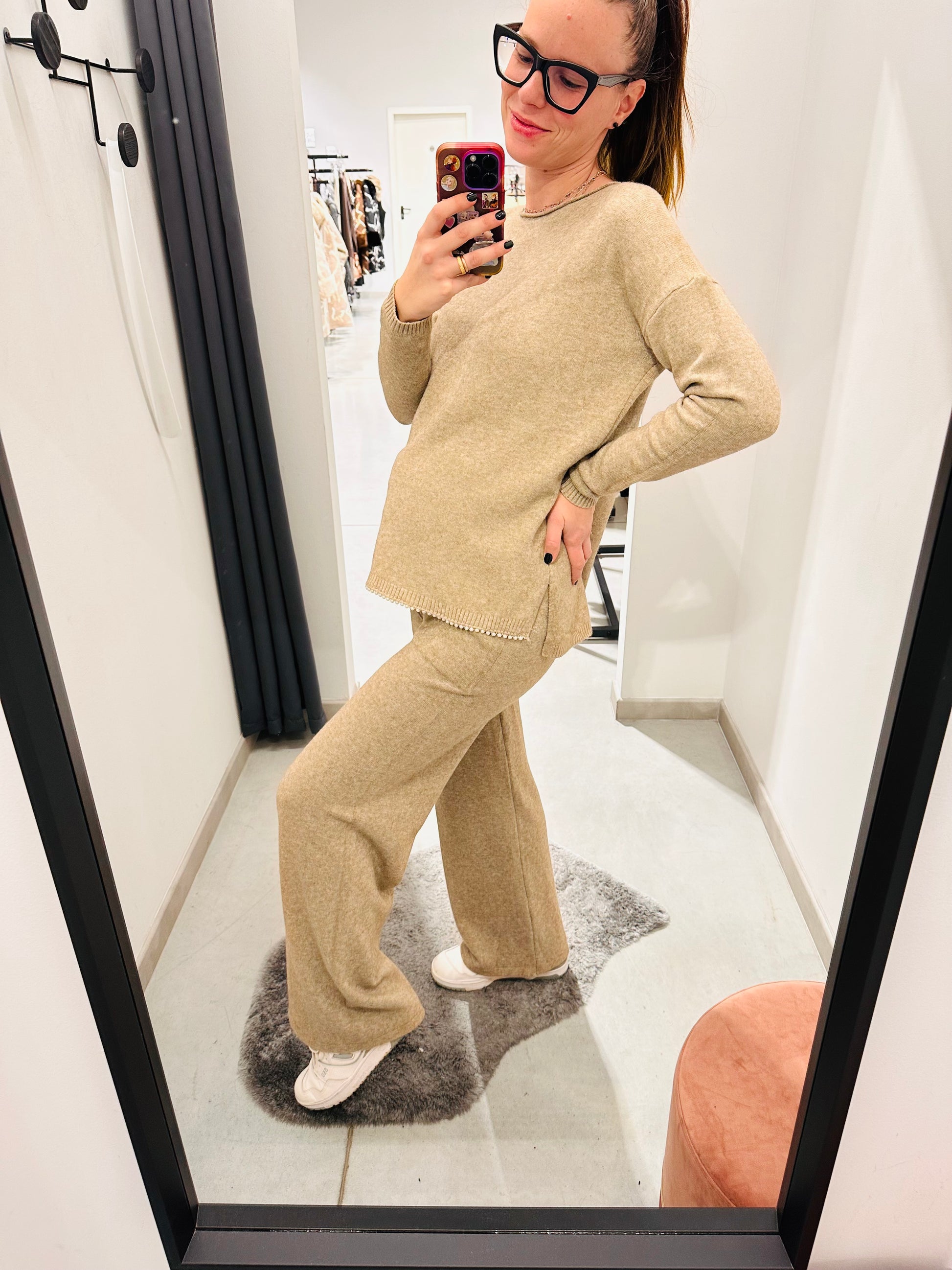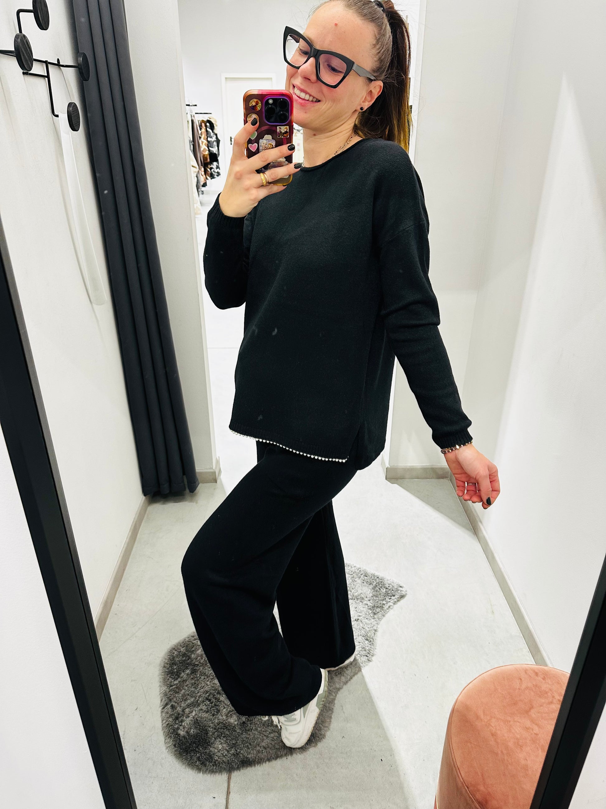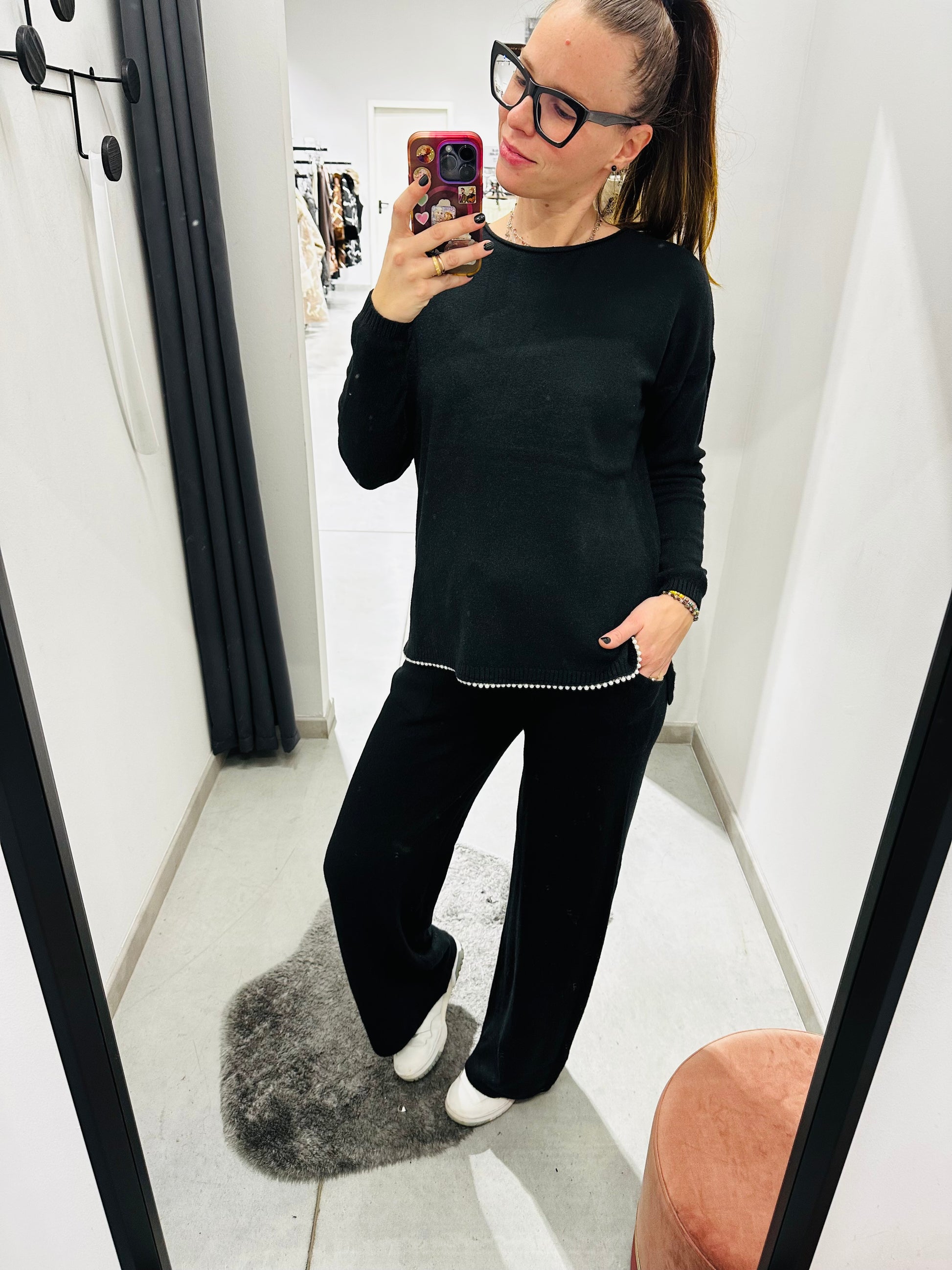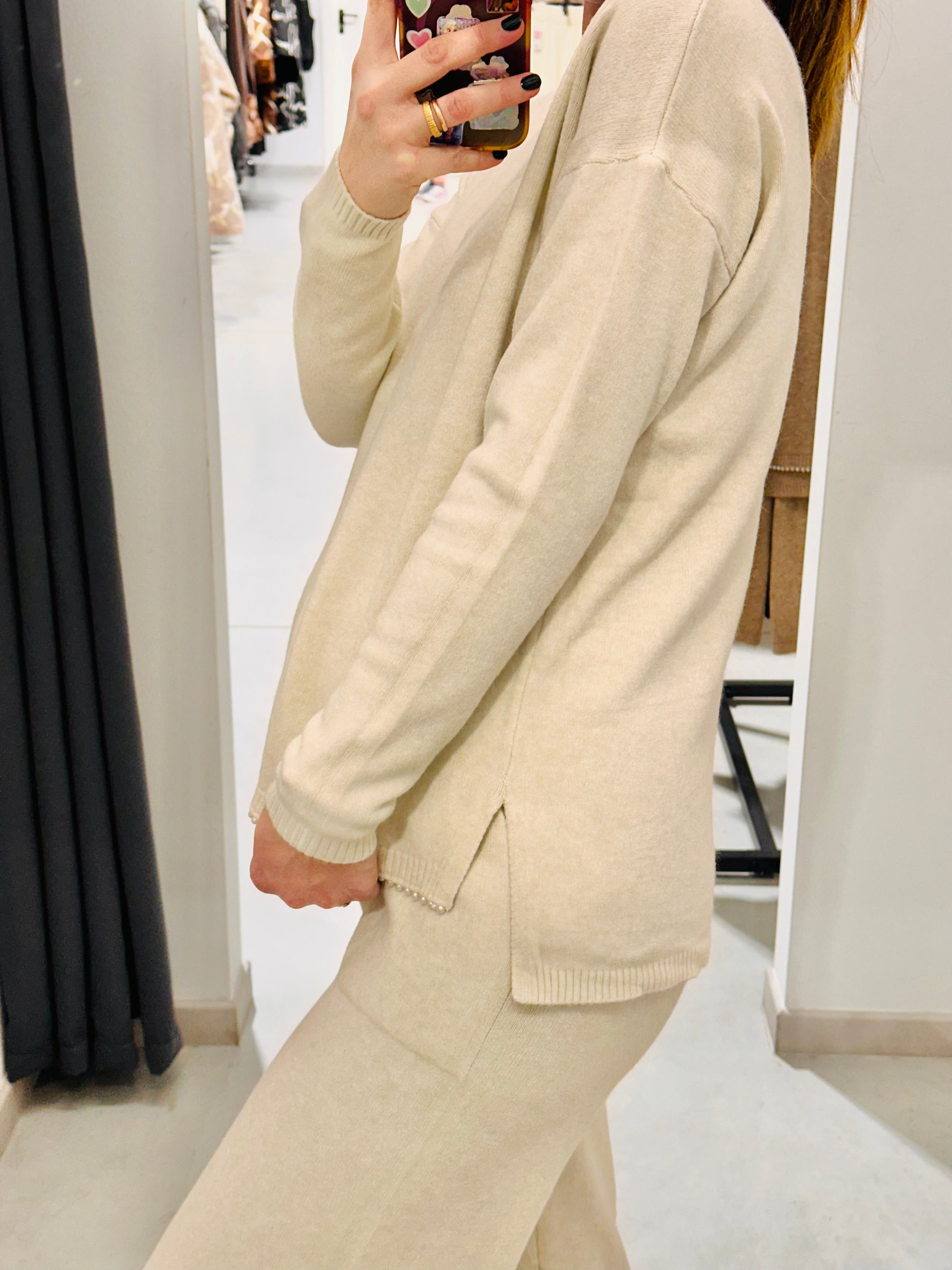 Completo tuta in calda viscosa. Maglia con spacchetti laterali e perline cucite. Pantaloni con coulisse e tasche. Vestibilità regolare