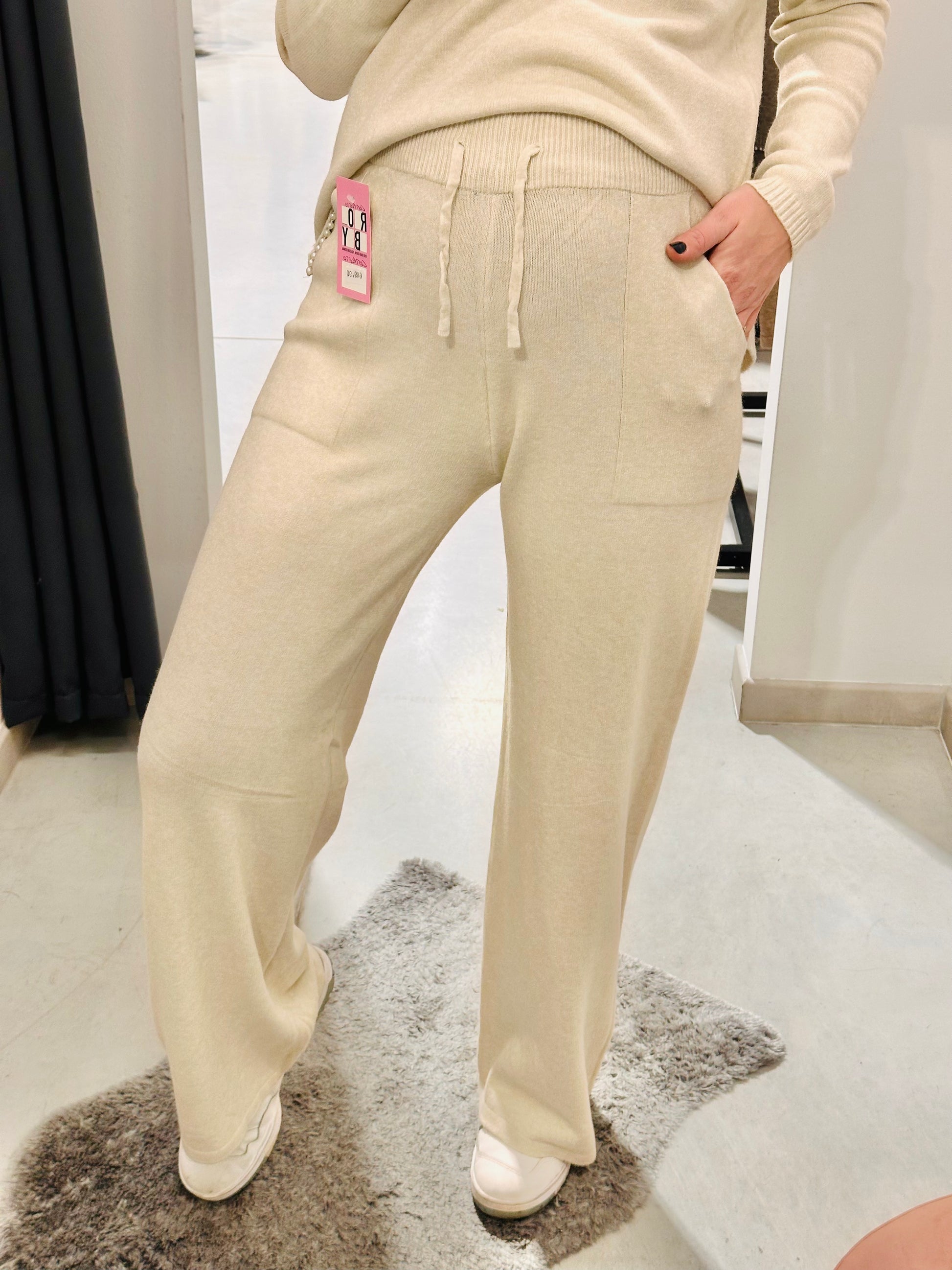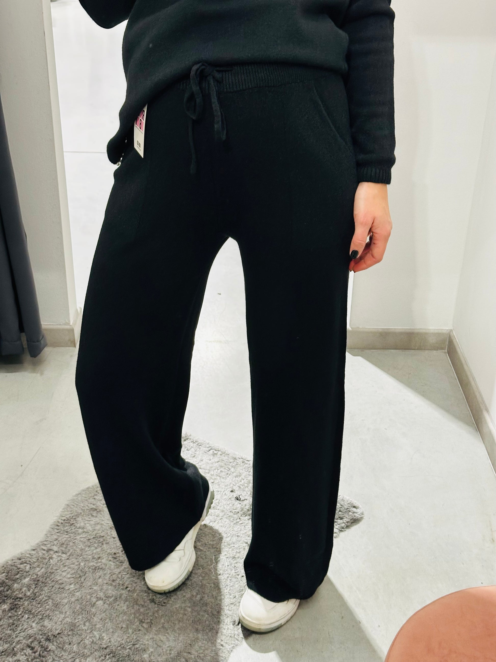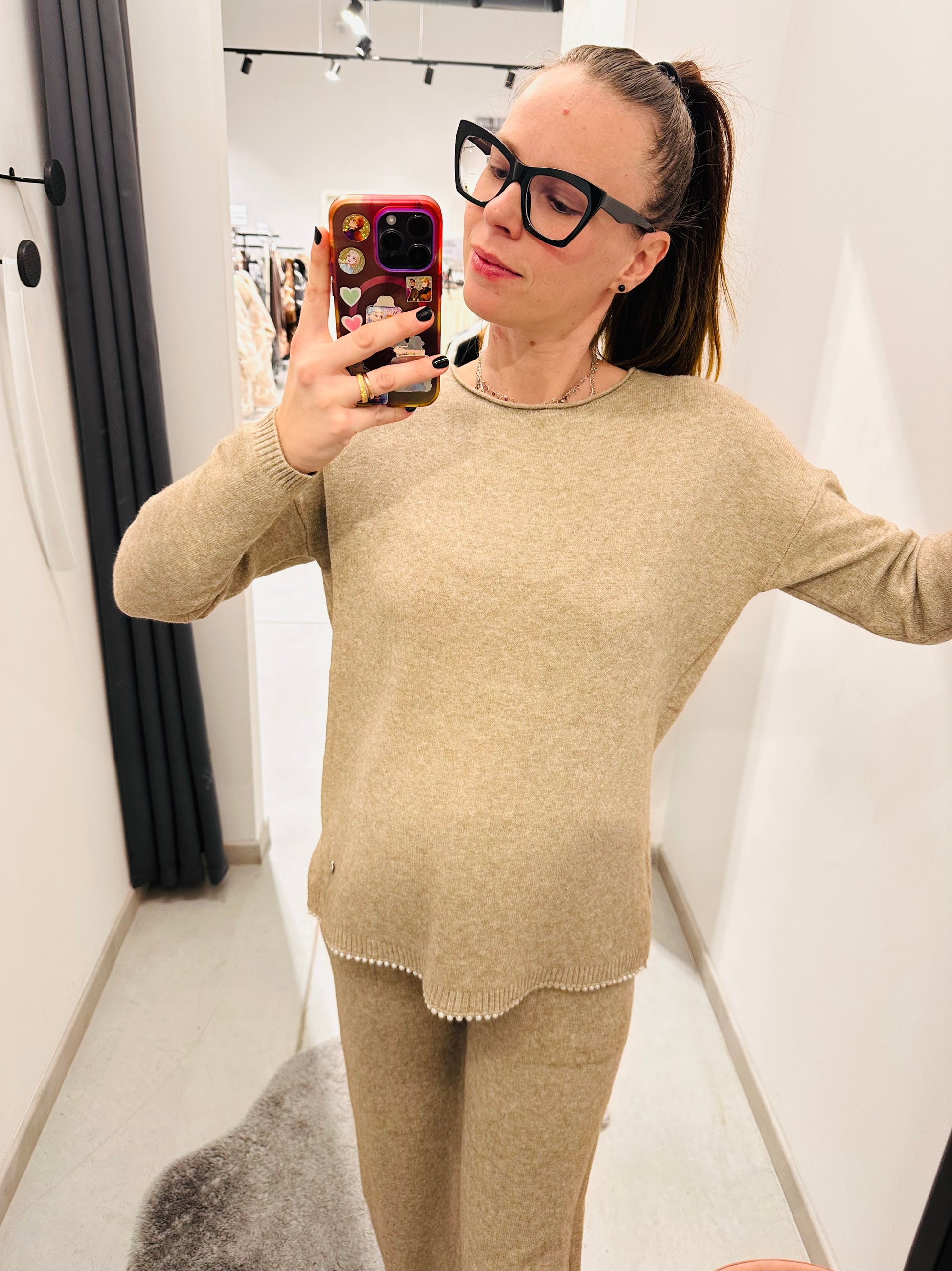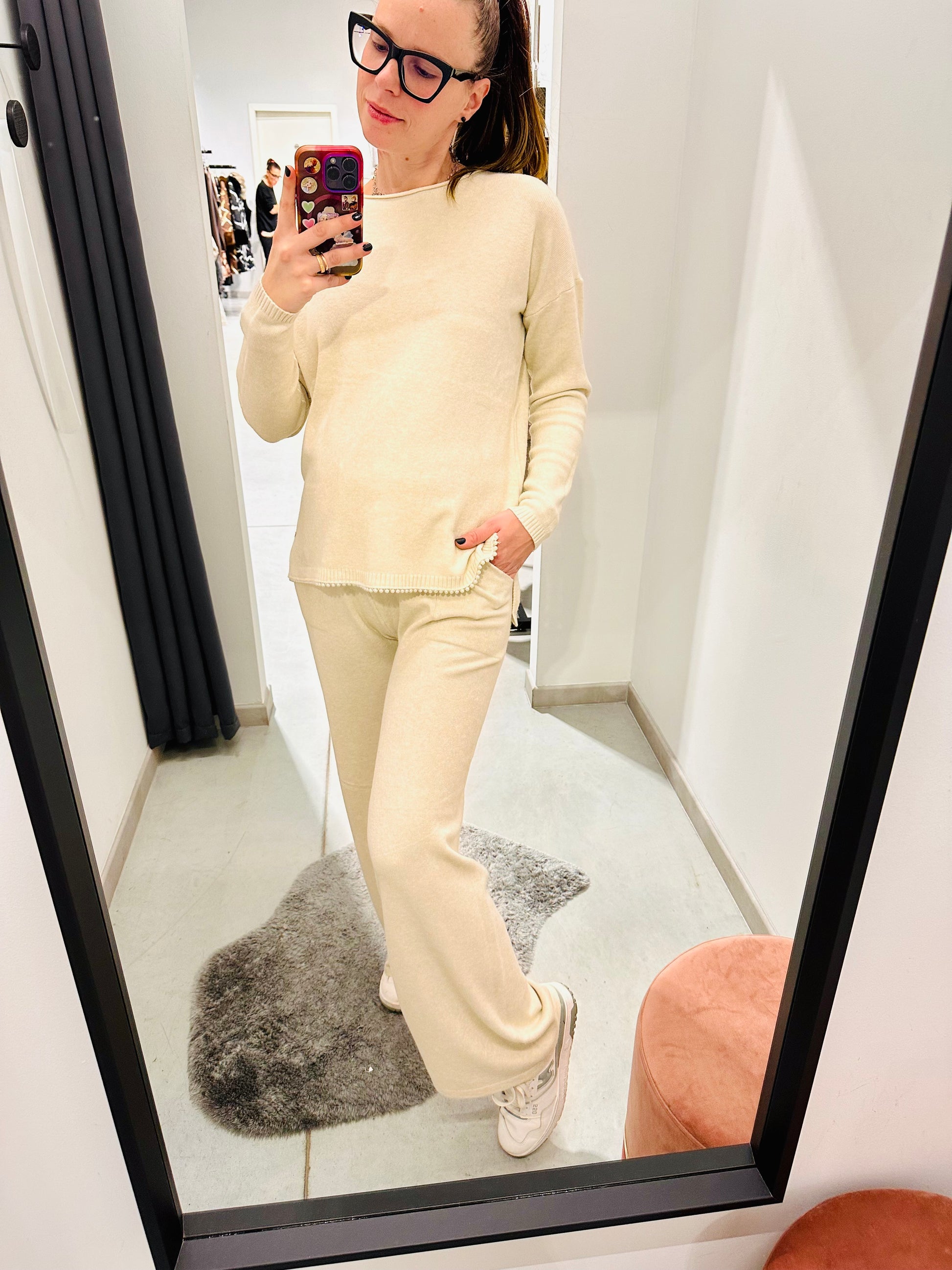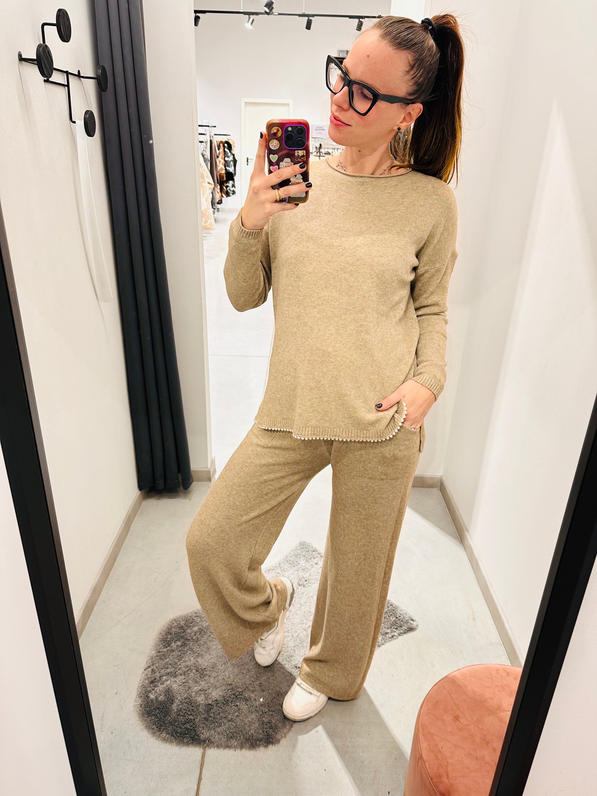 Completo tuta in calda viscosa. Maglia con spacchetti laterali e perline cucite. Pantaloni con coulisse e tasche. Vestibilità regolare
