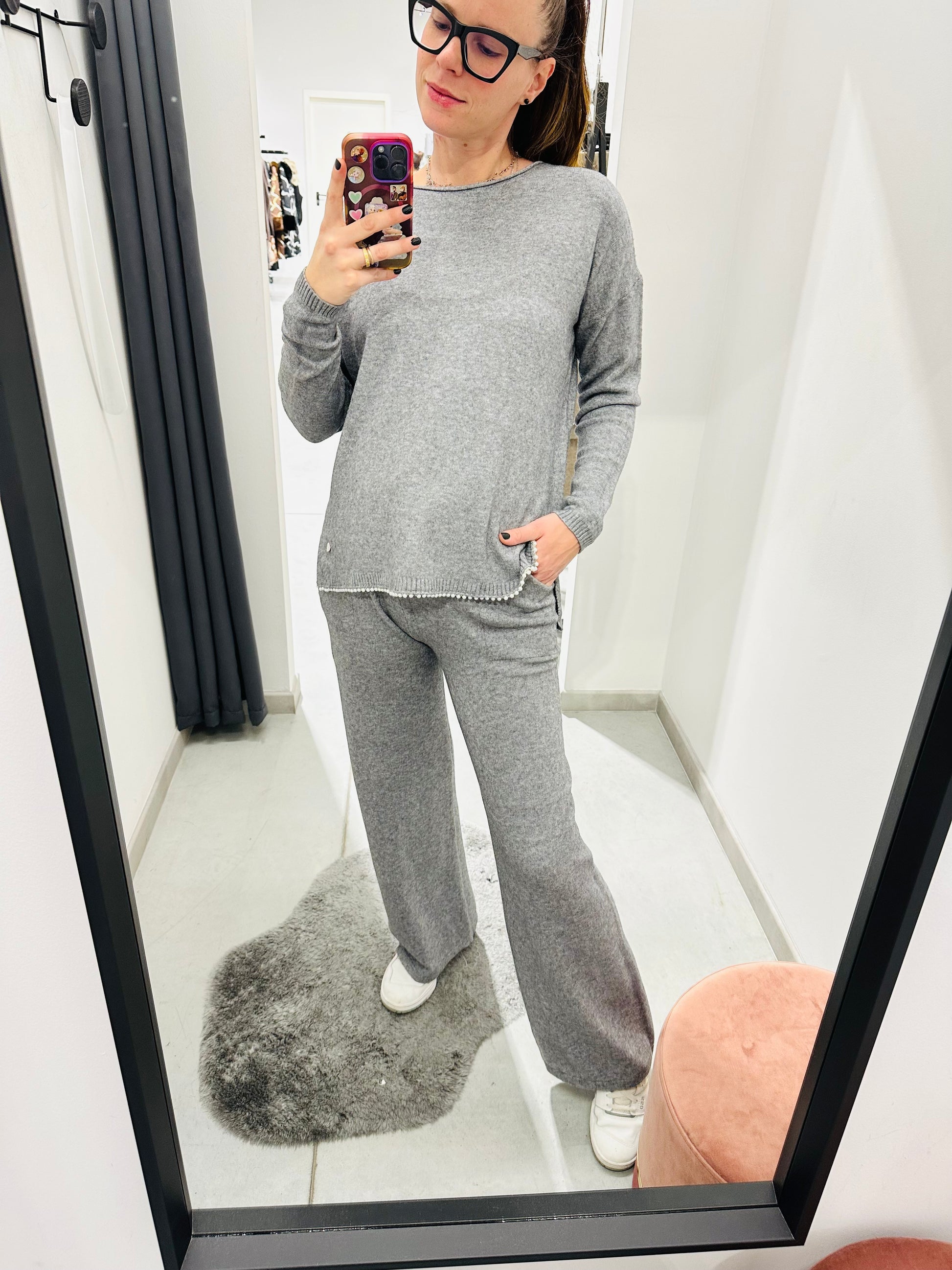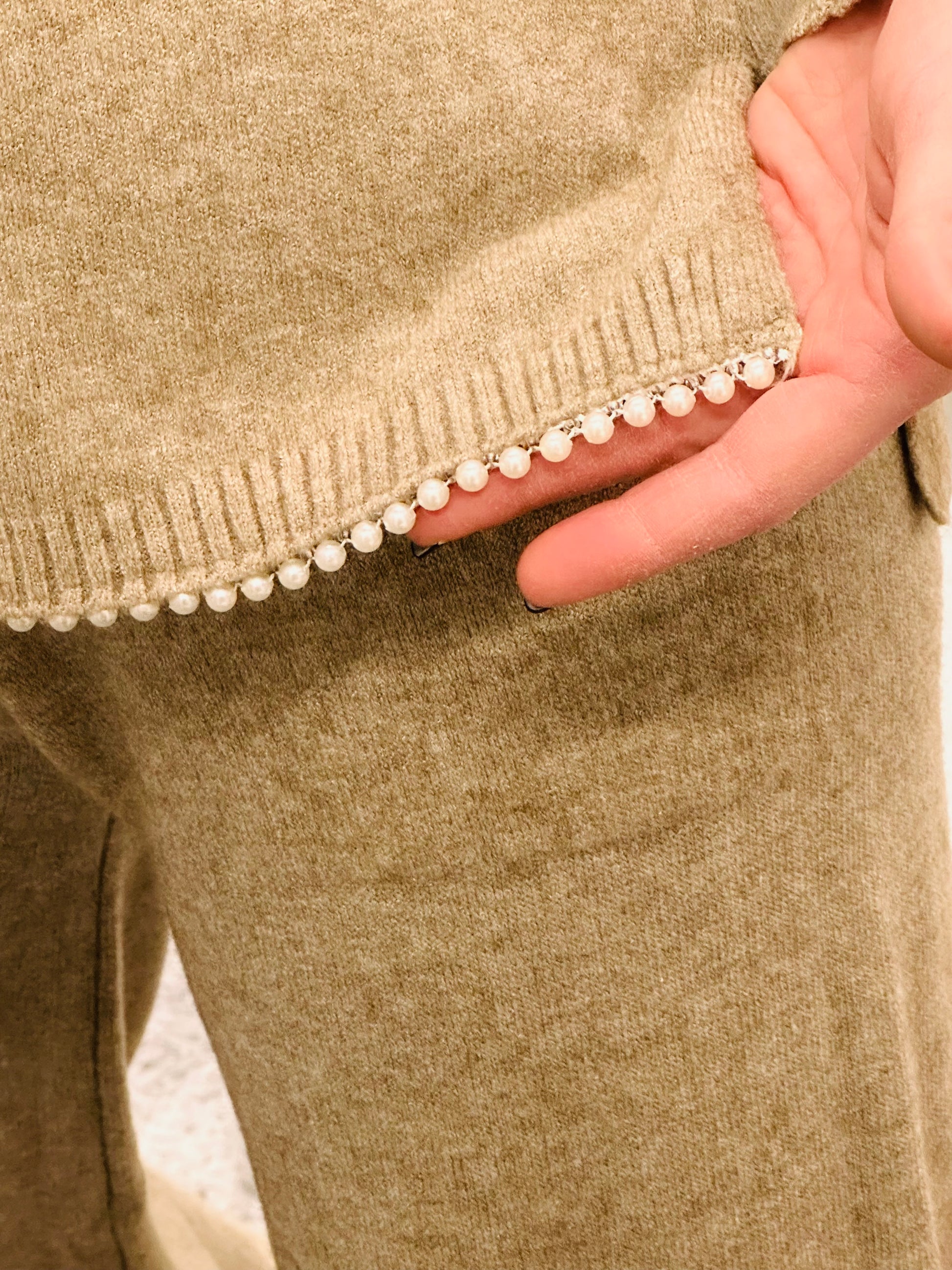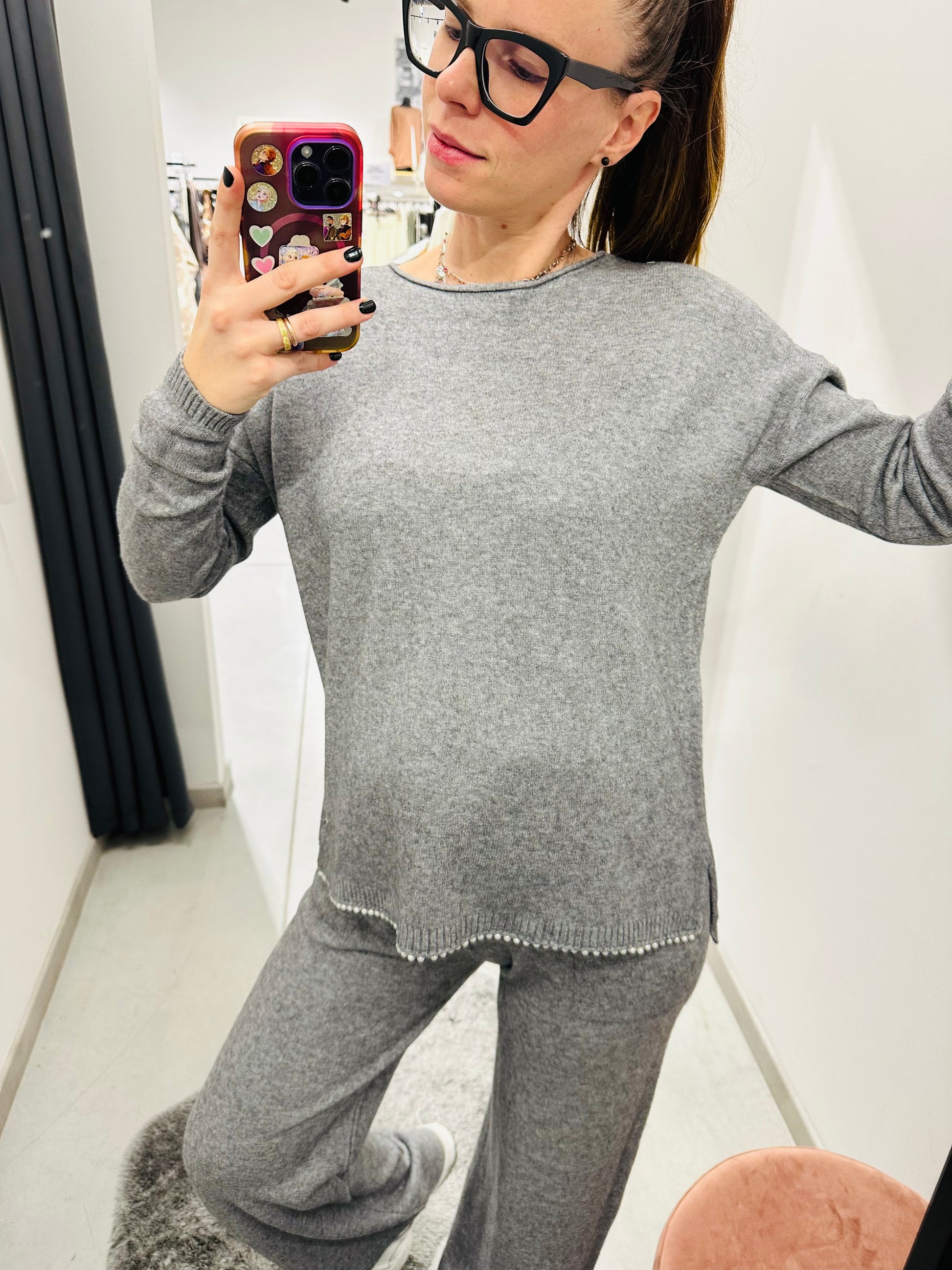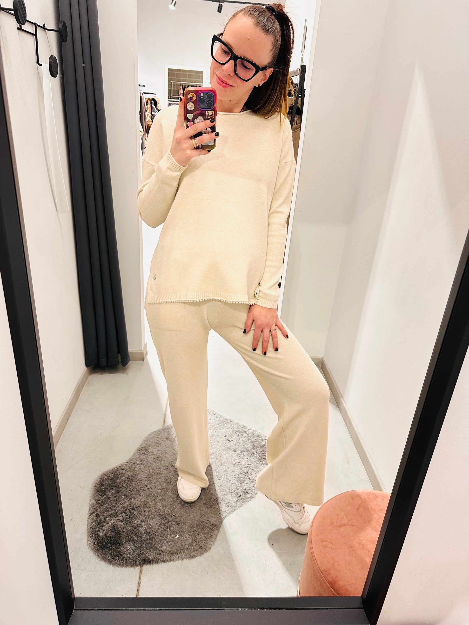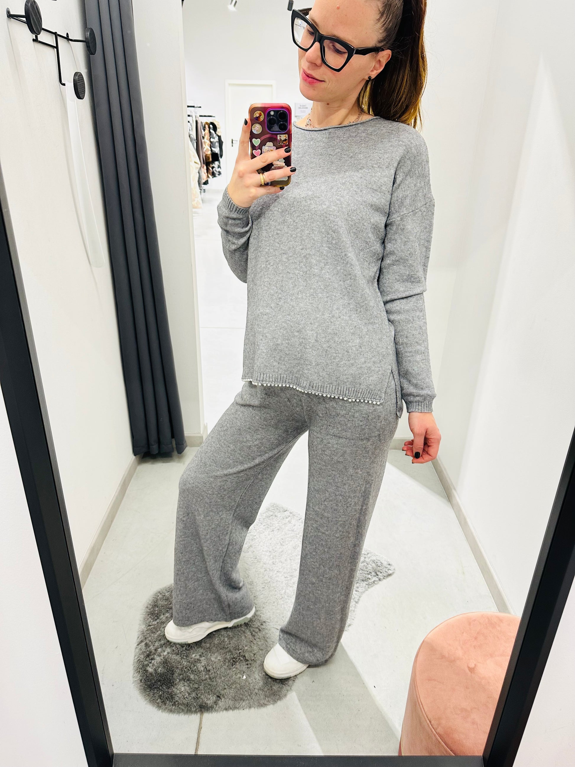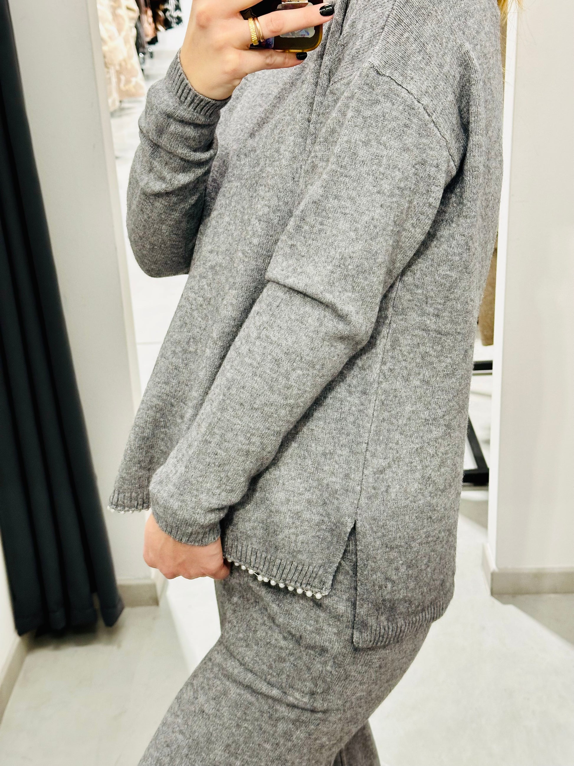 Completo tuta in calda viscosa. Maglia con spacchetti laterali e perline cucite. Pantaloni con coulisse e tasche. Vestibilità regolare