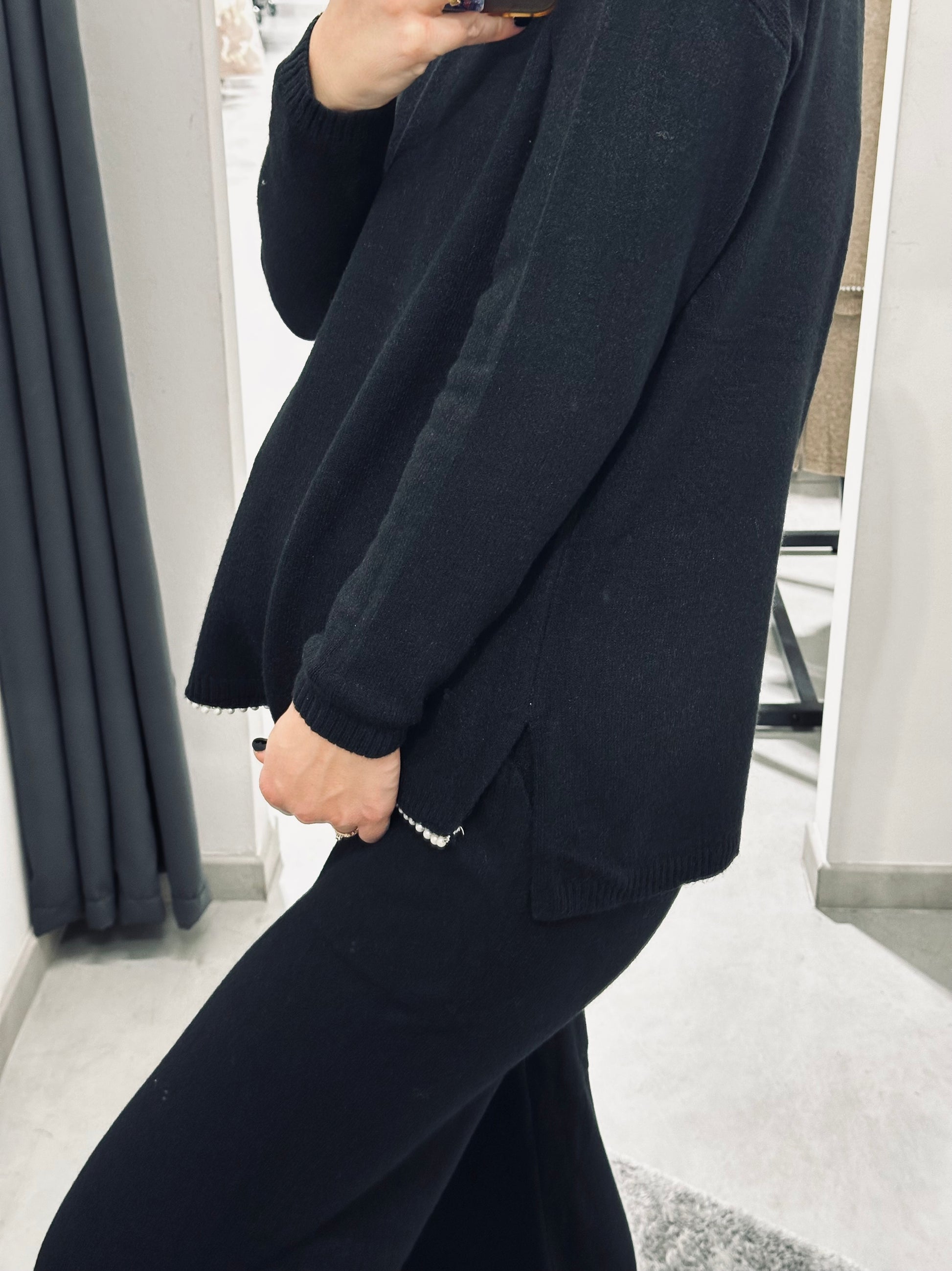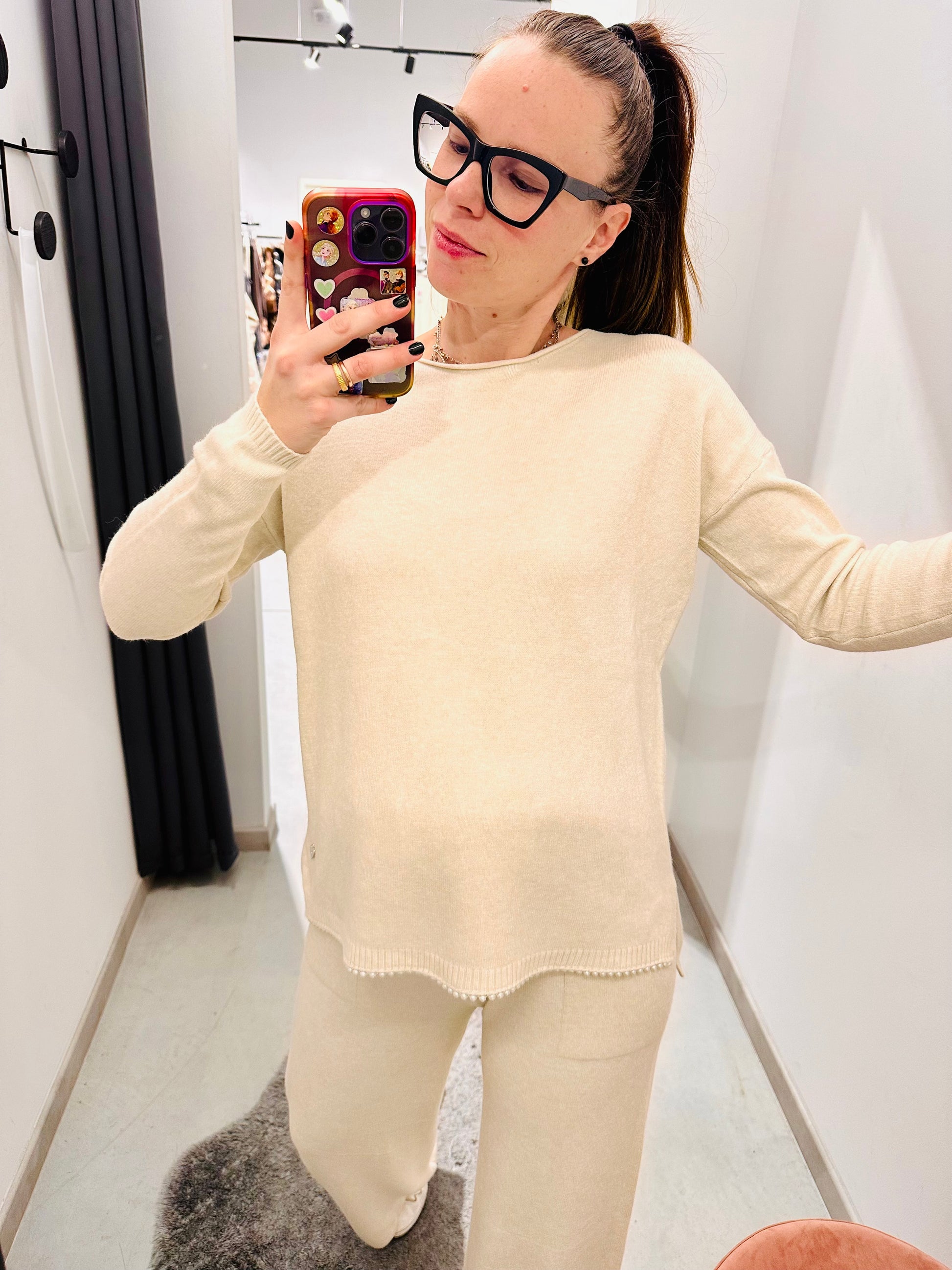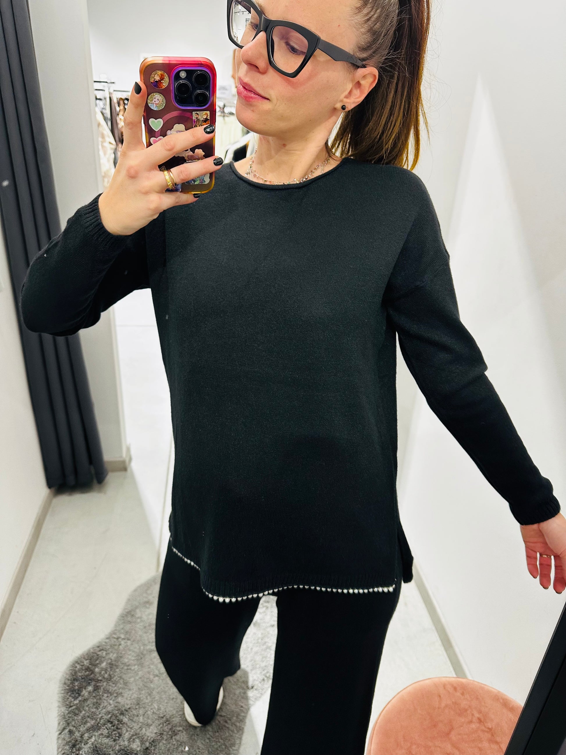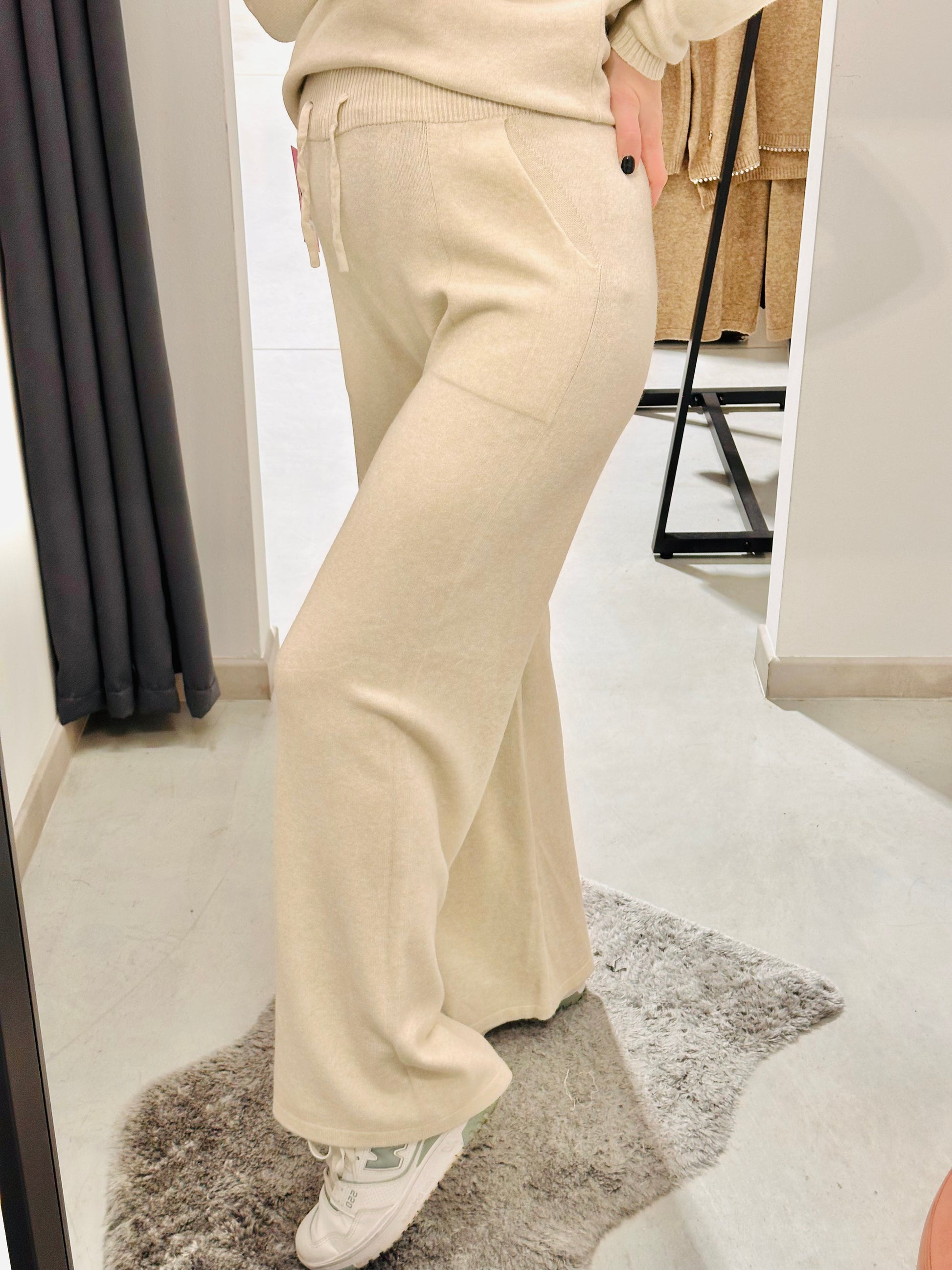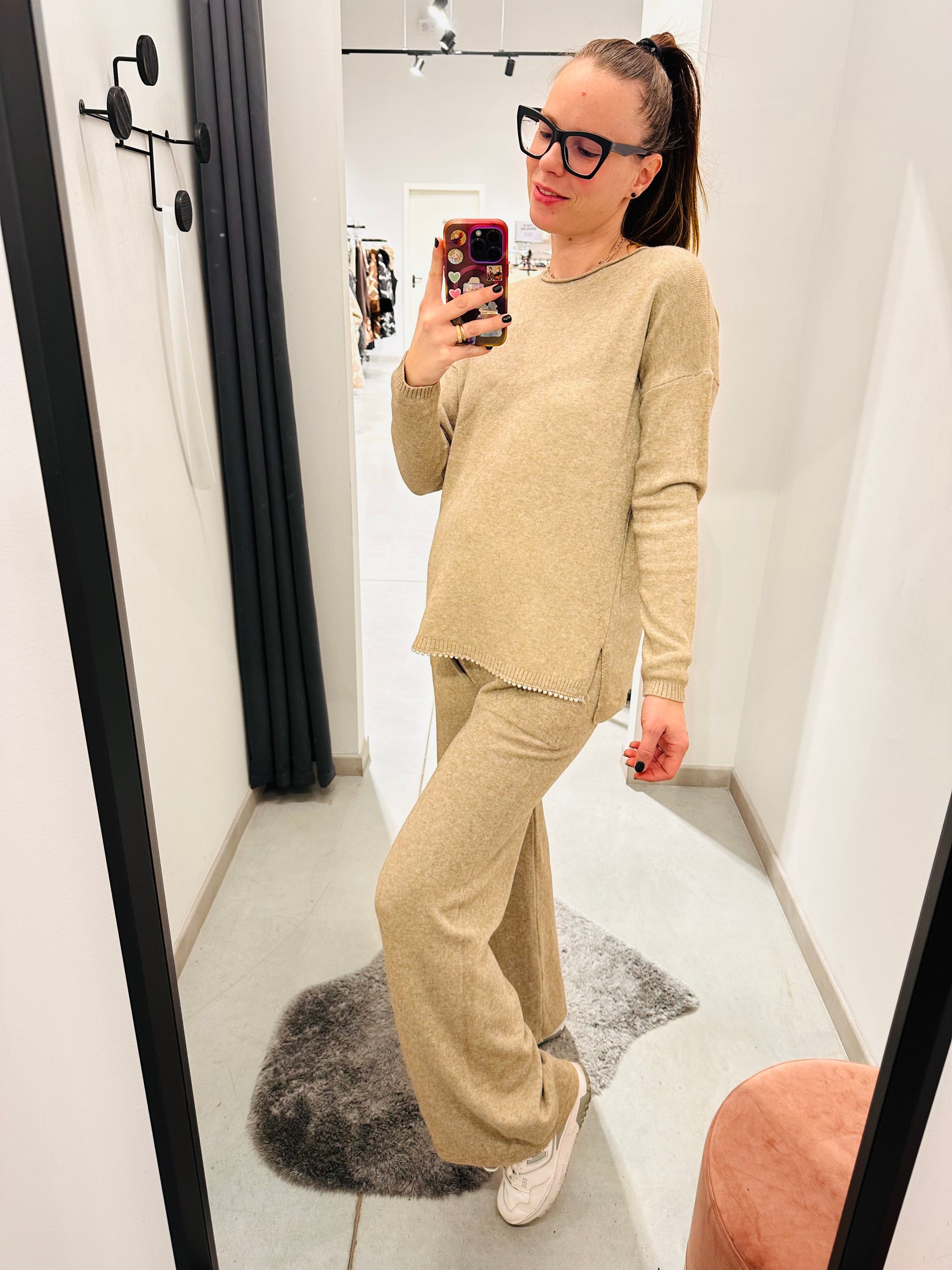 Completo tuta in calda viscosa. Maglia con spacchetti laterali e perline cucite. Pantaloni con coulisse e tasche. Vestibilità regolare
