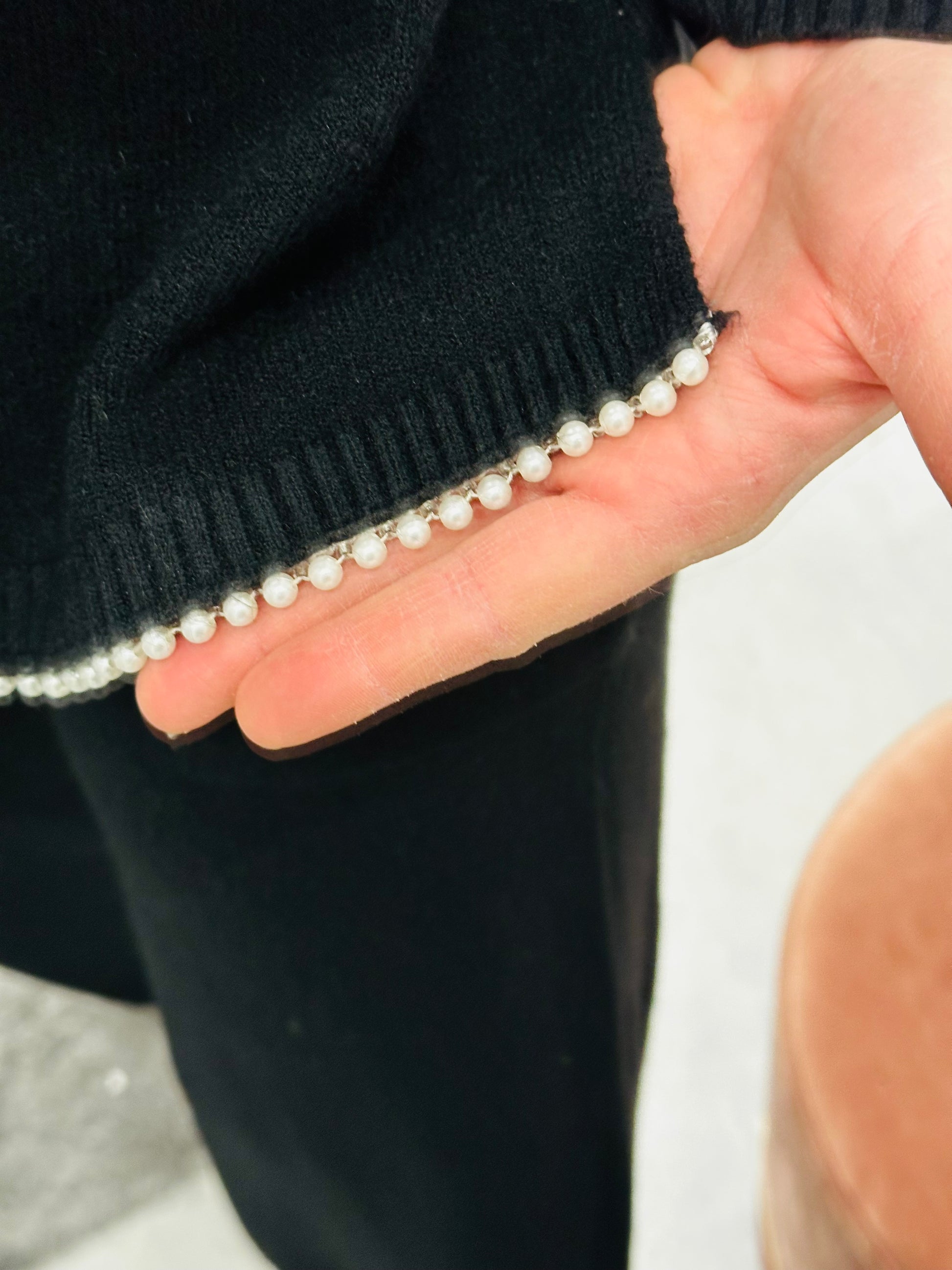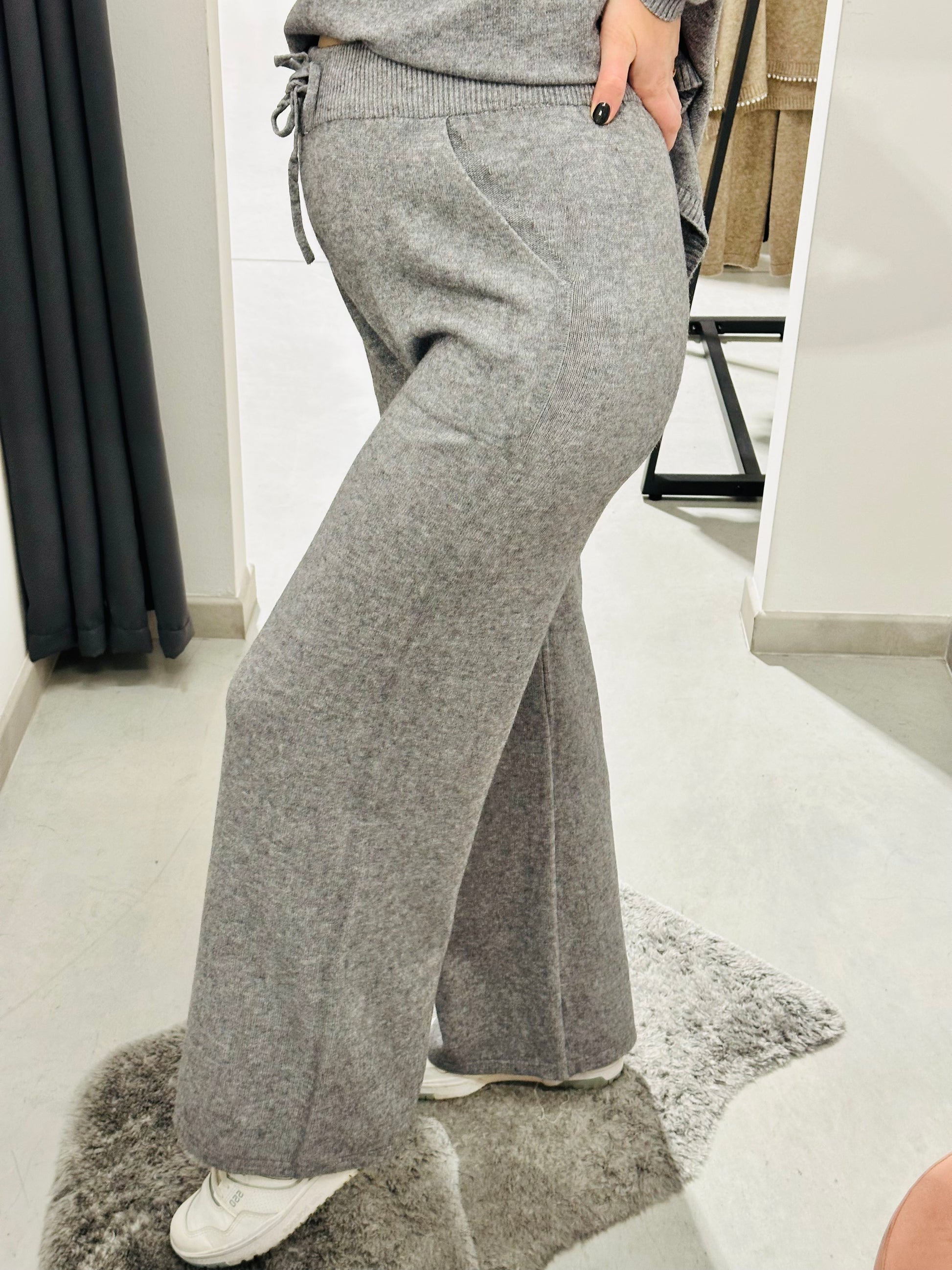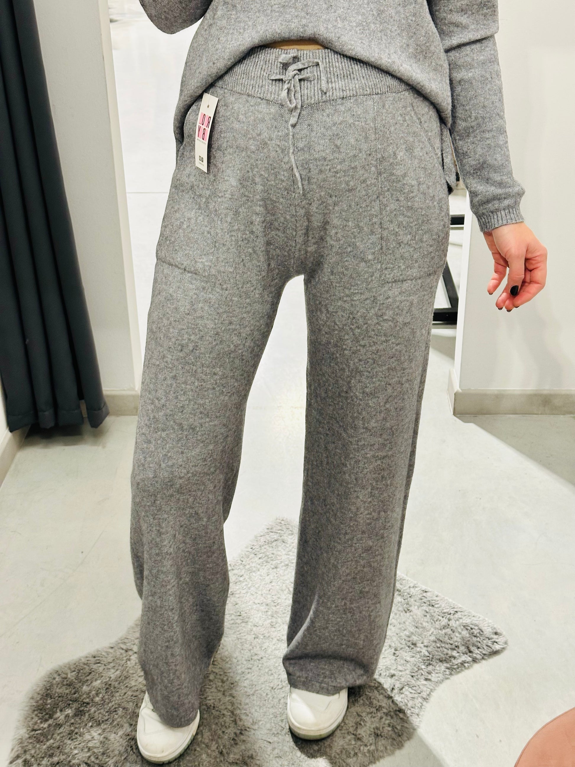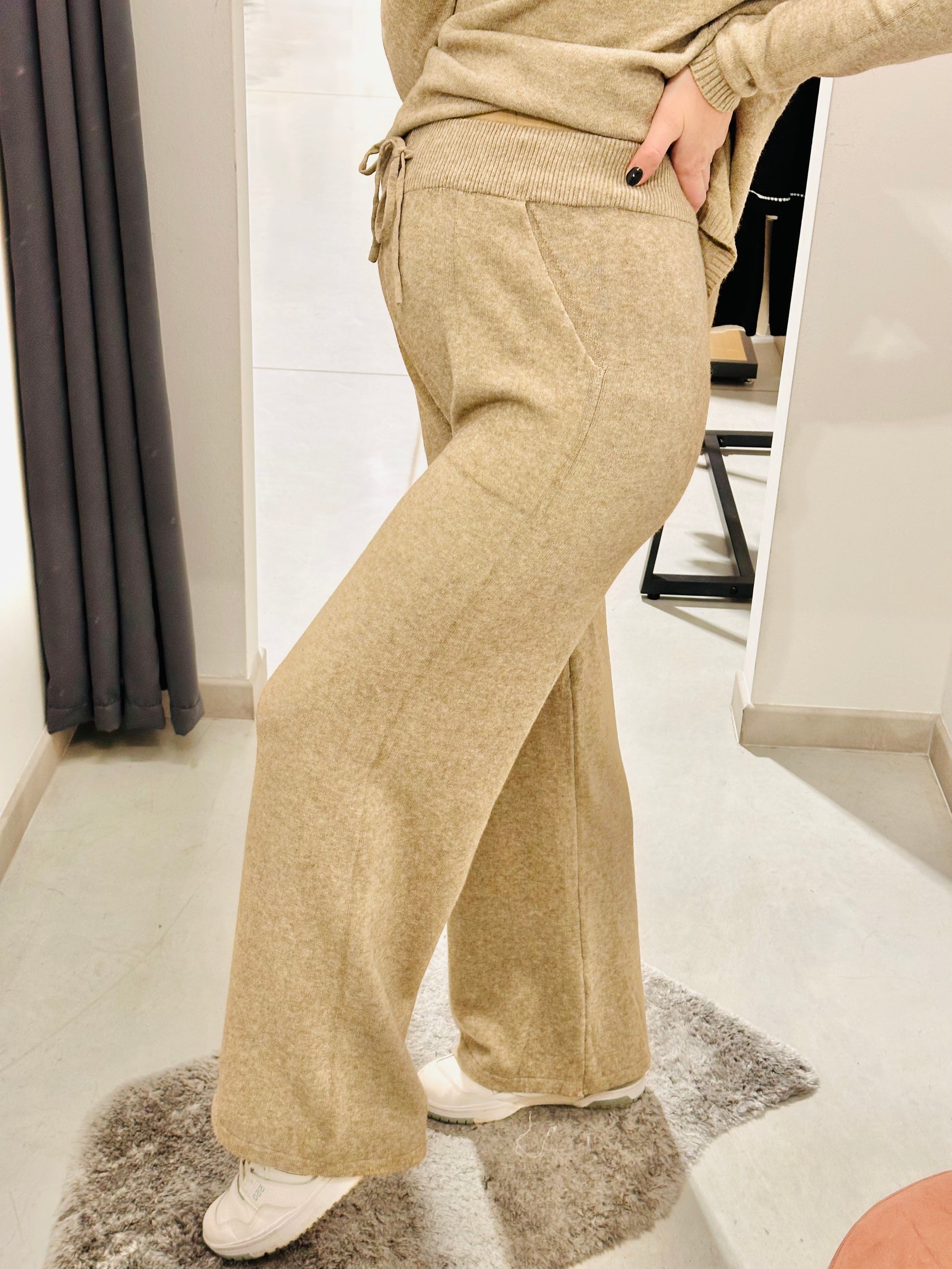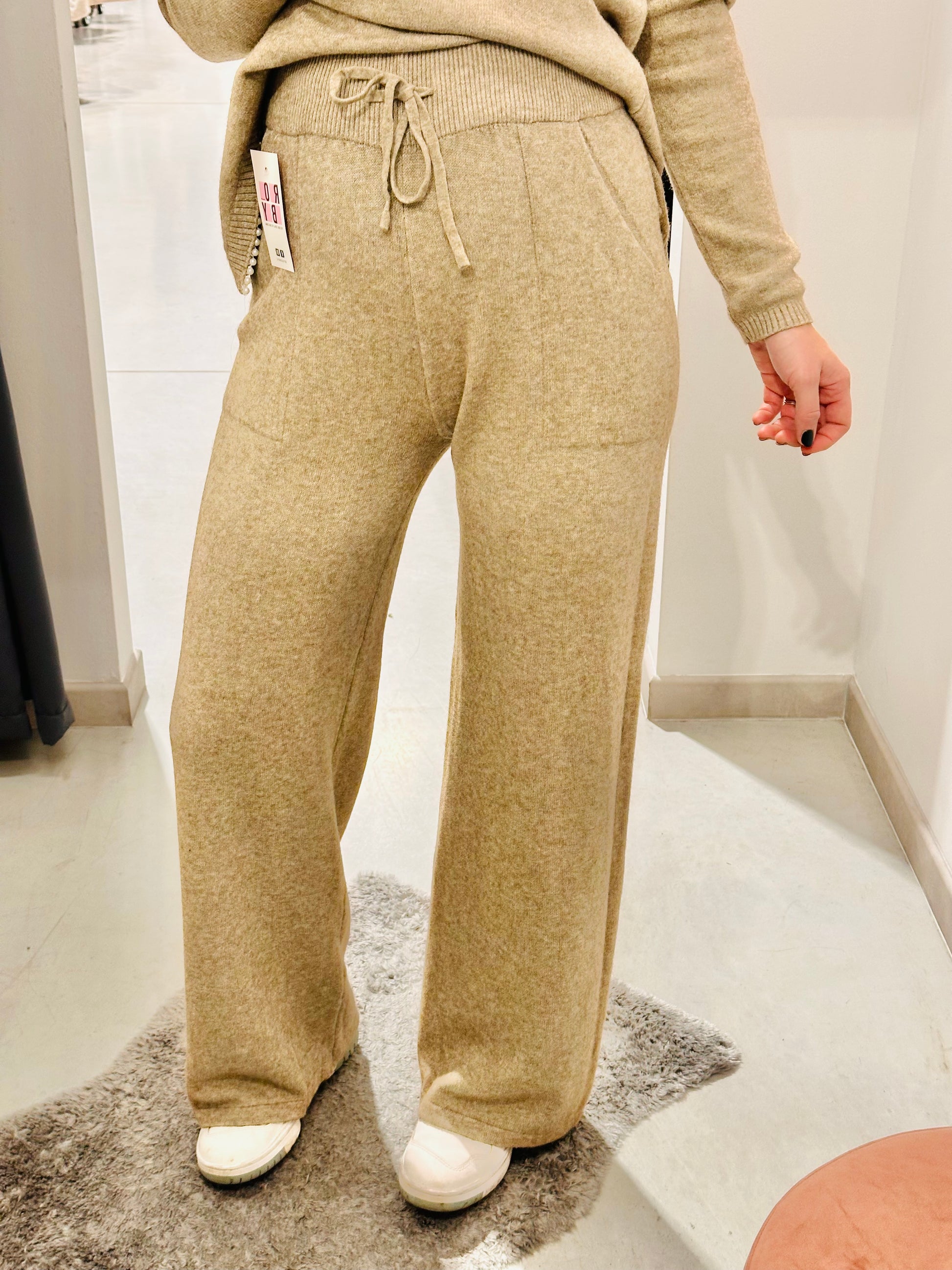 Completo tuta in calda viscosa. Maglia con spacchetti laterali e perline cucite. Pantaloni con coulisse e tasche. Vestibilità regolare