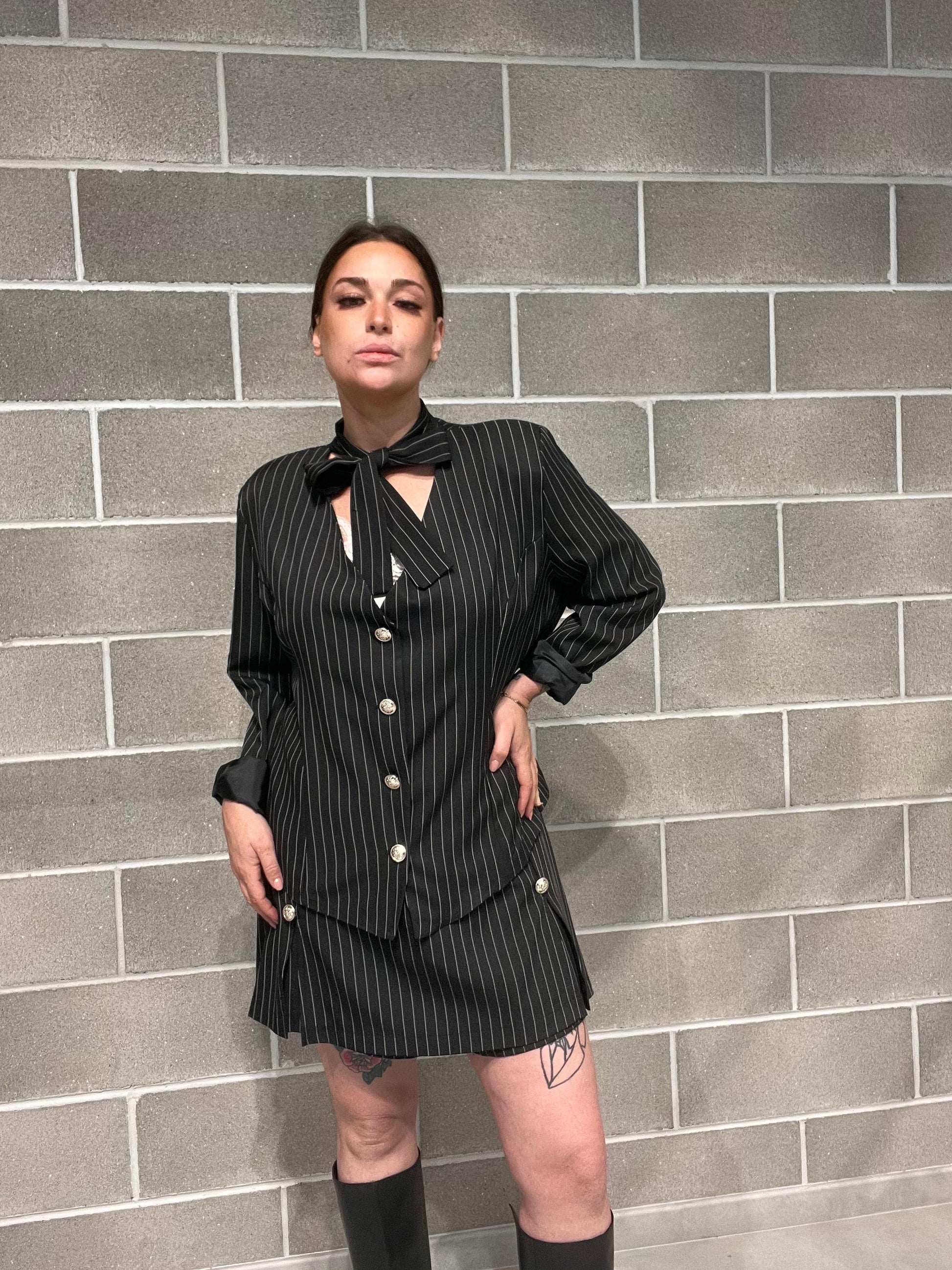 Completo composto da giacca foderata, scollatura a V e asola. Gonna pantalone a vita medio alta elasticizzata. Vestibilità regolare