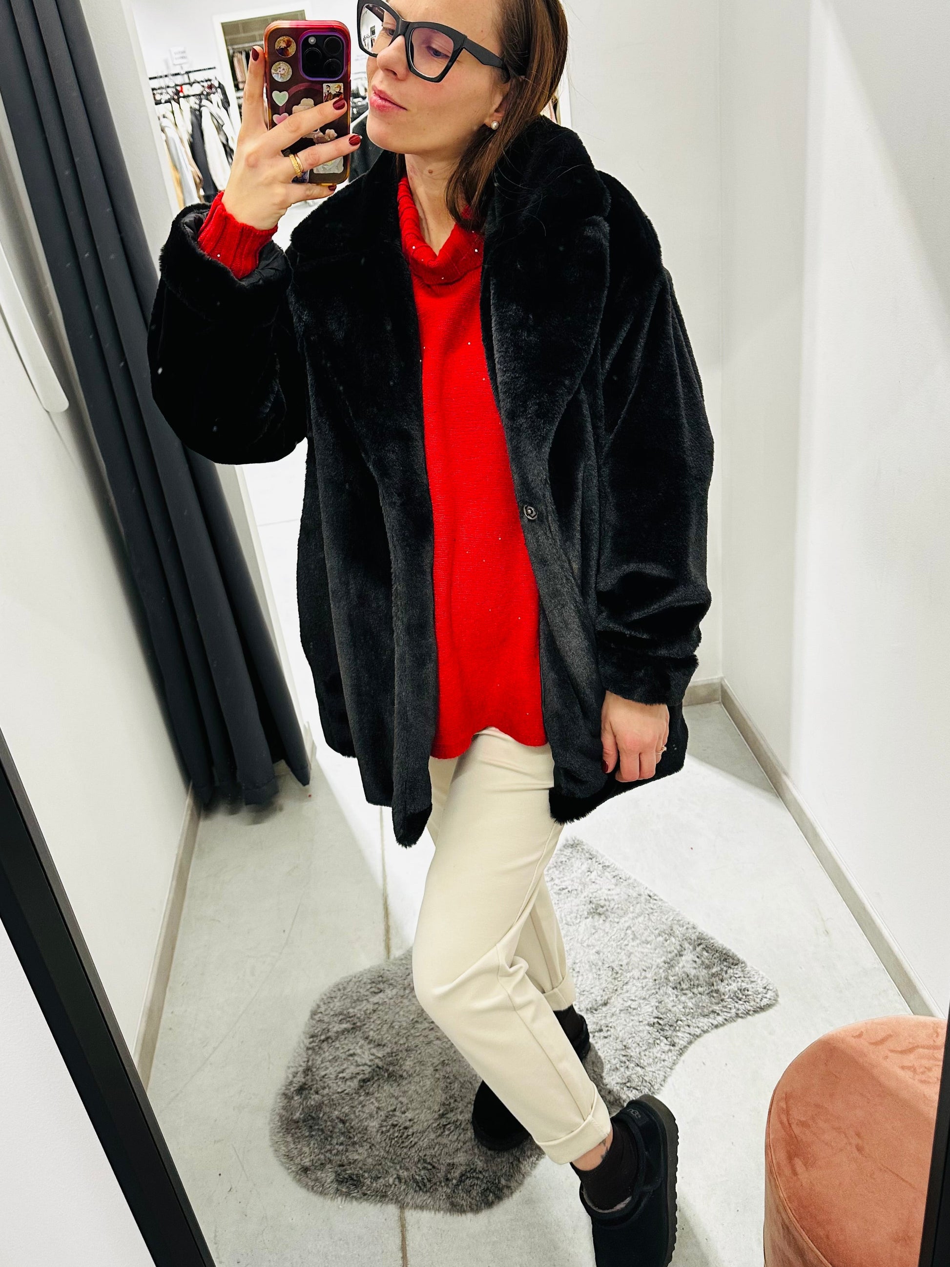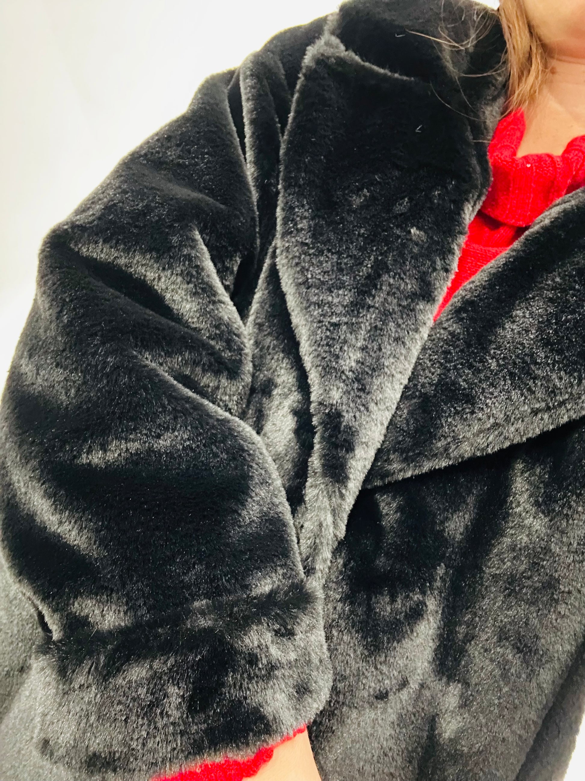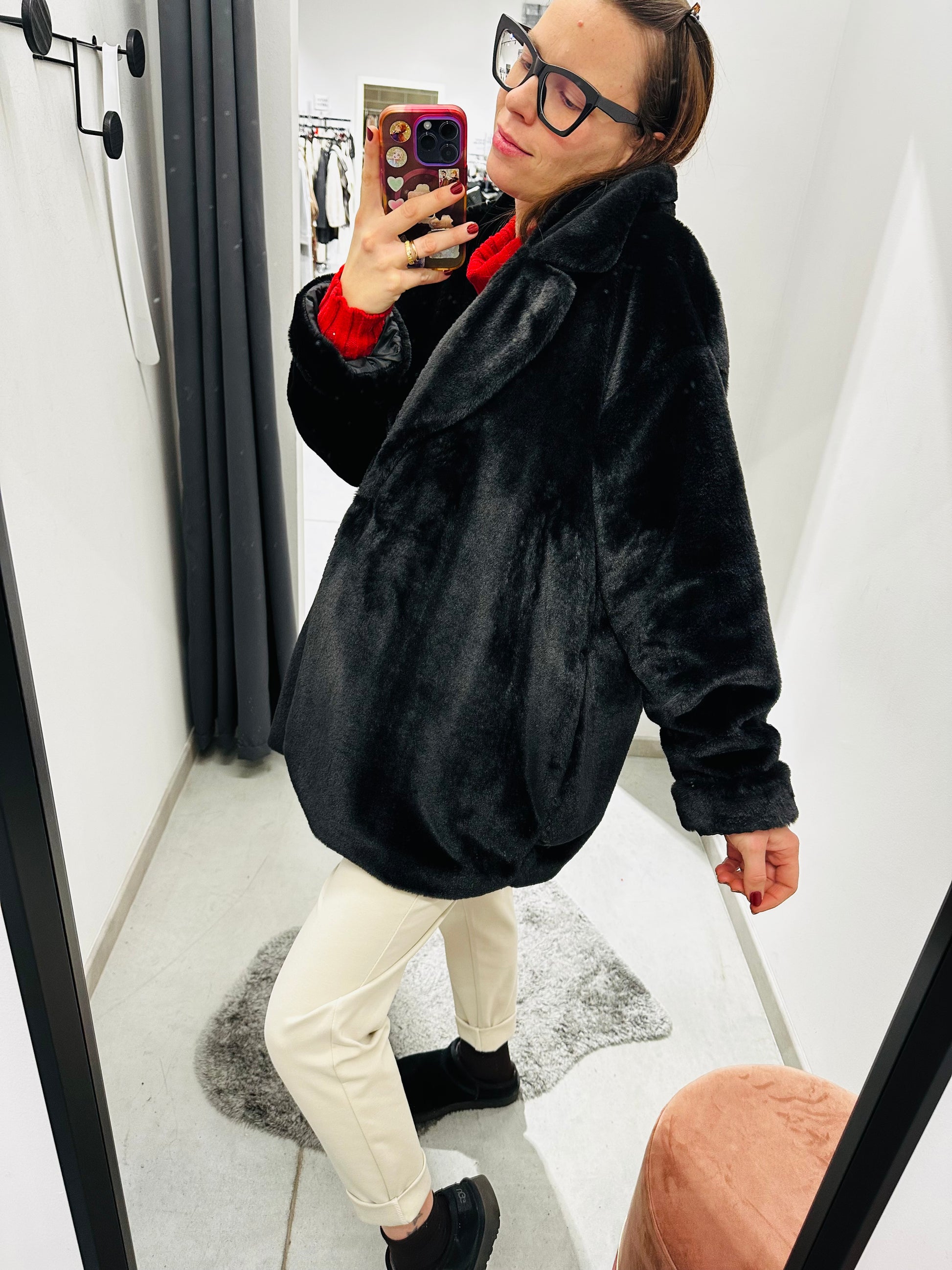 Eco pelliccia a forma di giacca, chiusura con bottone a clip e con tasche. Vestibilità regolare