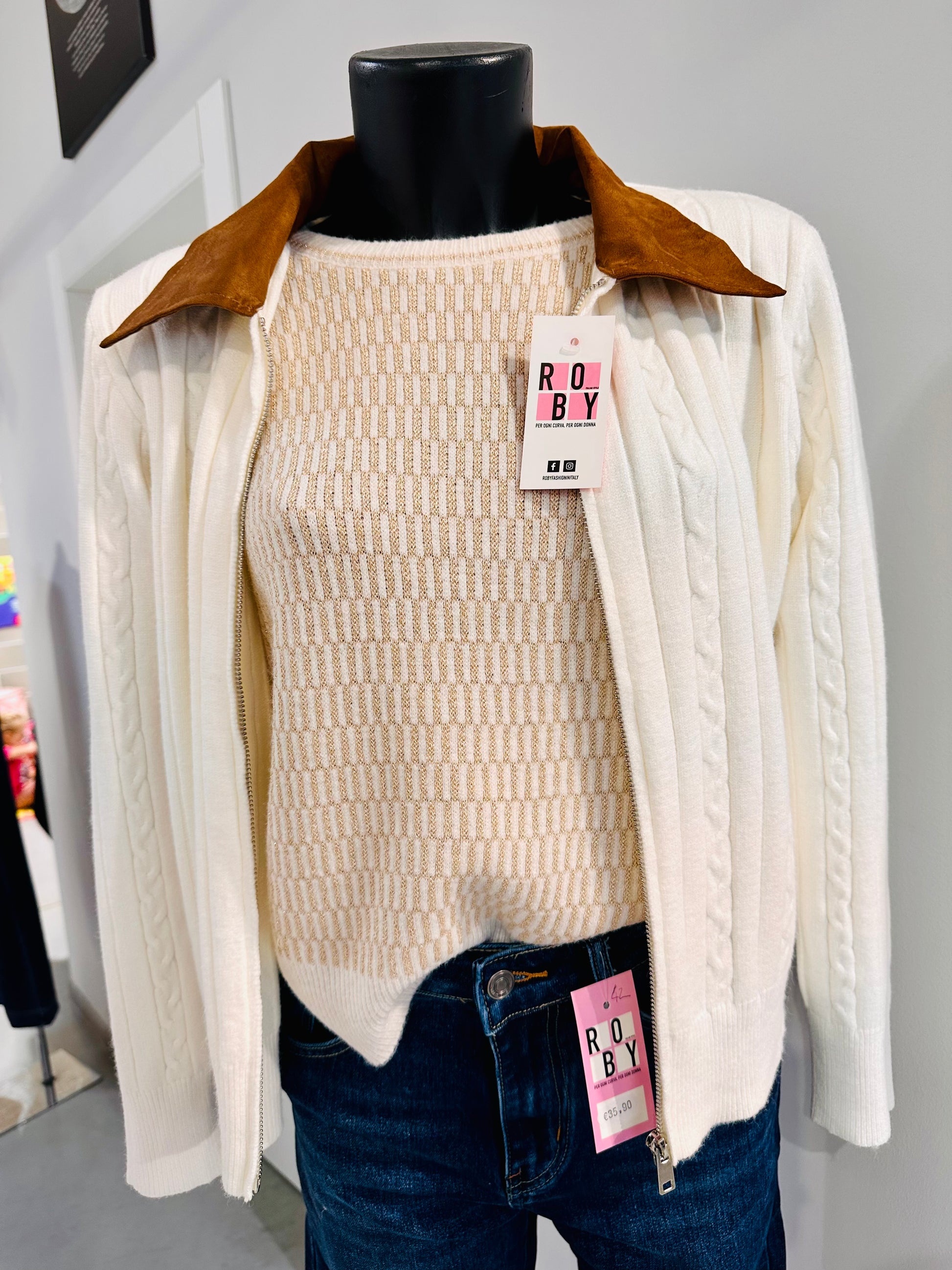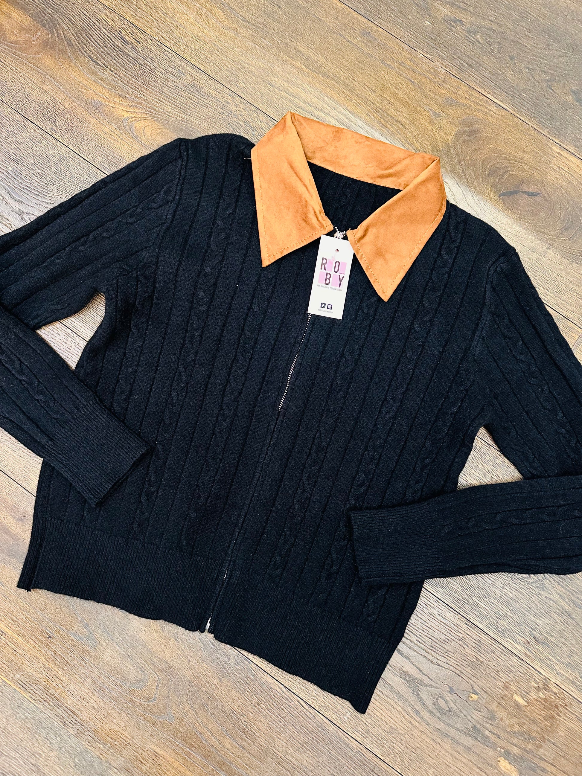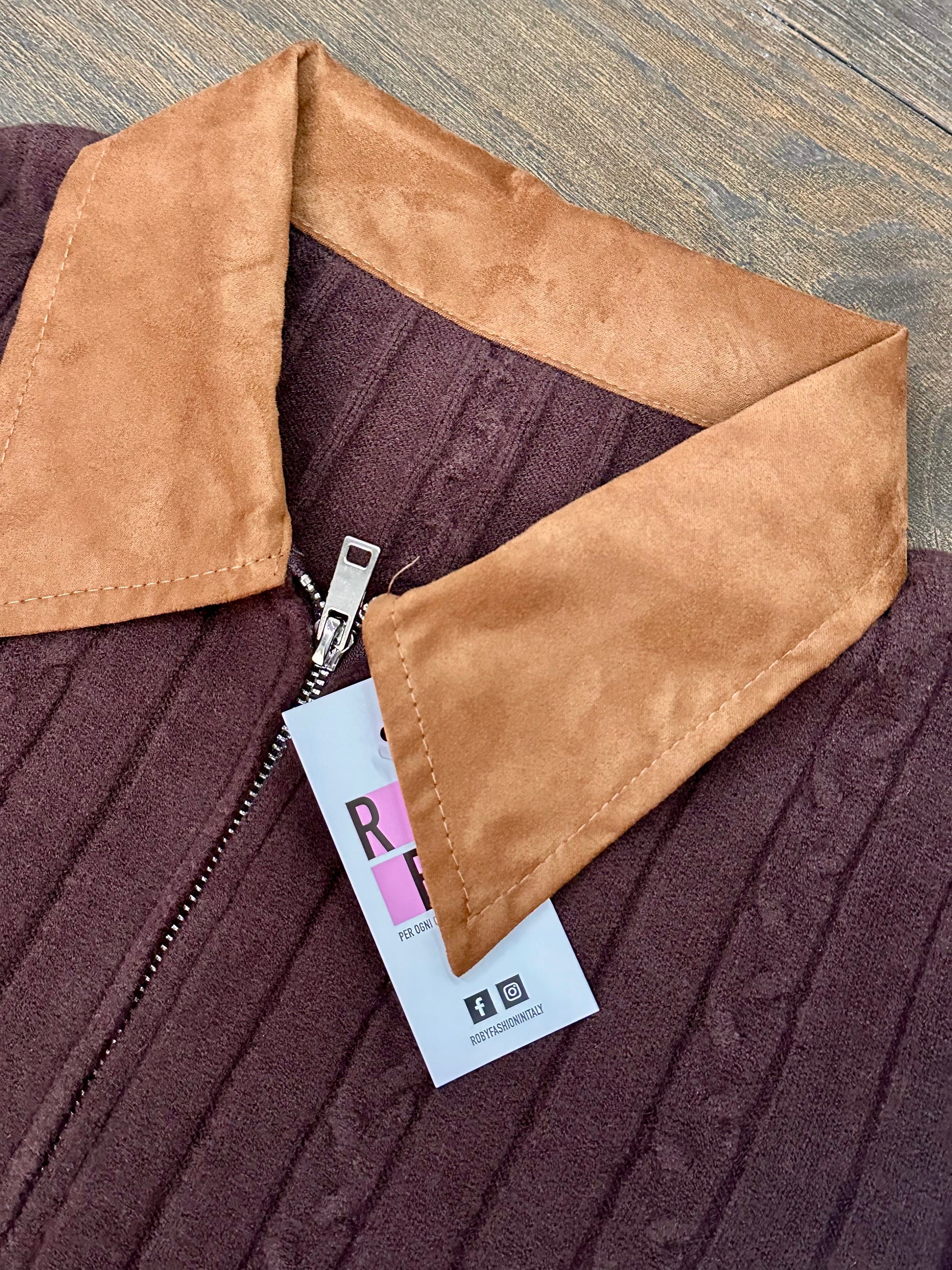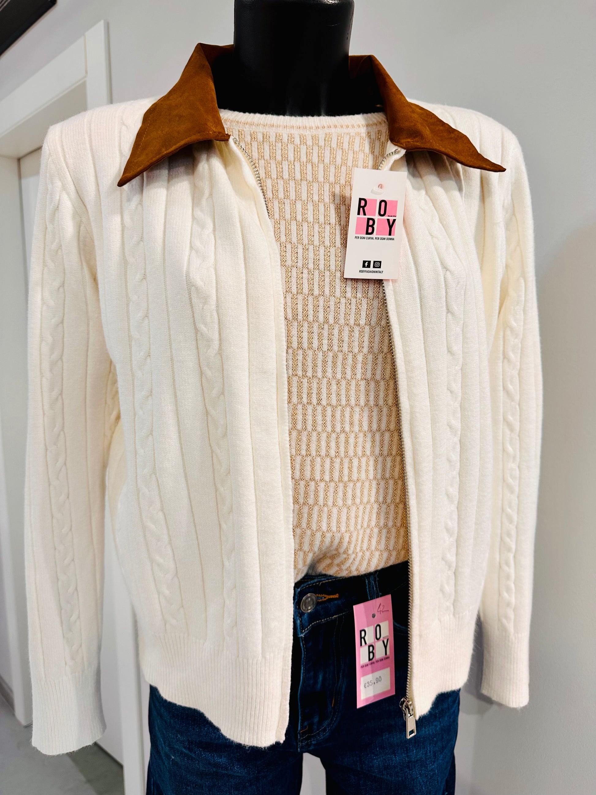 Giacchino in calda viscosa con lavorazione intrecciata. Colletto scamosciato, vestibilità regolare