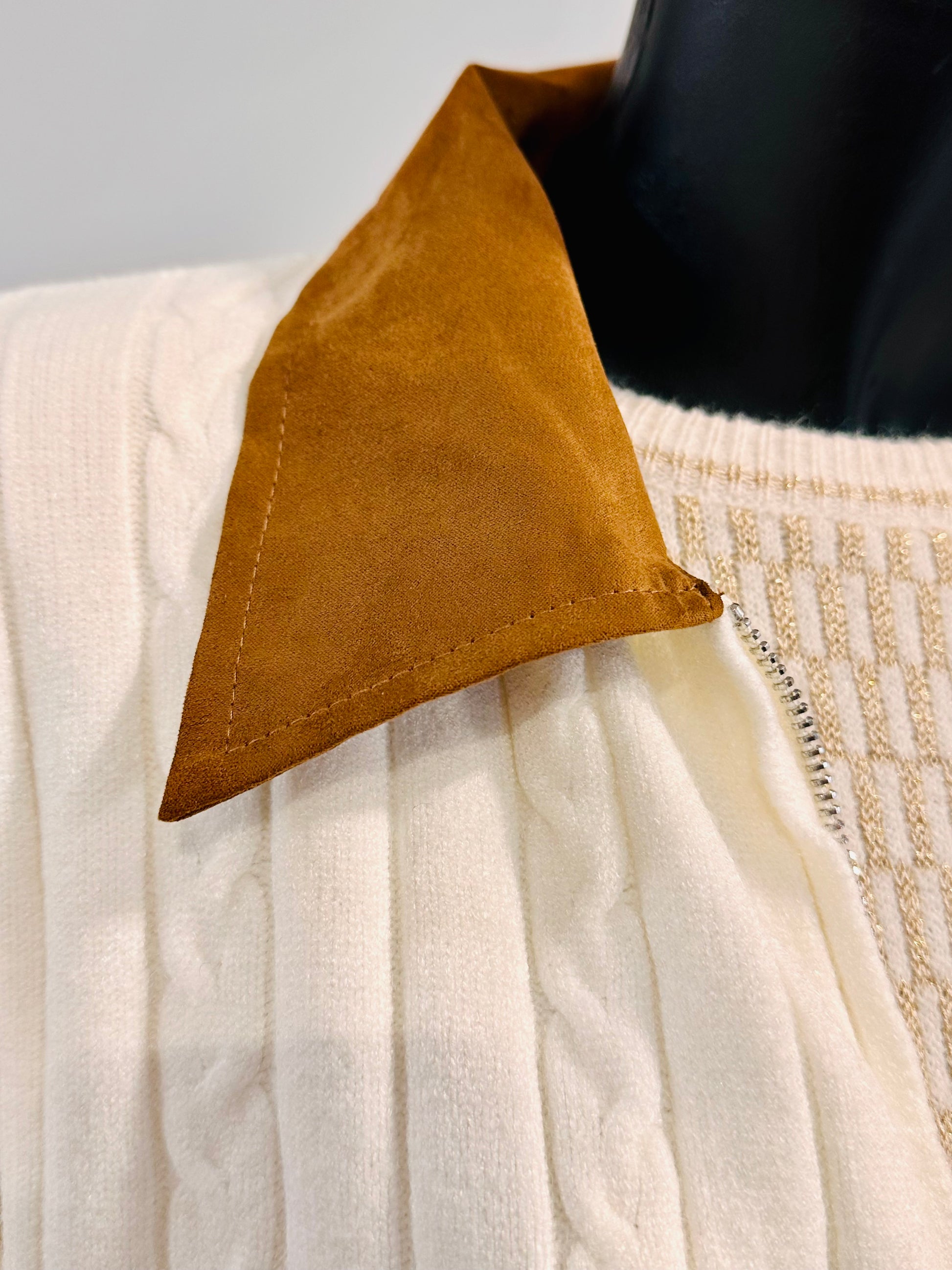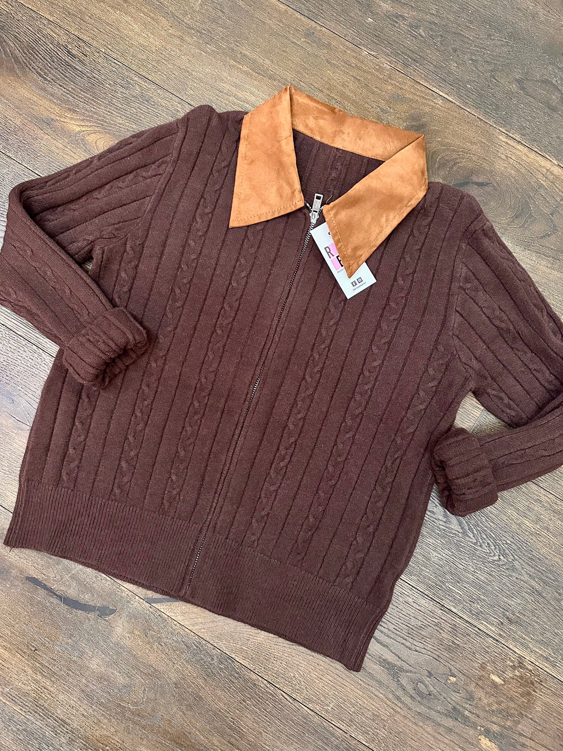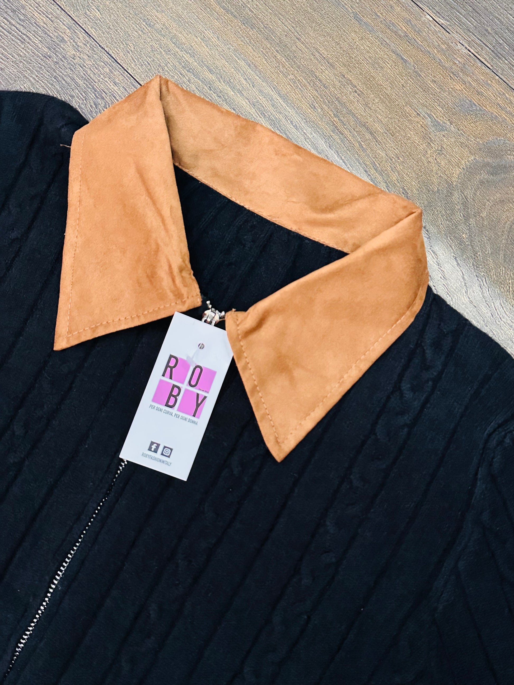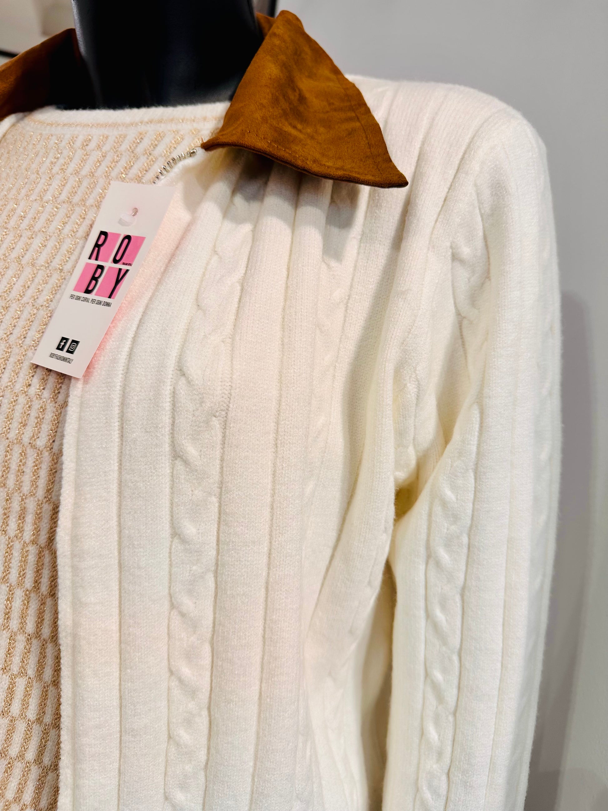 Giacchino in calda viscosa con lavorazione intrecciata. Colletto scamosciato, vestibilità regolare
