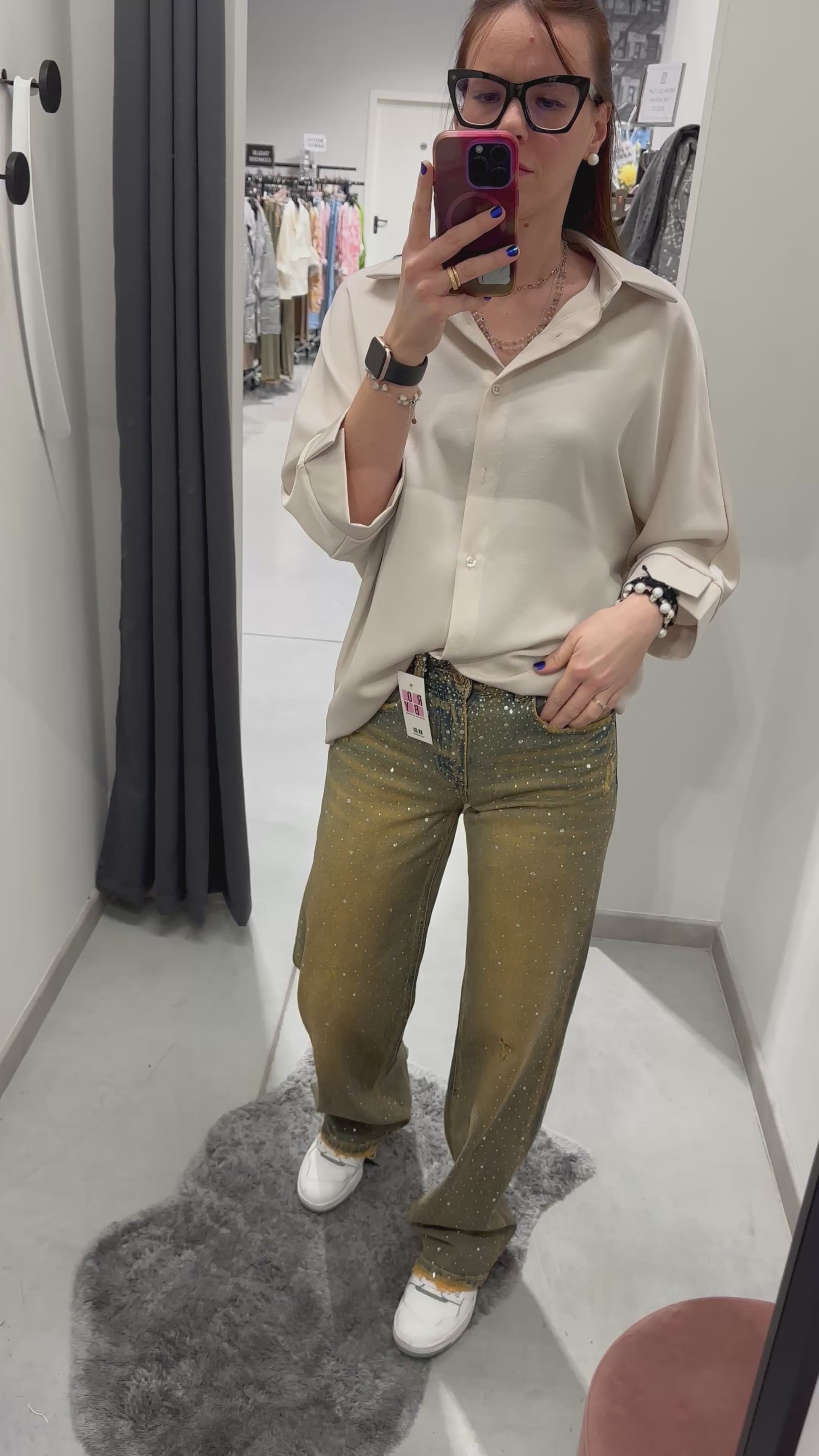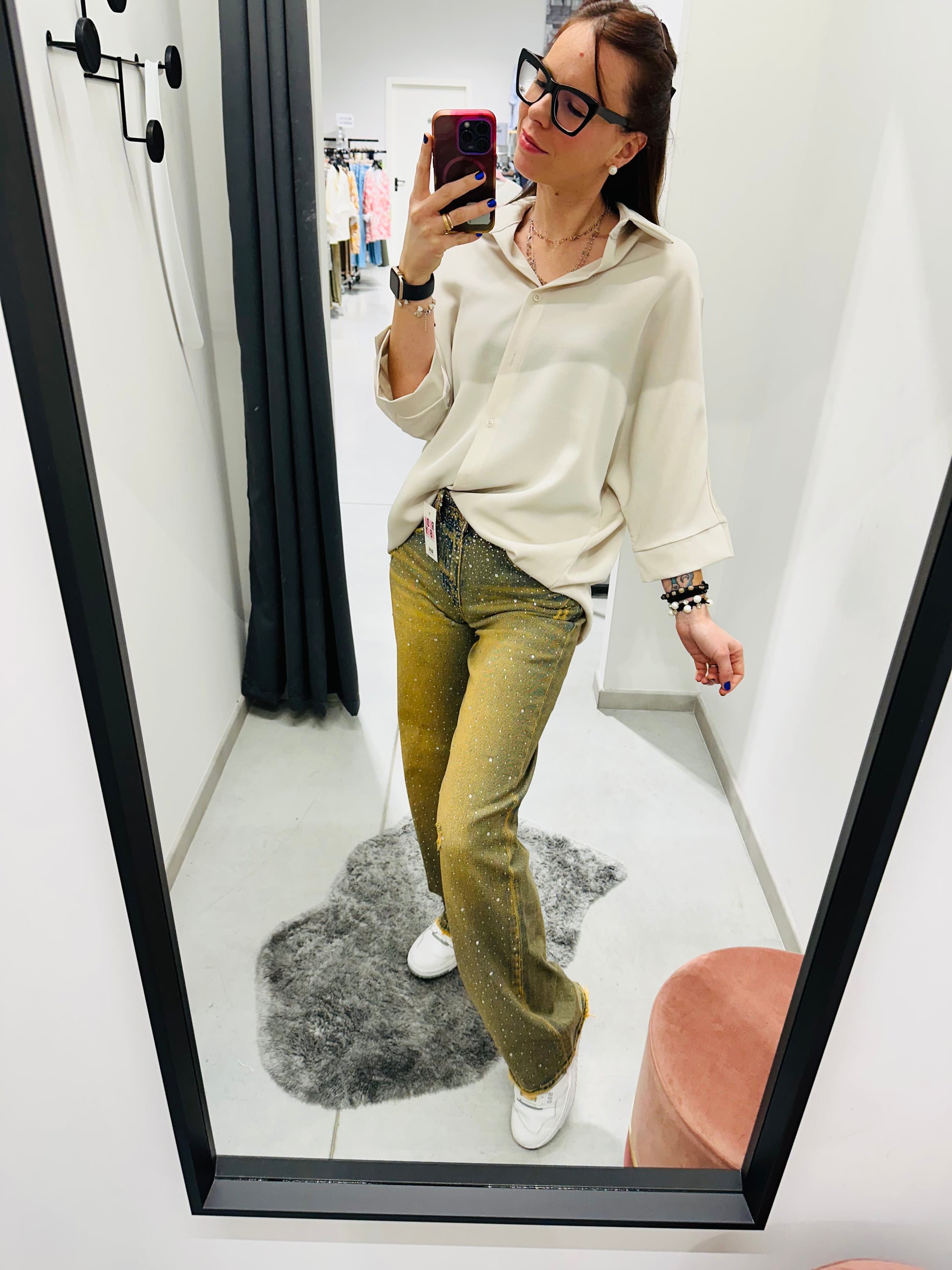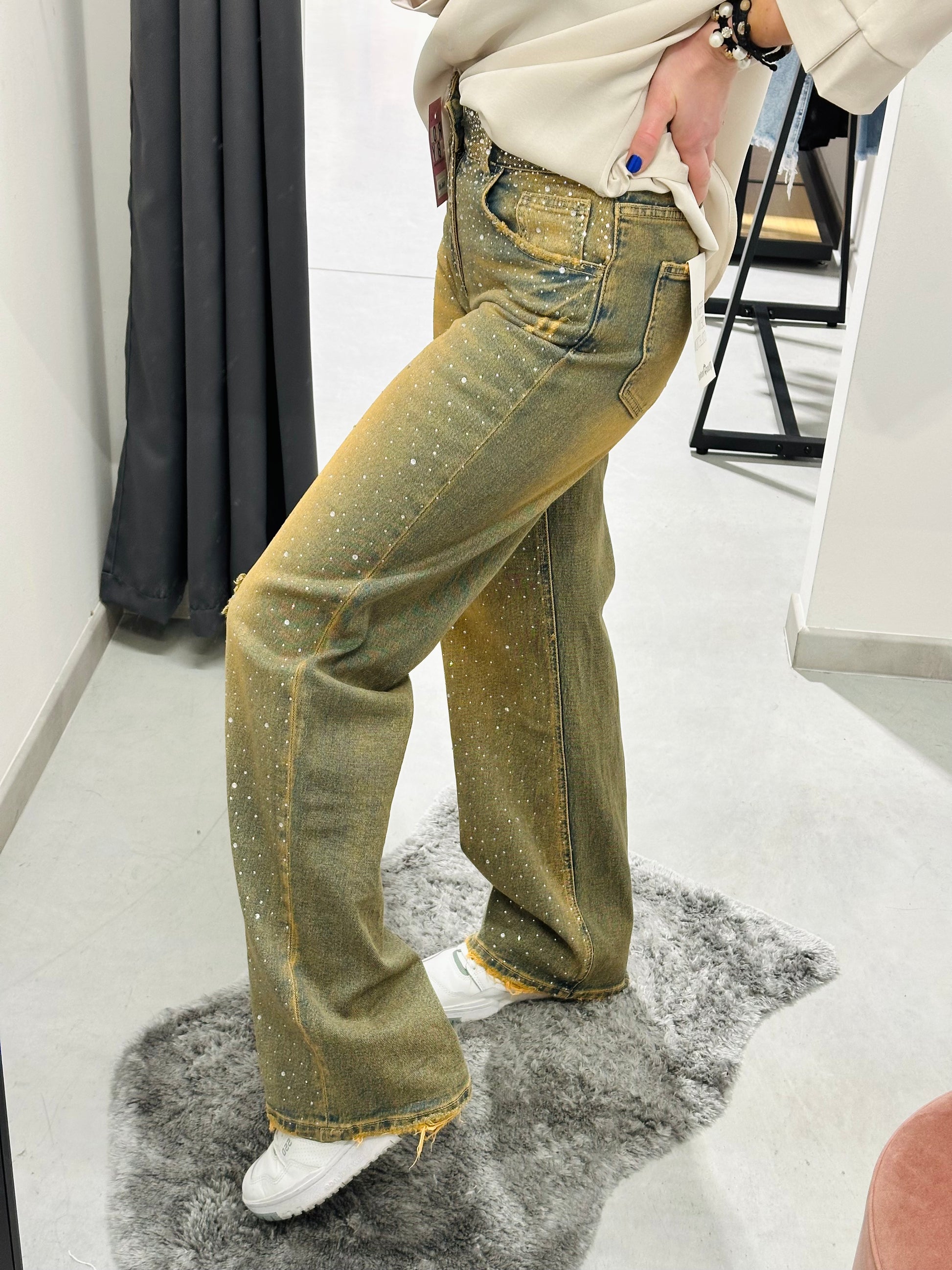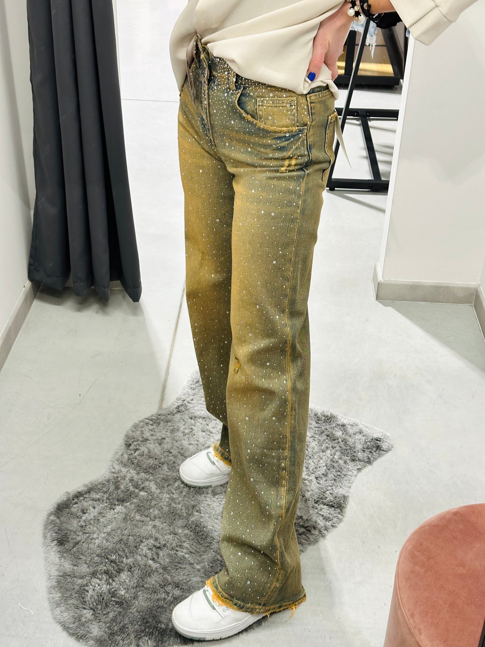 Jeans a vita medio alta con brillantini applicati. Vestibilità regolare, NON elasticizzati.