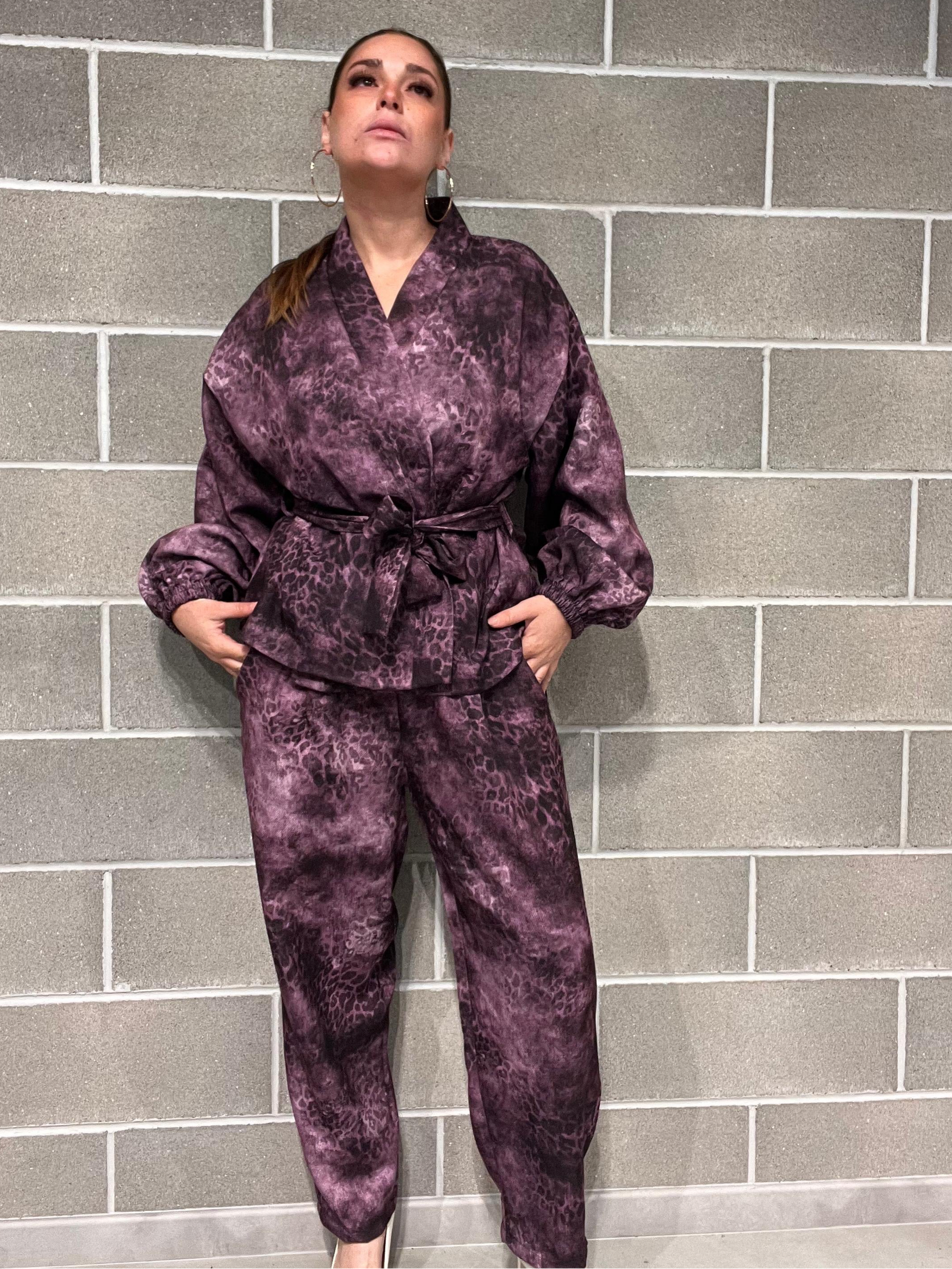 Kimono in cotone con fantasia animalier, elastico sui polsi. Vestibilità oversize