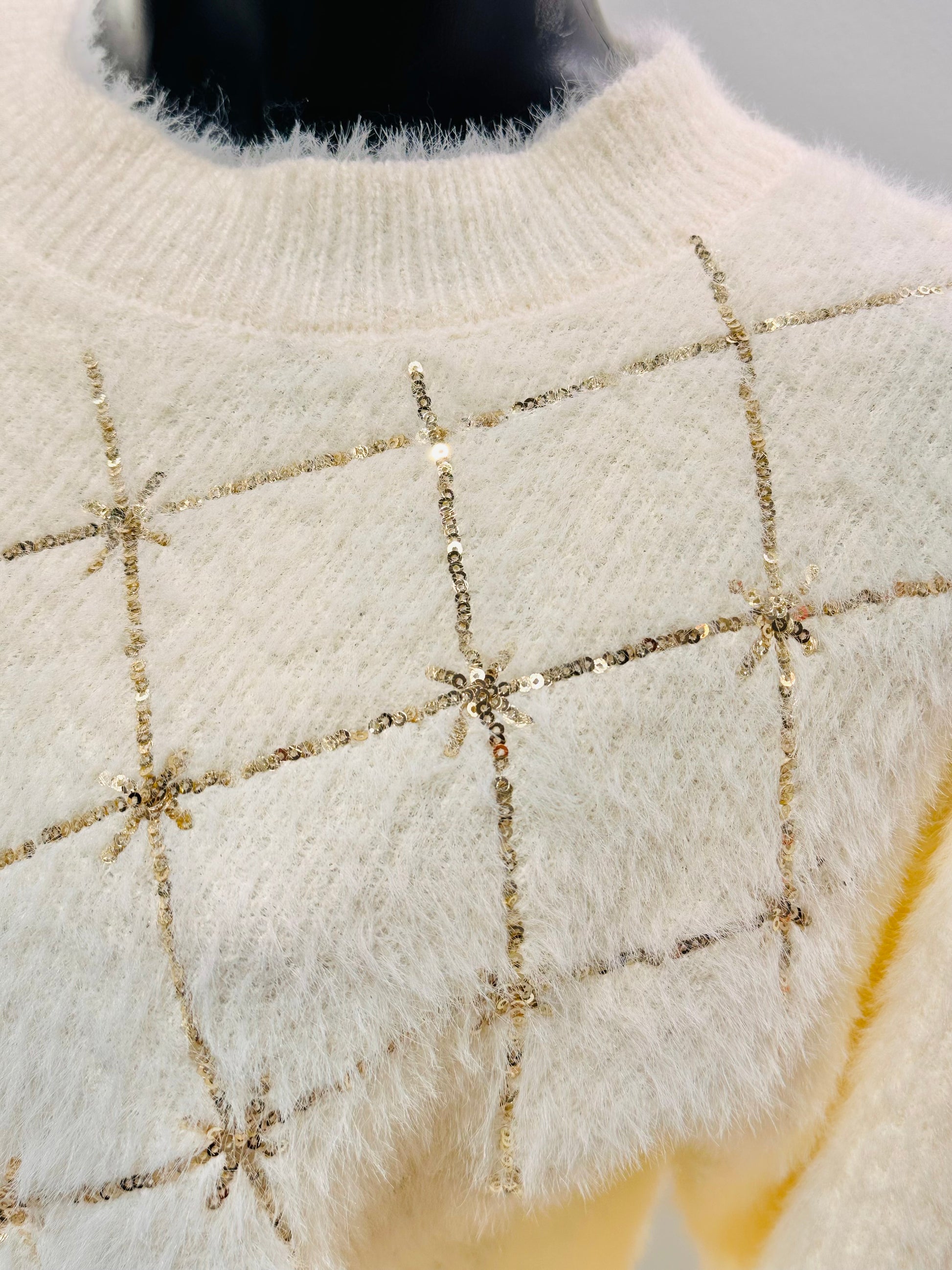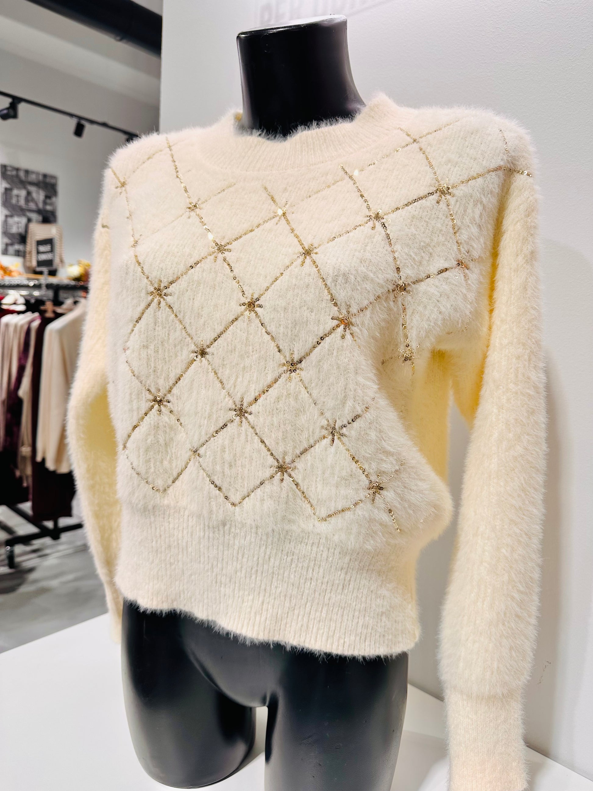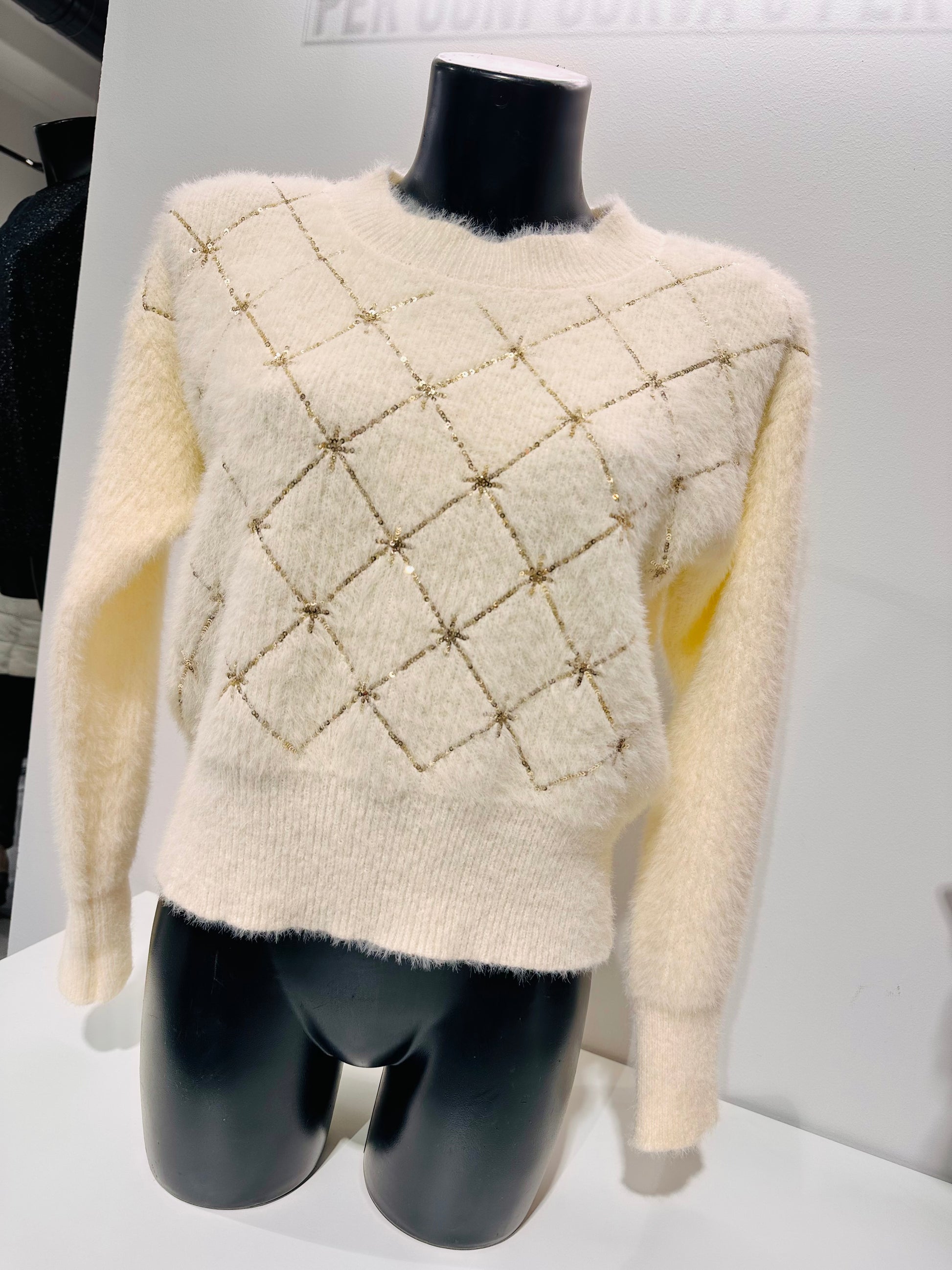 Maglioncino pelosetto, con rombi e paillettes cucite. Vestibilità regolare