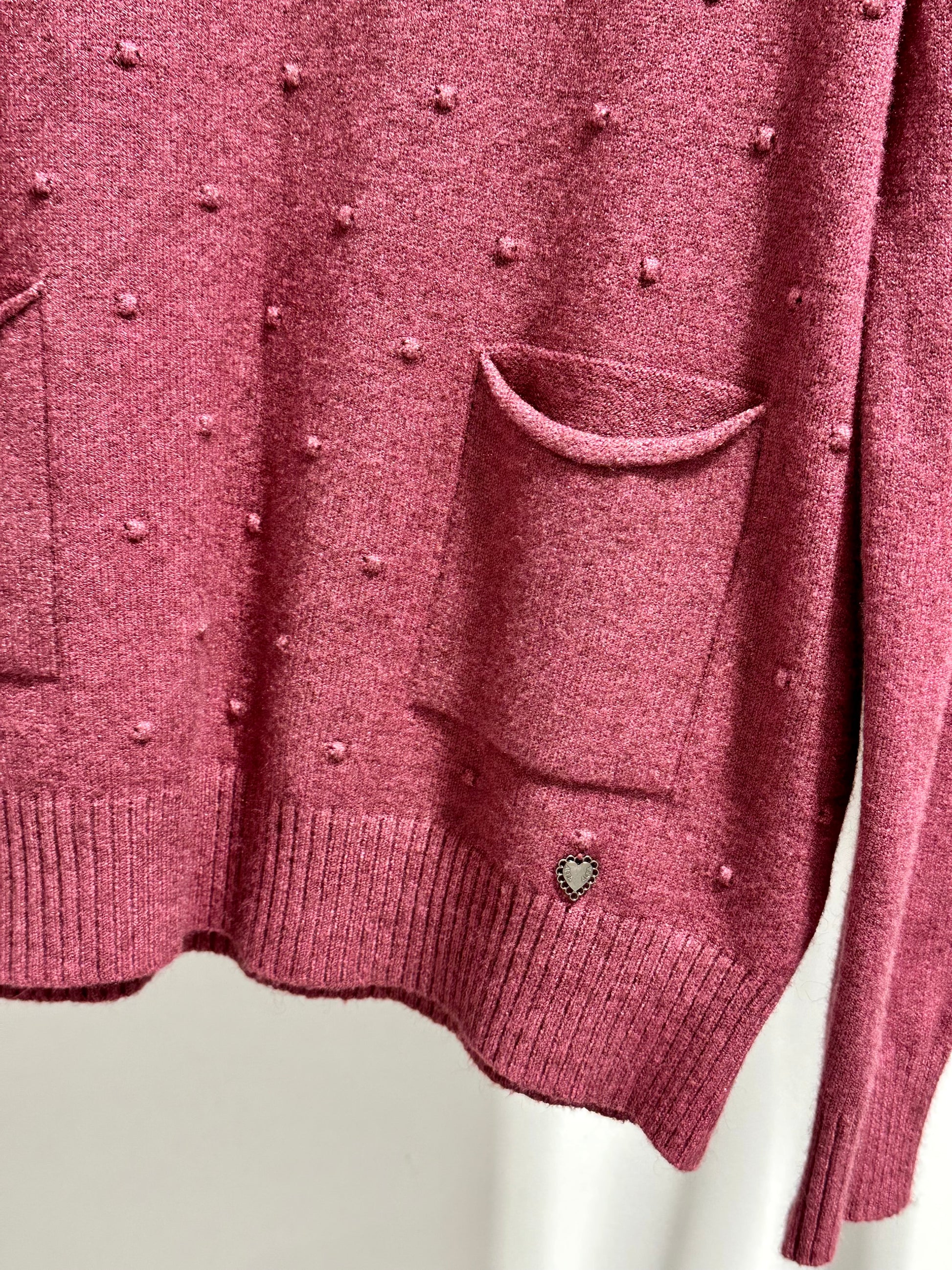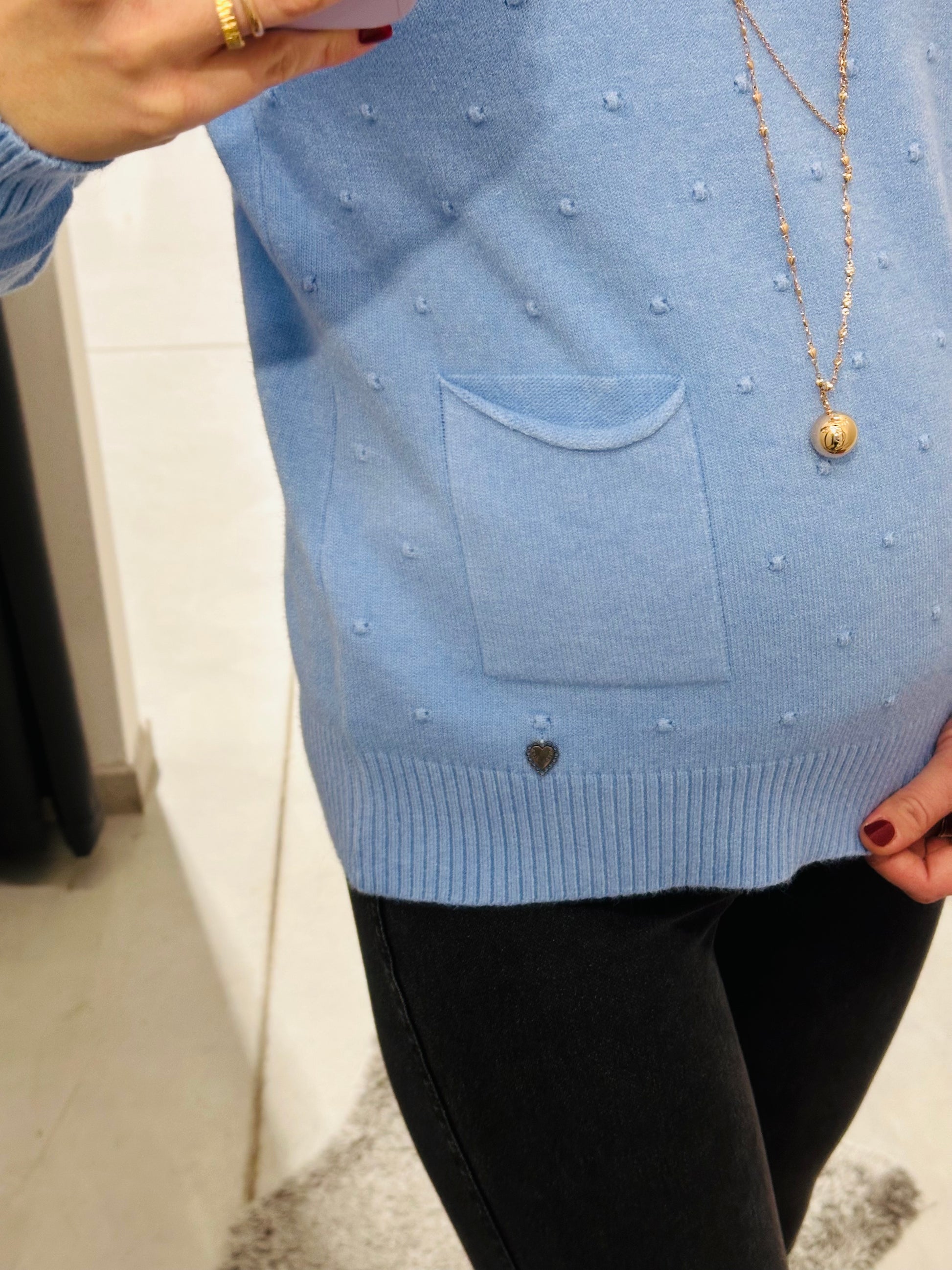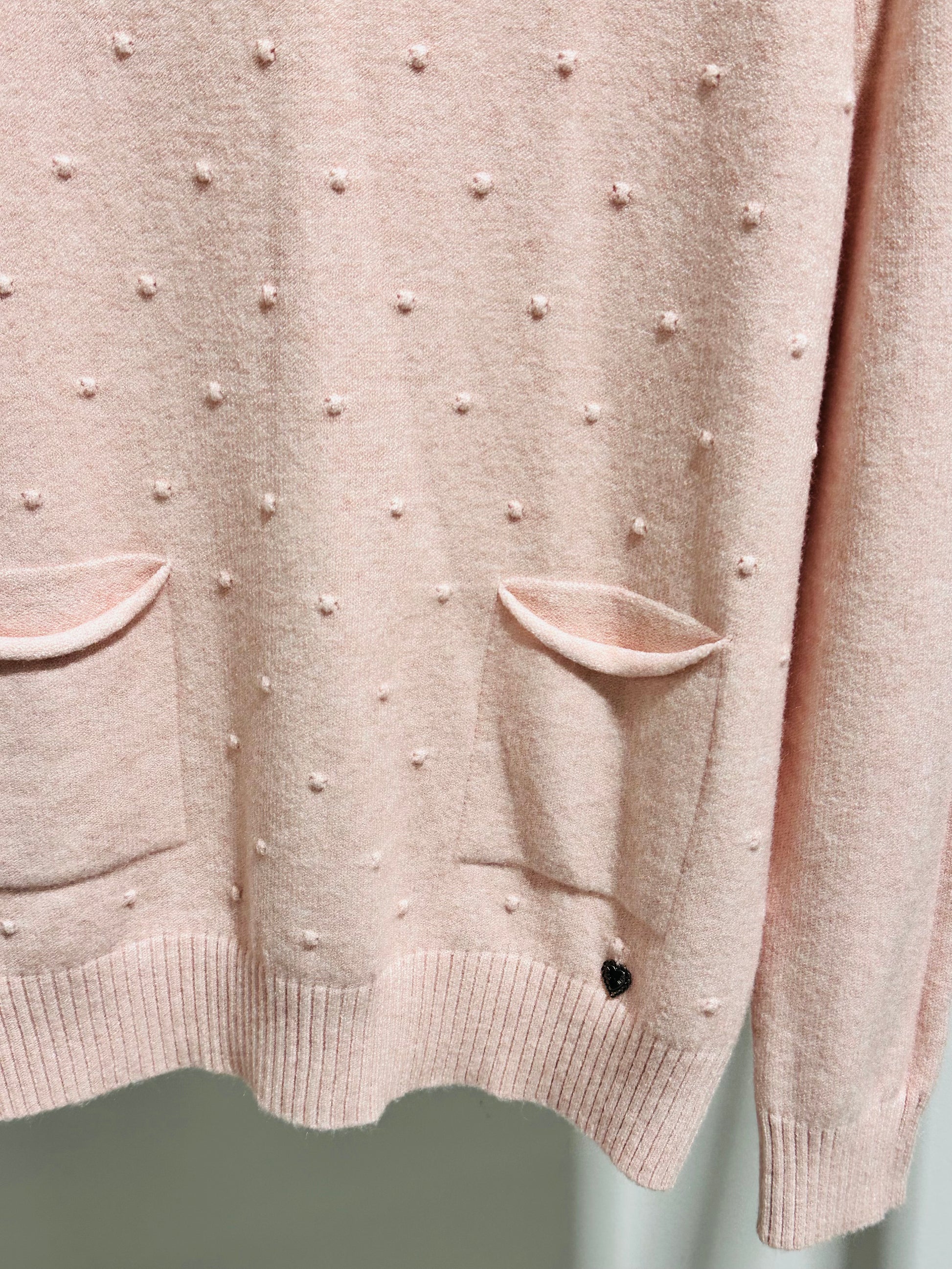 Maglioncino in calda viscosa con puntini in rilievo e taschine. Cuoricino cucito, vestibilità regolare