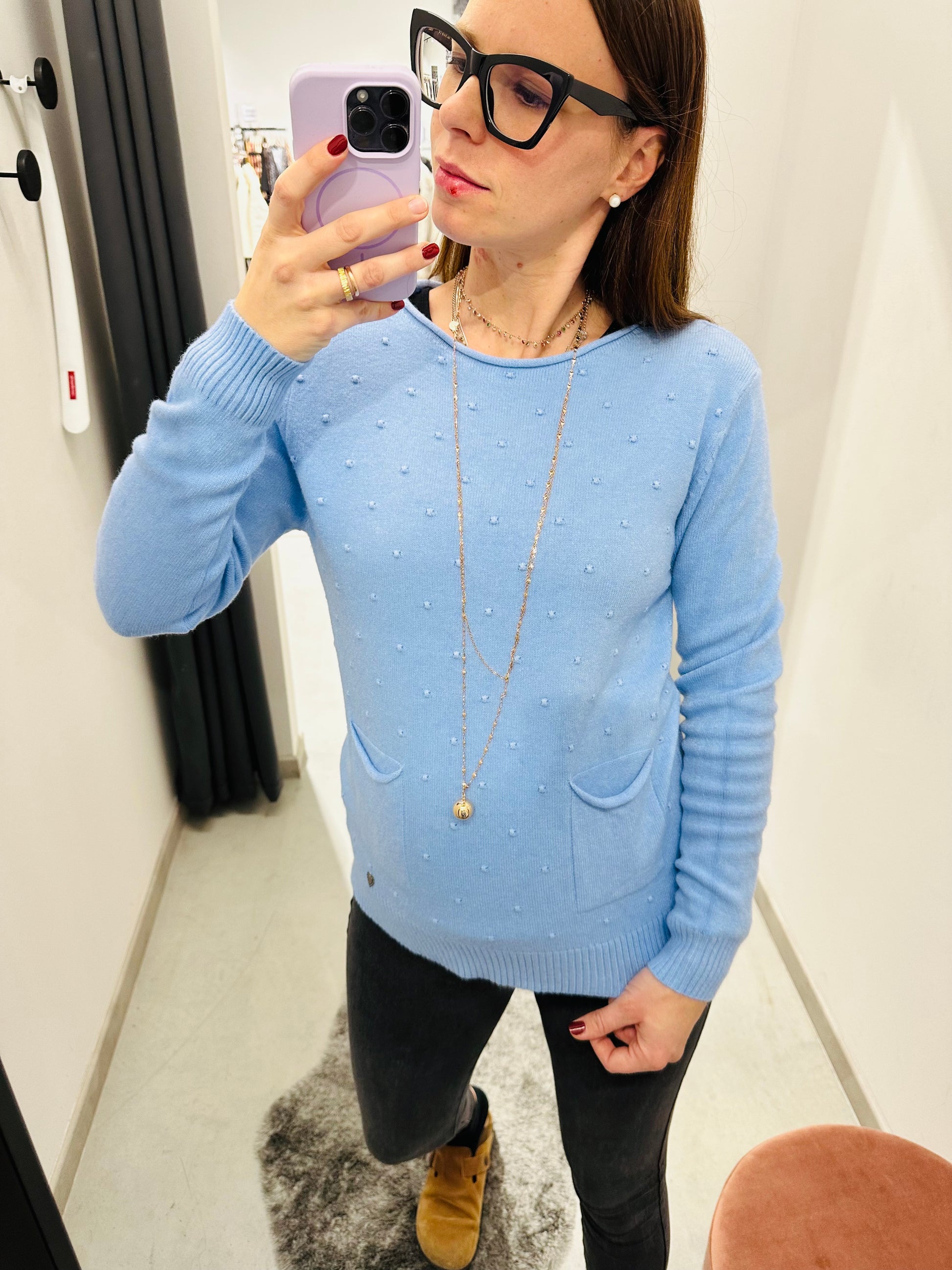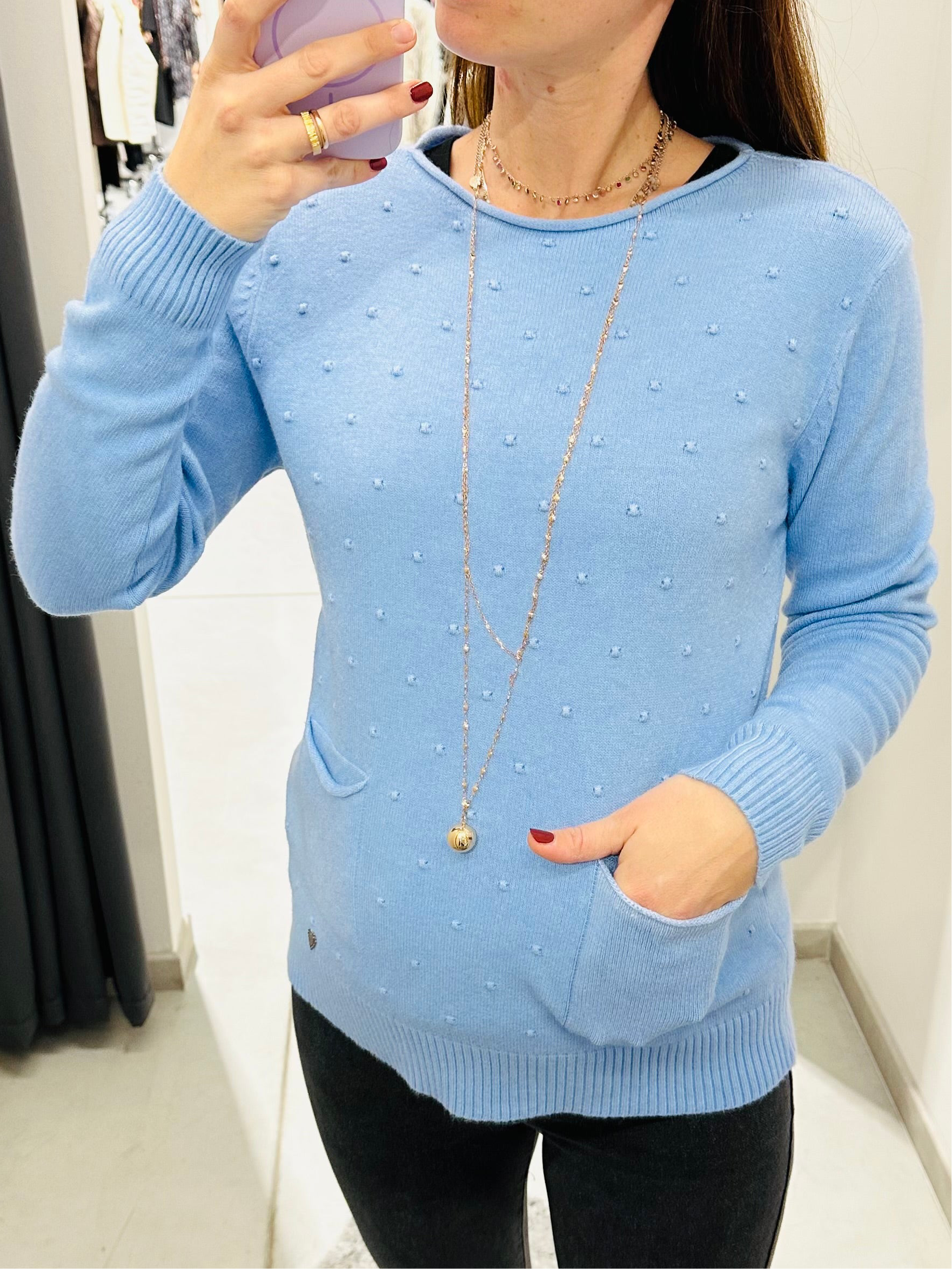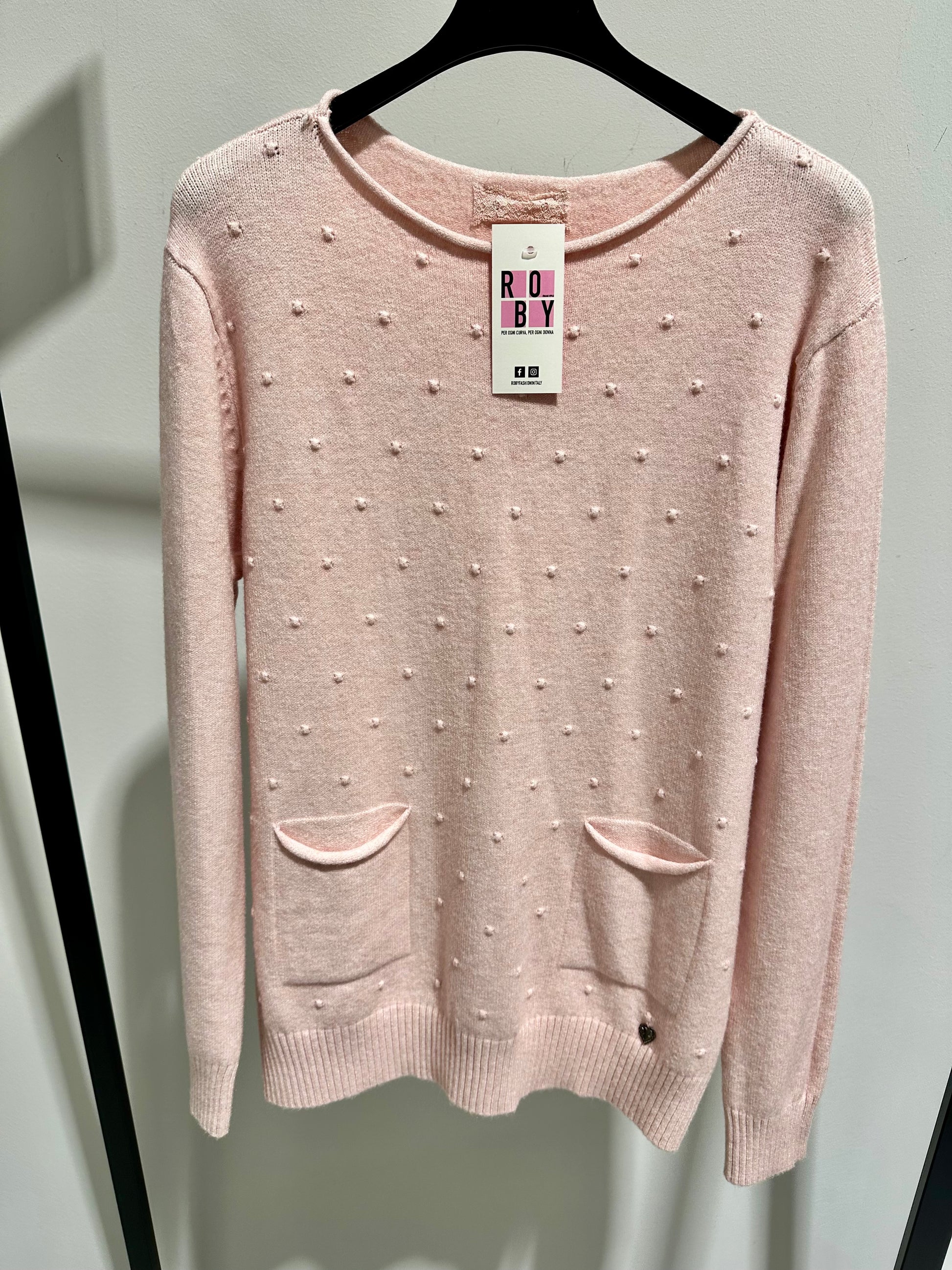 Maglioncino in calda viscosa con puntini in rilievo e taschine. Cuoricino cucito, vestibilità regolare