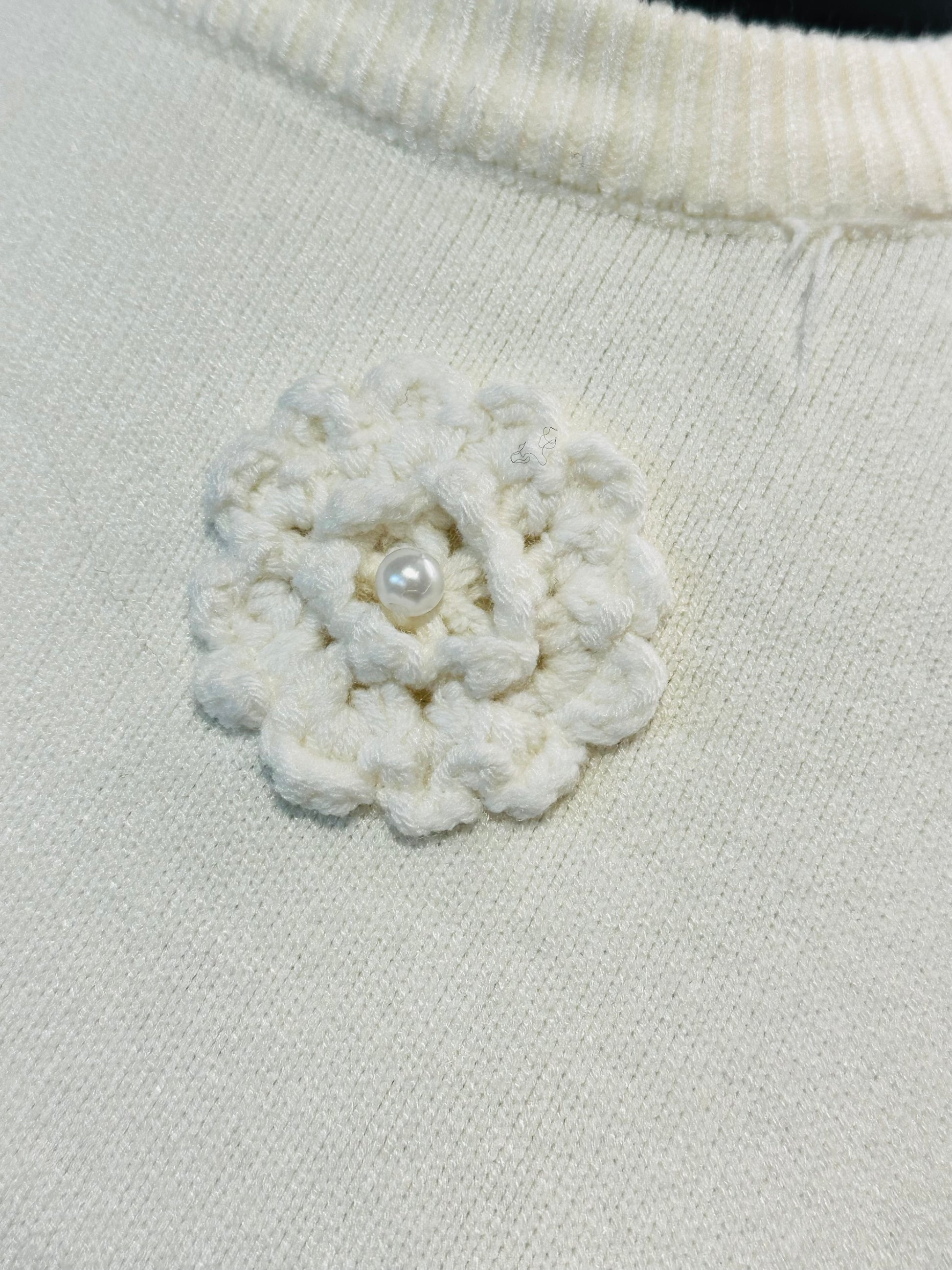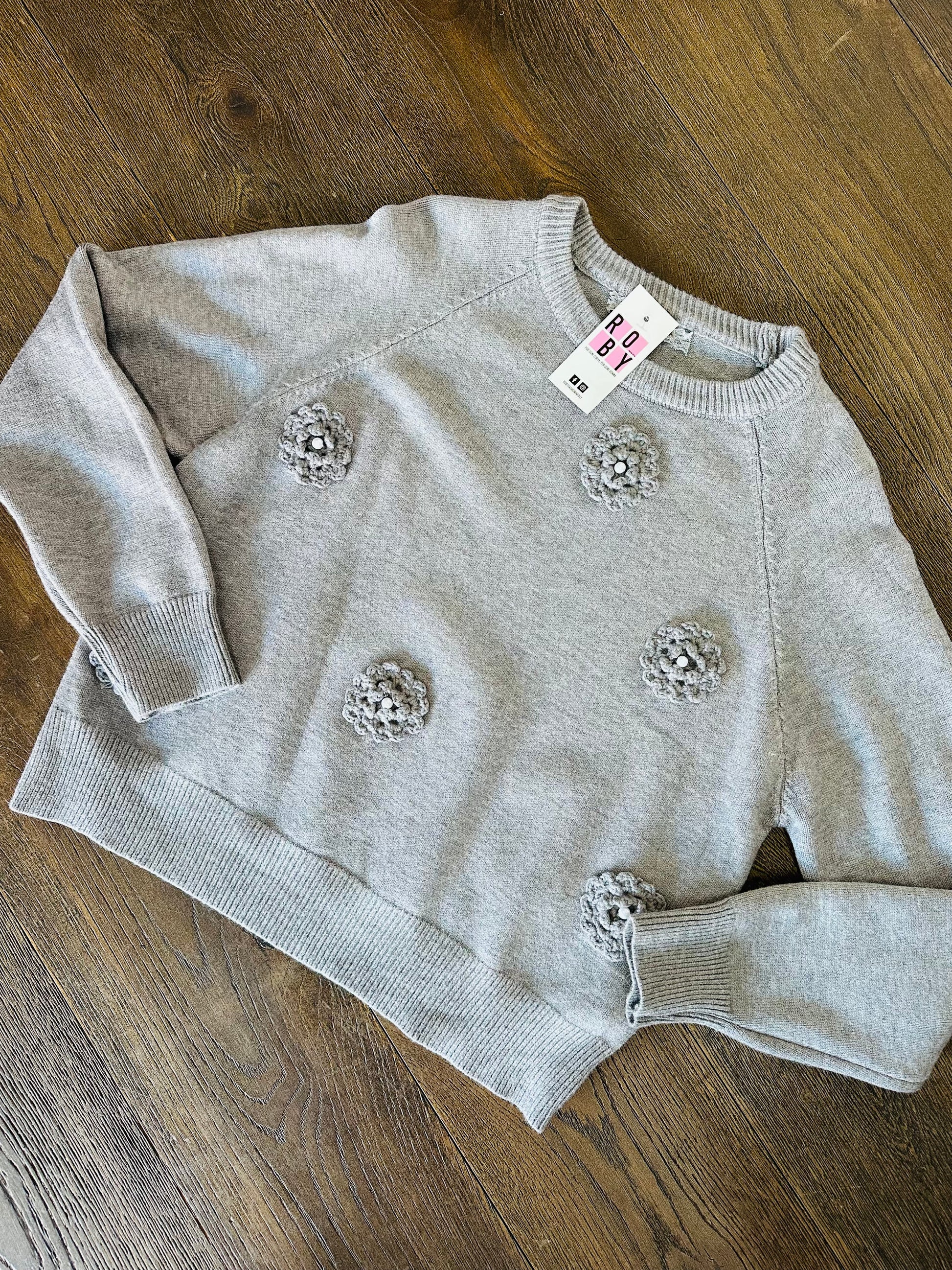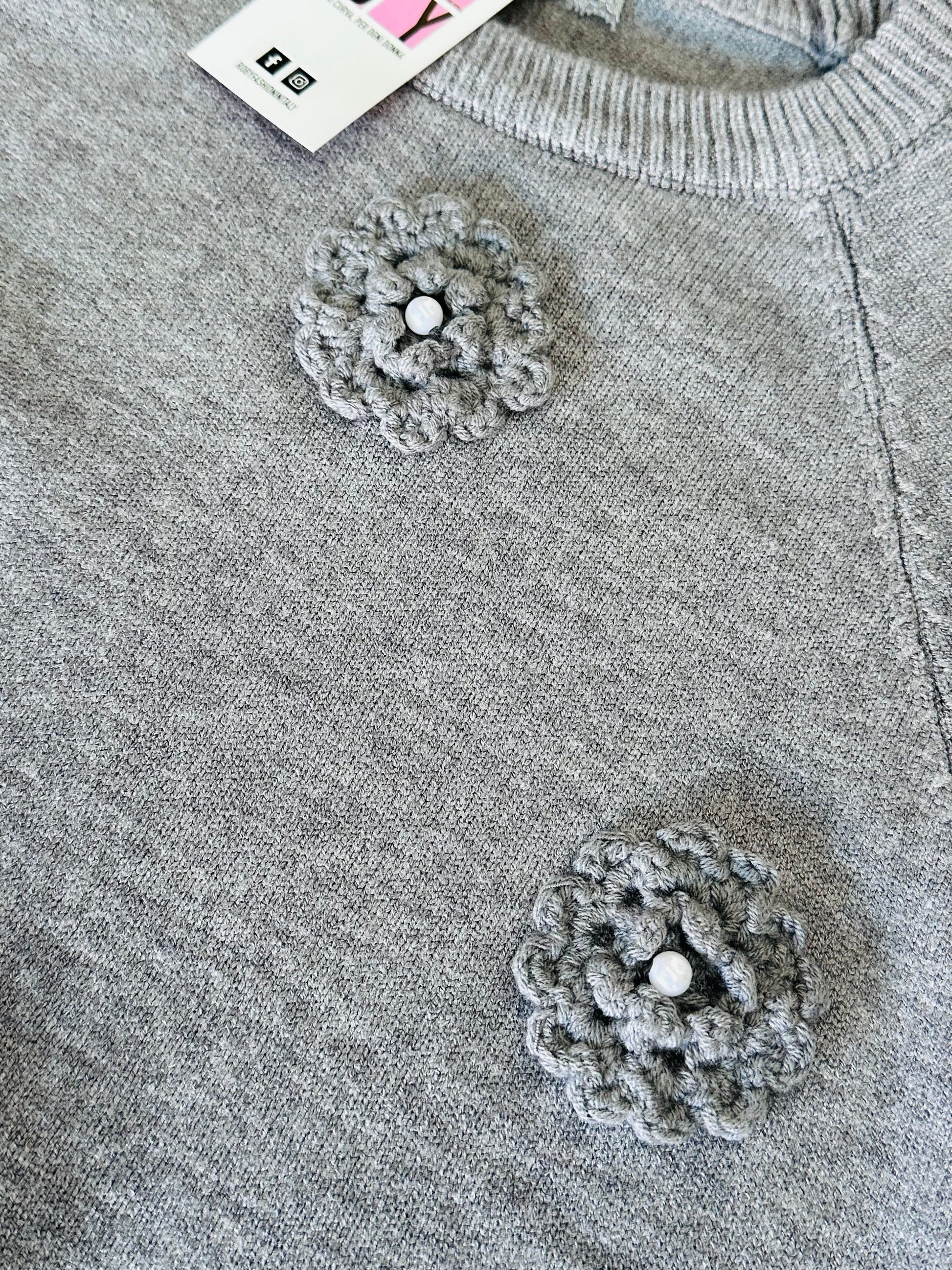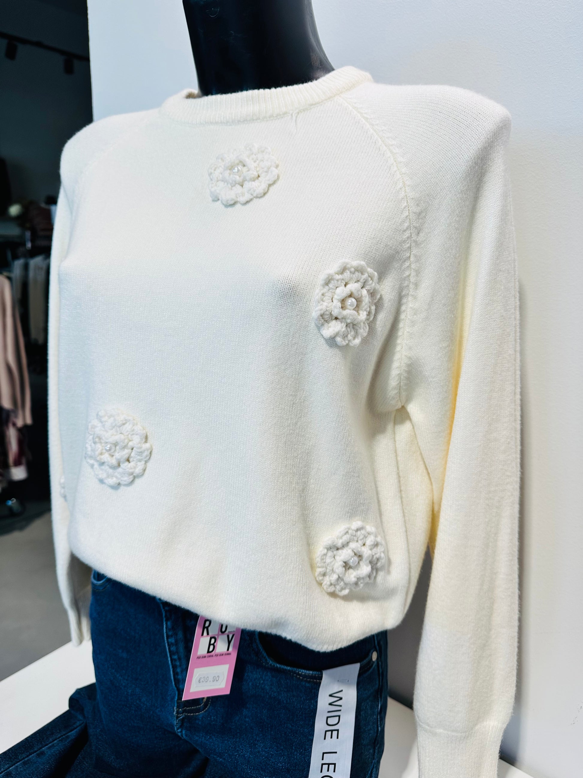 Maglione in calda viscosa con fiori in rilievo, fiori cuciti con perline cucita. Vestibilità regolare
