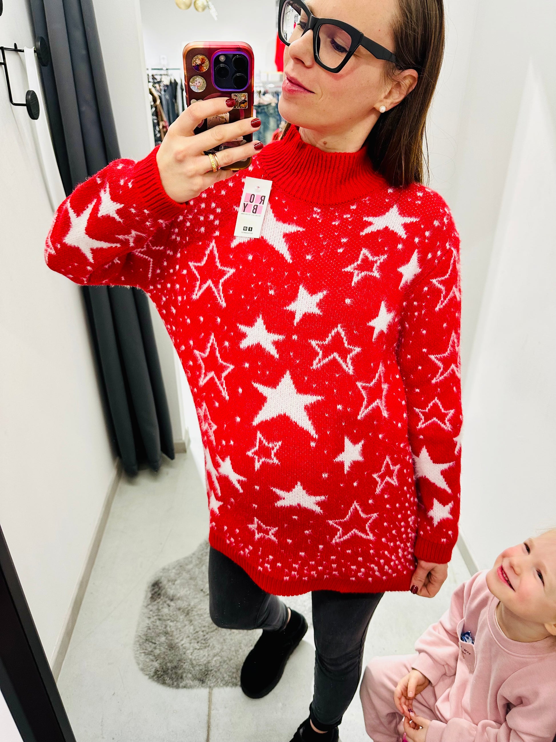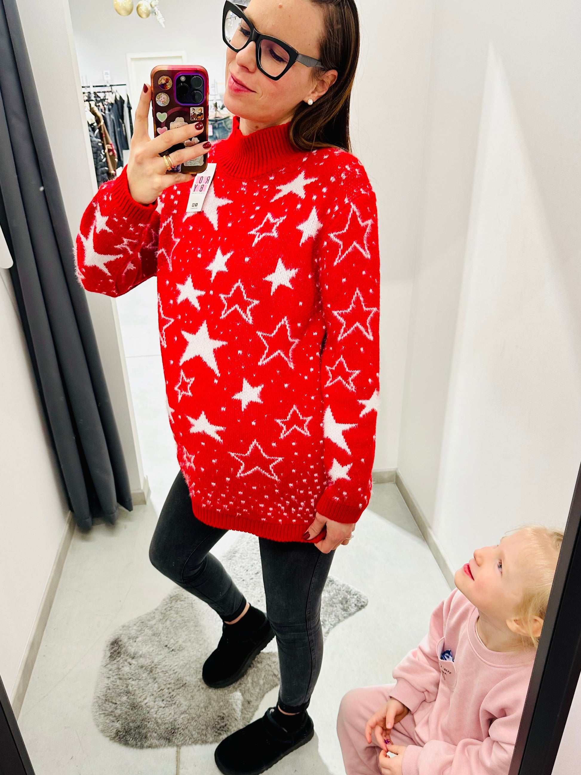 Maglione caldo con stelle, leggermente pelosetto. Collo a lupetto, vestibilità regolare