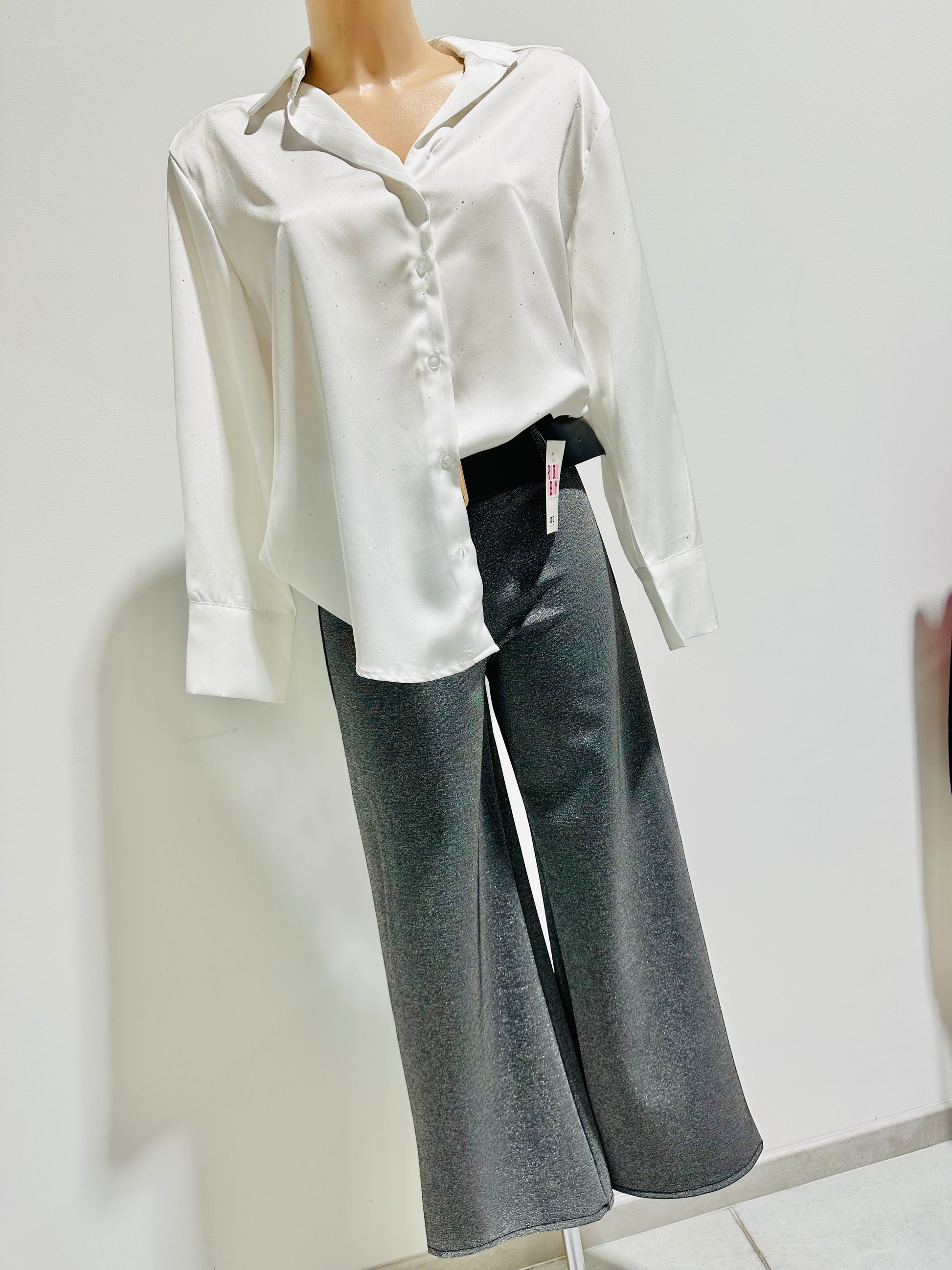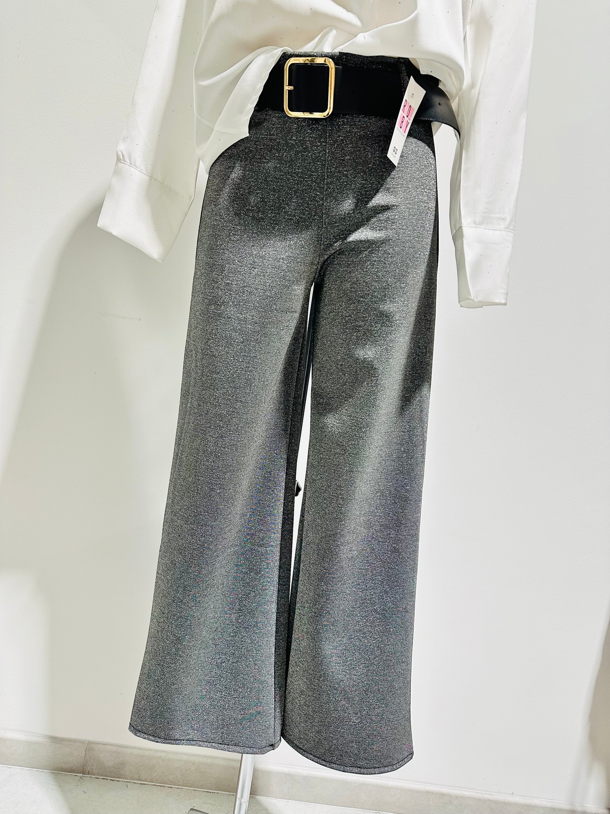 Panta palazzo laminato in calda viscosa, vita alta con elastico in vita. Cintura inclusa. Vestibilità regolare