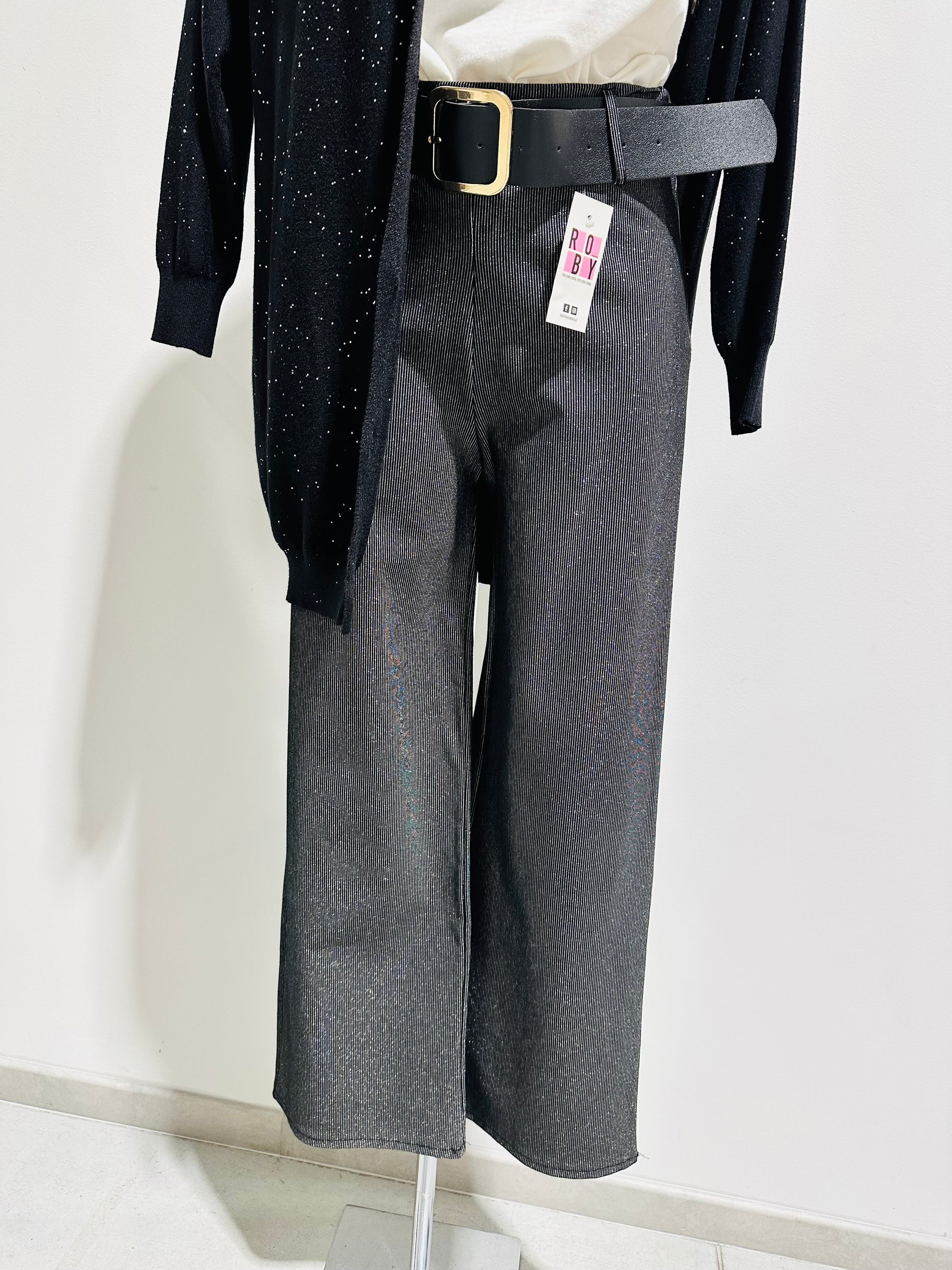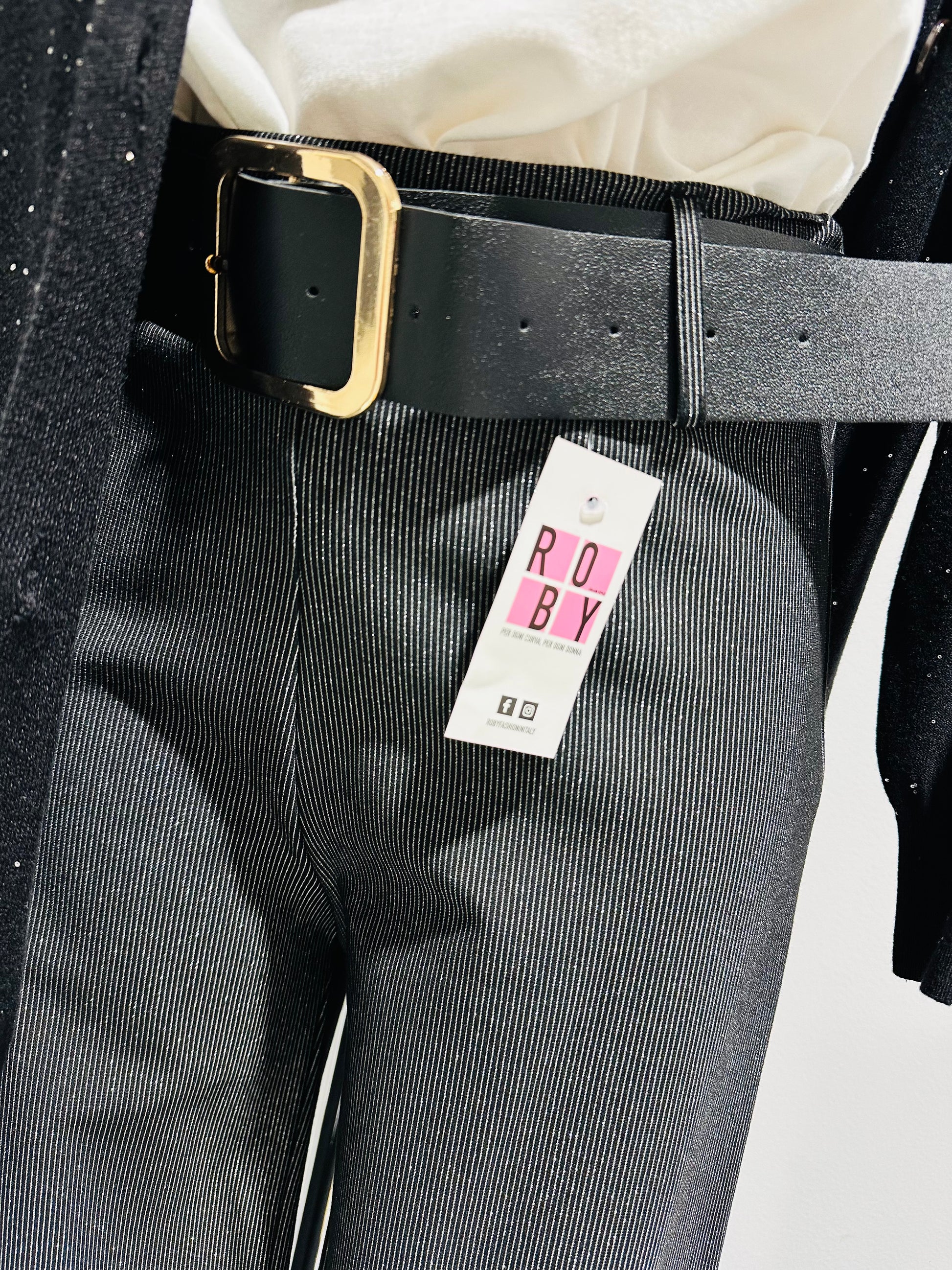 Panta palazzo millerighe in calda viscosa, laminato. Vita alta con elastico in vita e cintura inclusa. Vestibilità regolare