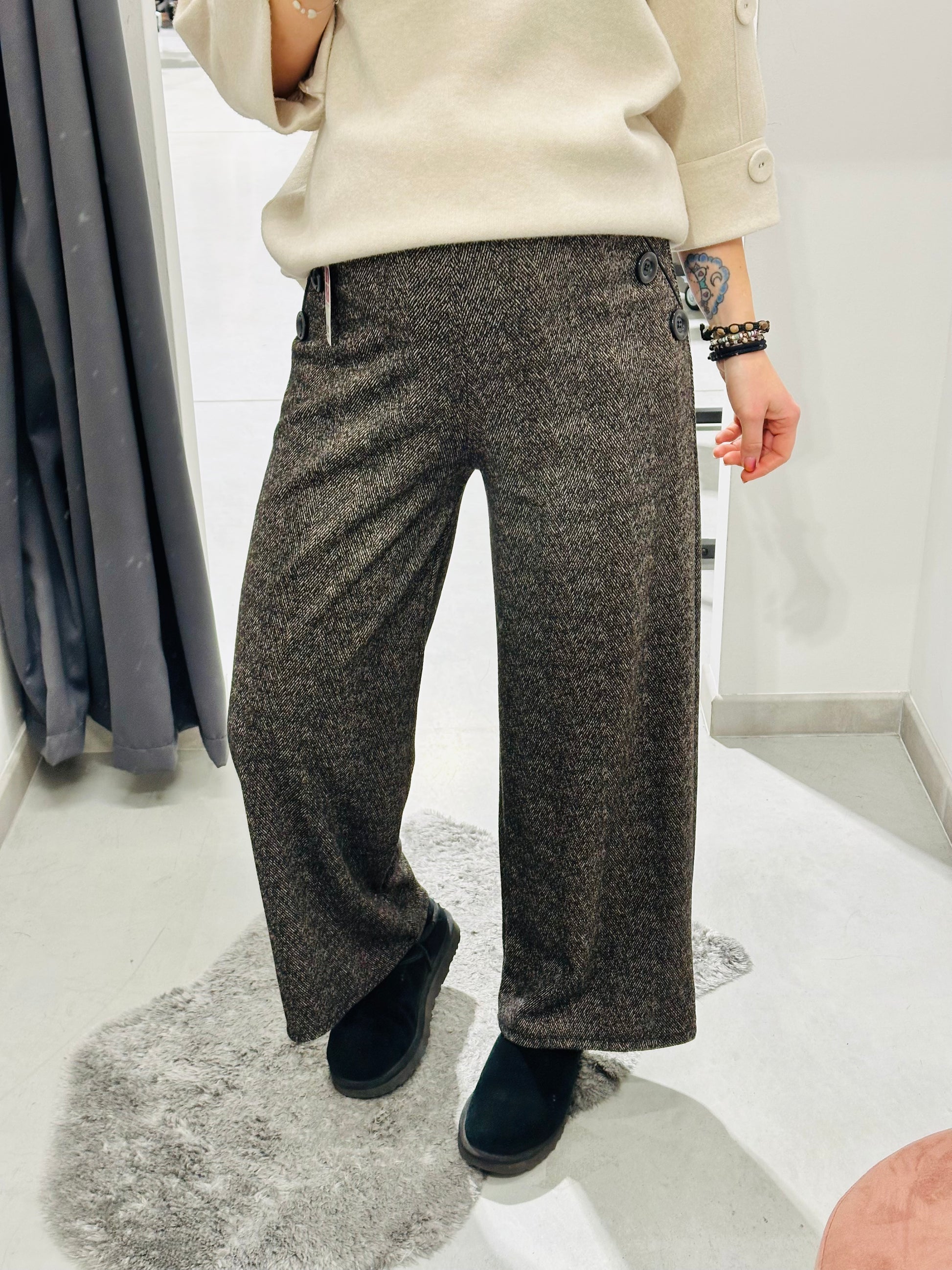 Panta palazzo in calda viscosa, elastico in vita e con fantasia spina pesce. Bottoni cuciti laterali. Vestibilità piccola! SCEGLI UNA TAGLIA IN PIÙ!