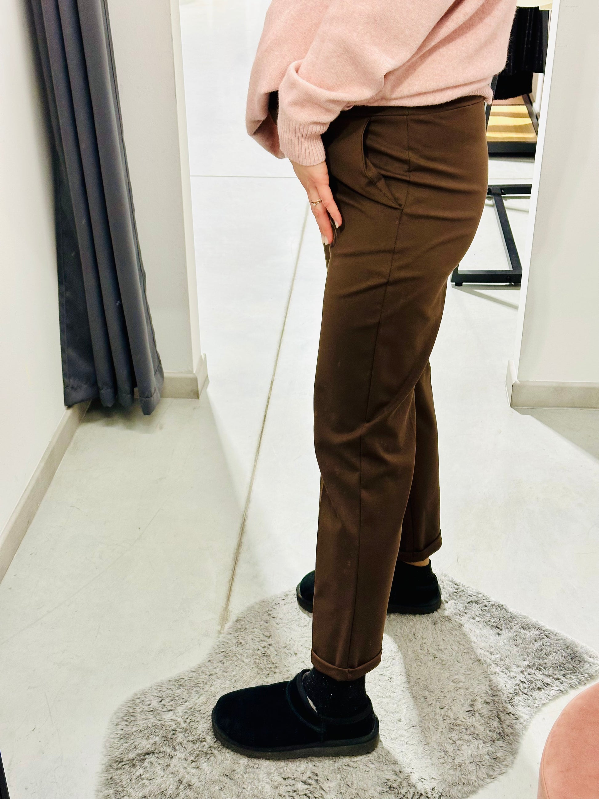 Pantaloni punto milano in calda viscosa, vita medio alta con elastico in vita. Vestibilità regolare
