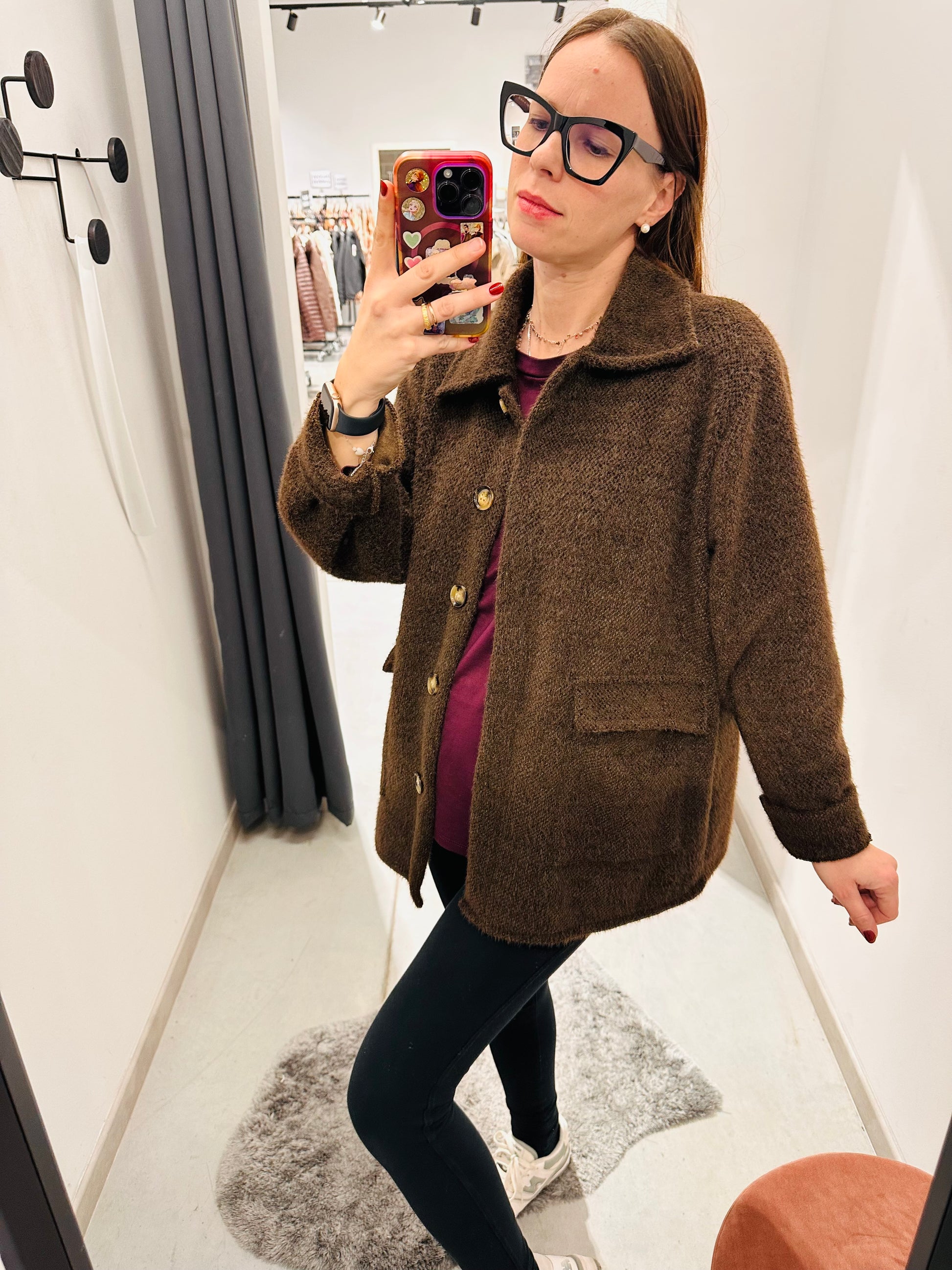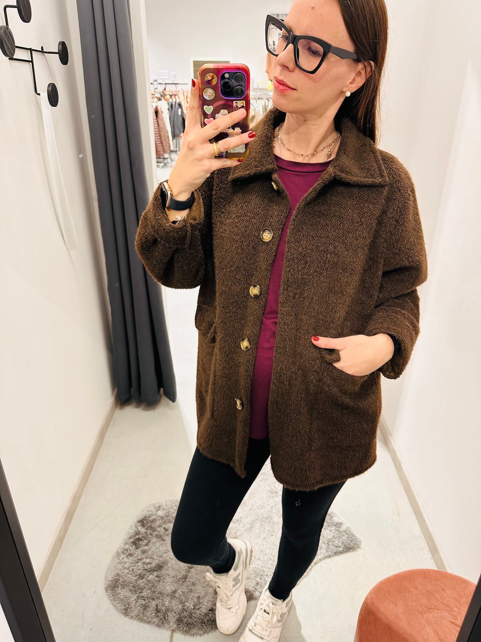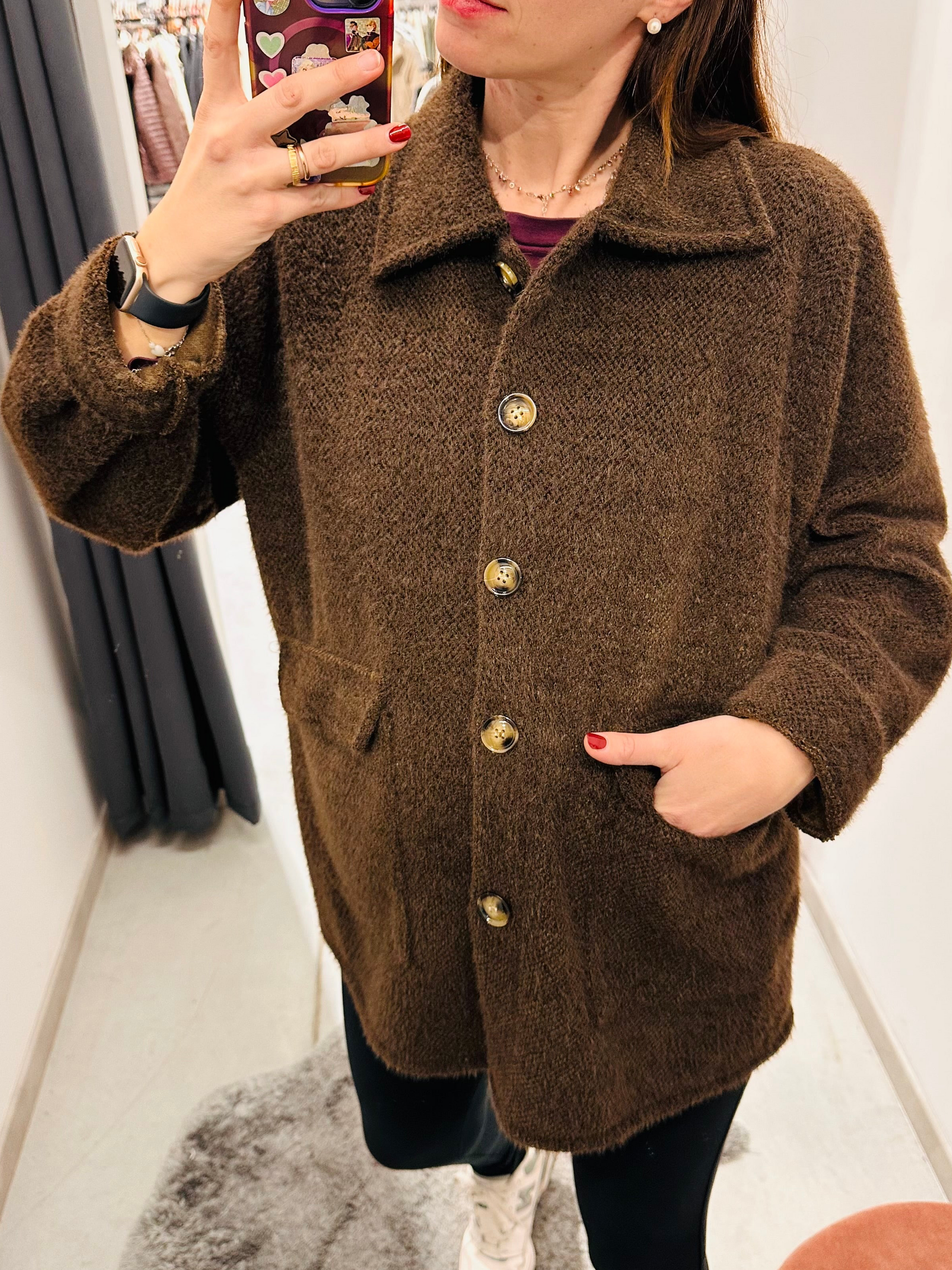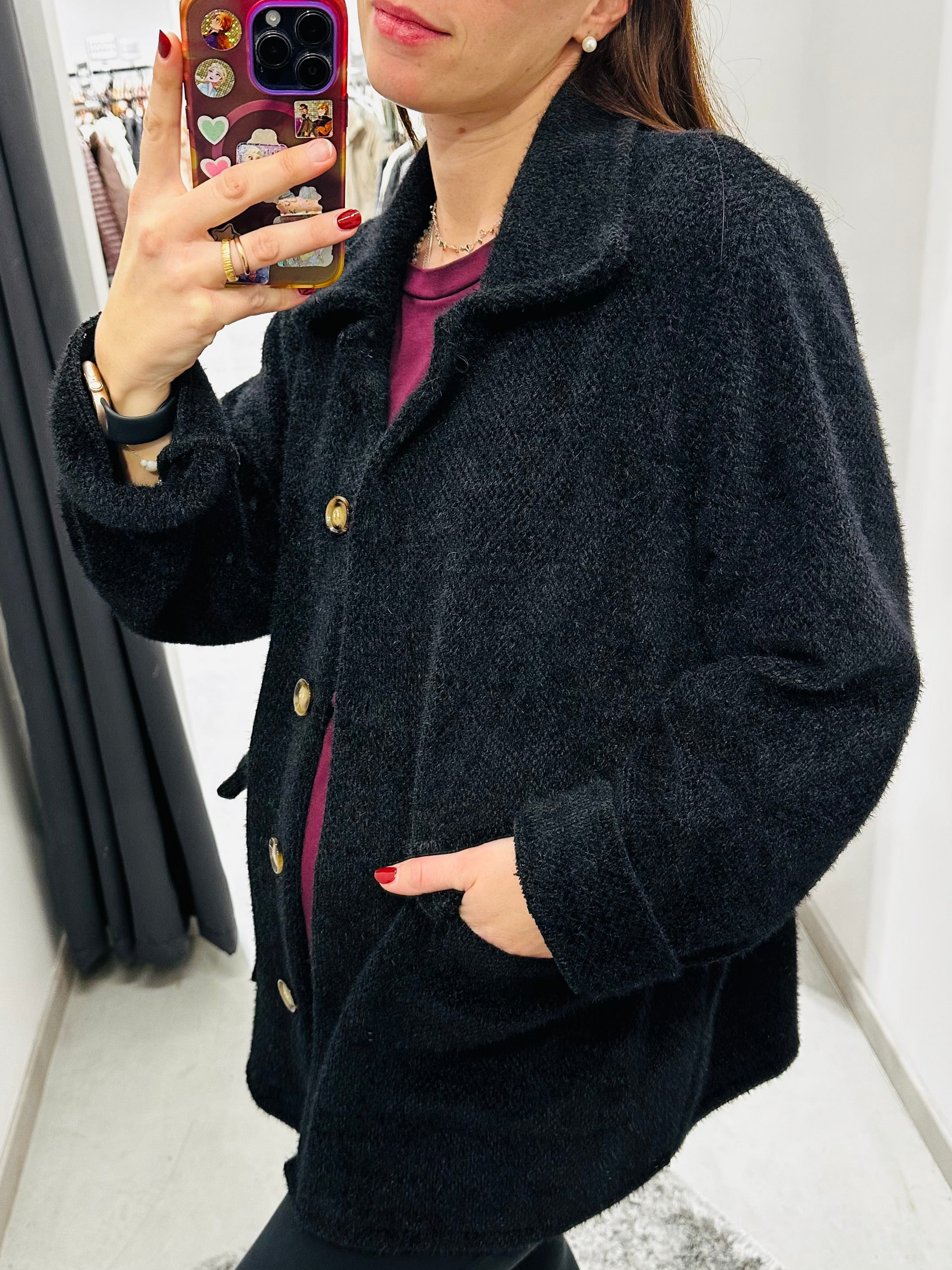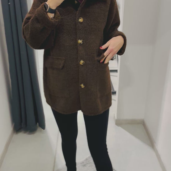 Giubbettino sfoderato pelosetto, chiusura con bottoni. Vestibilità morbida