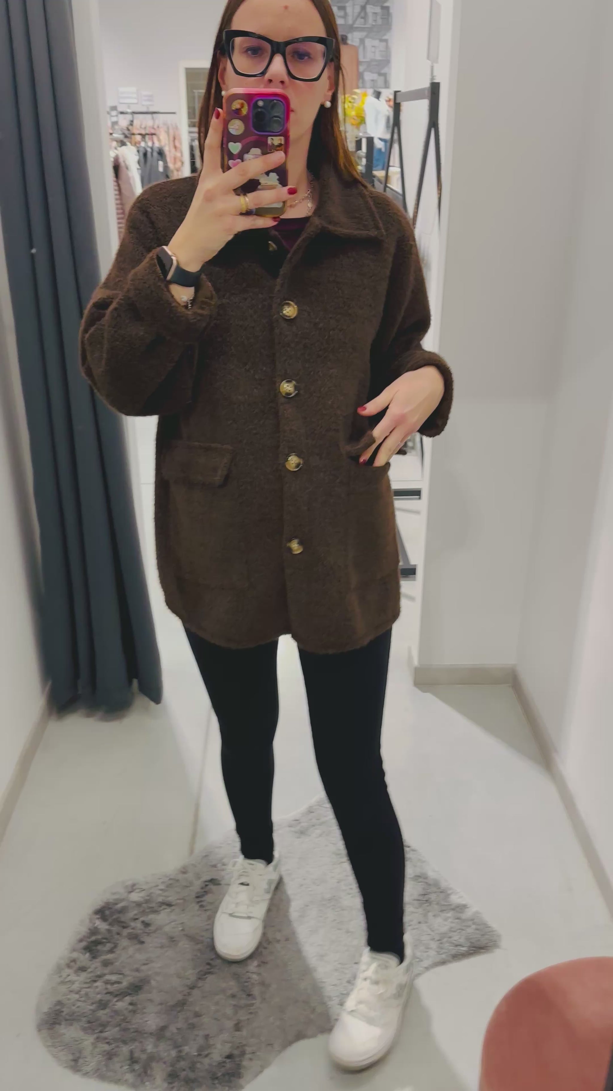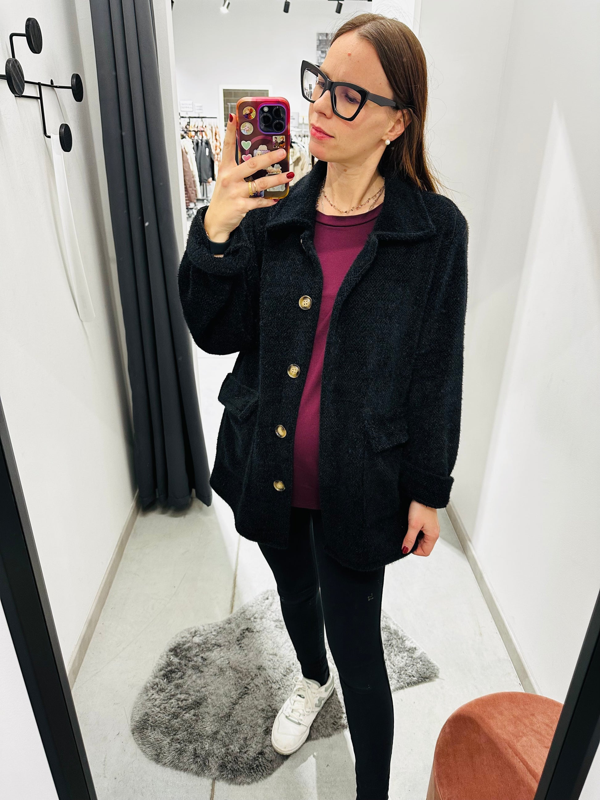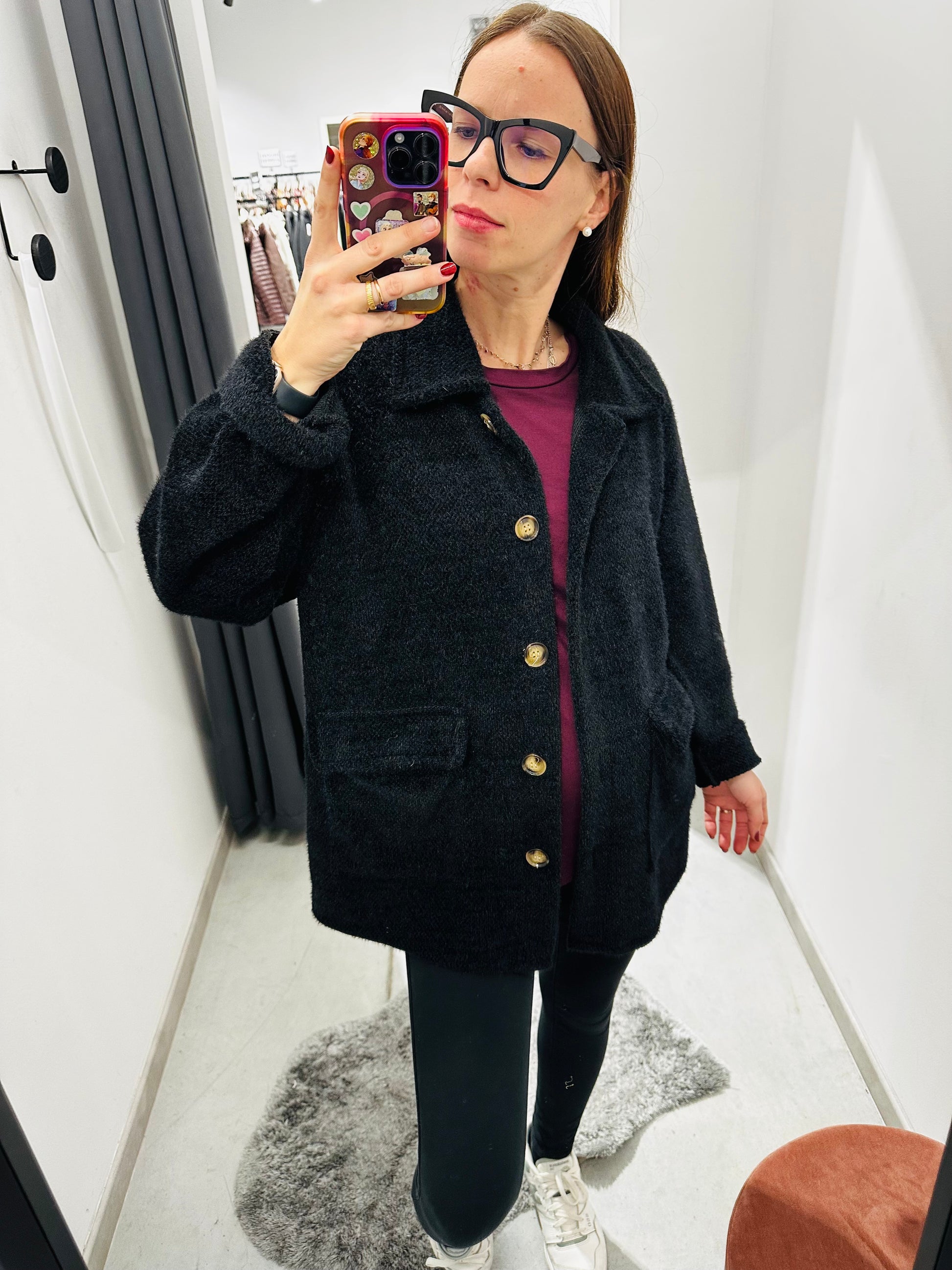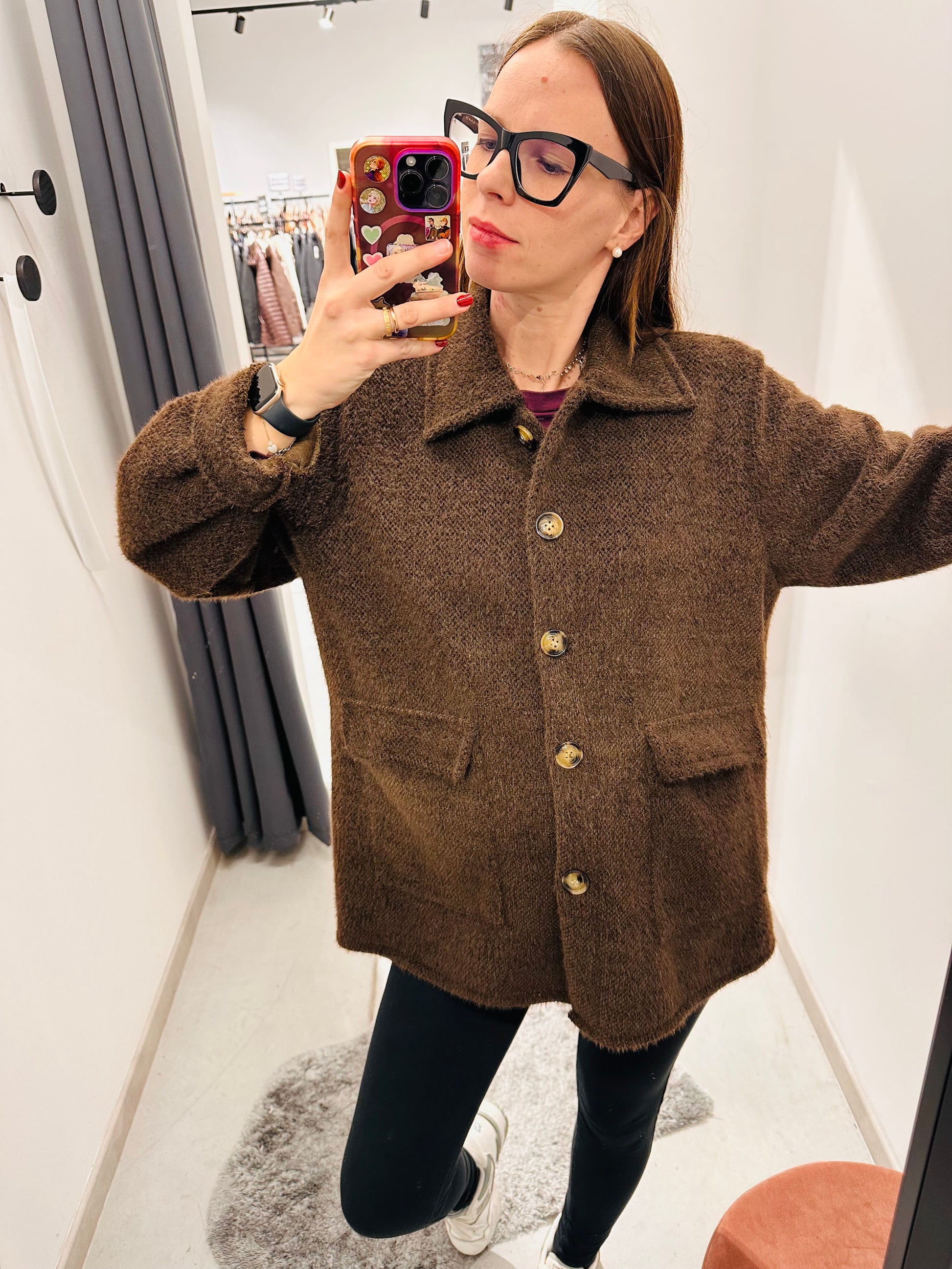 Giubbettino sfoderato pelosetto, chiusura con bottoni. Vestibilità morbida