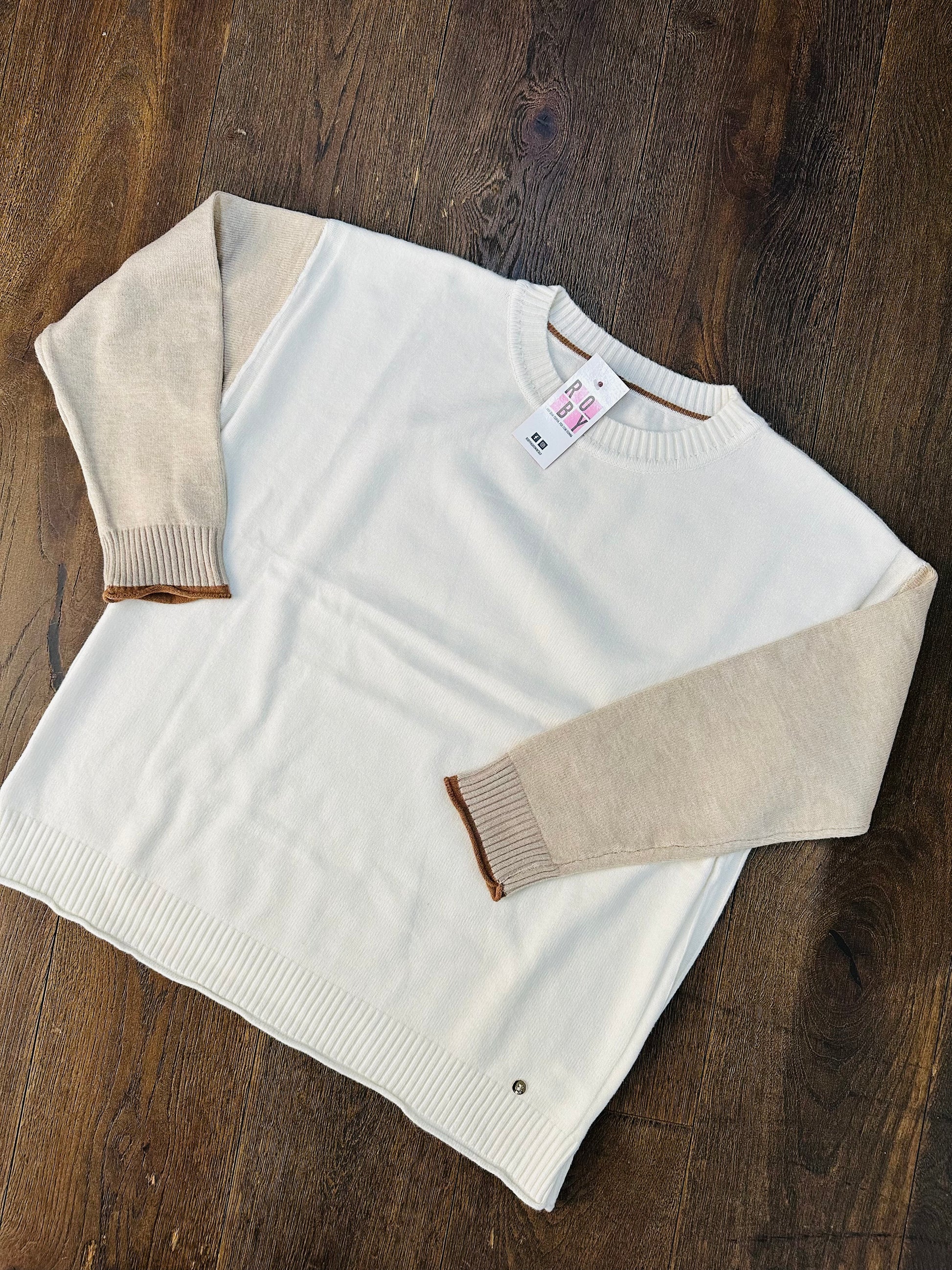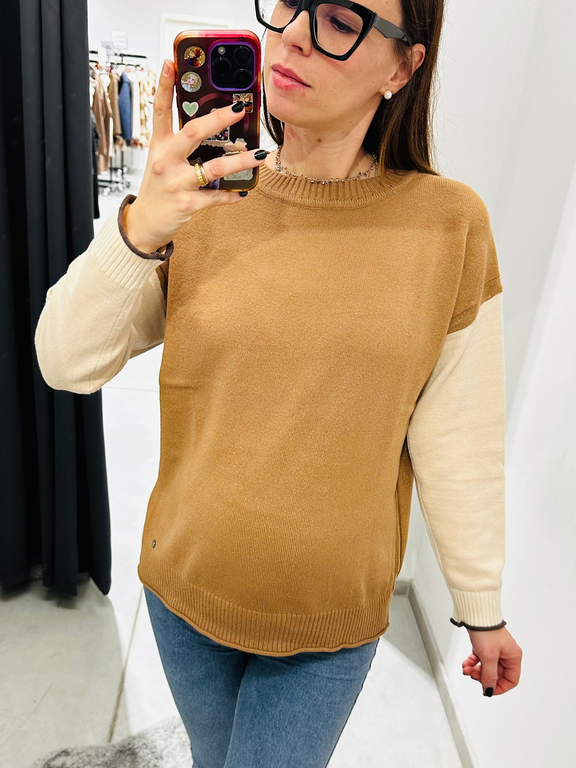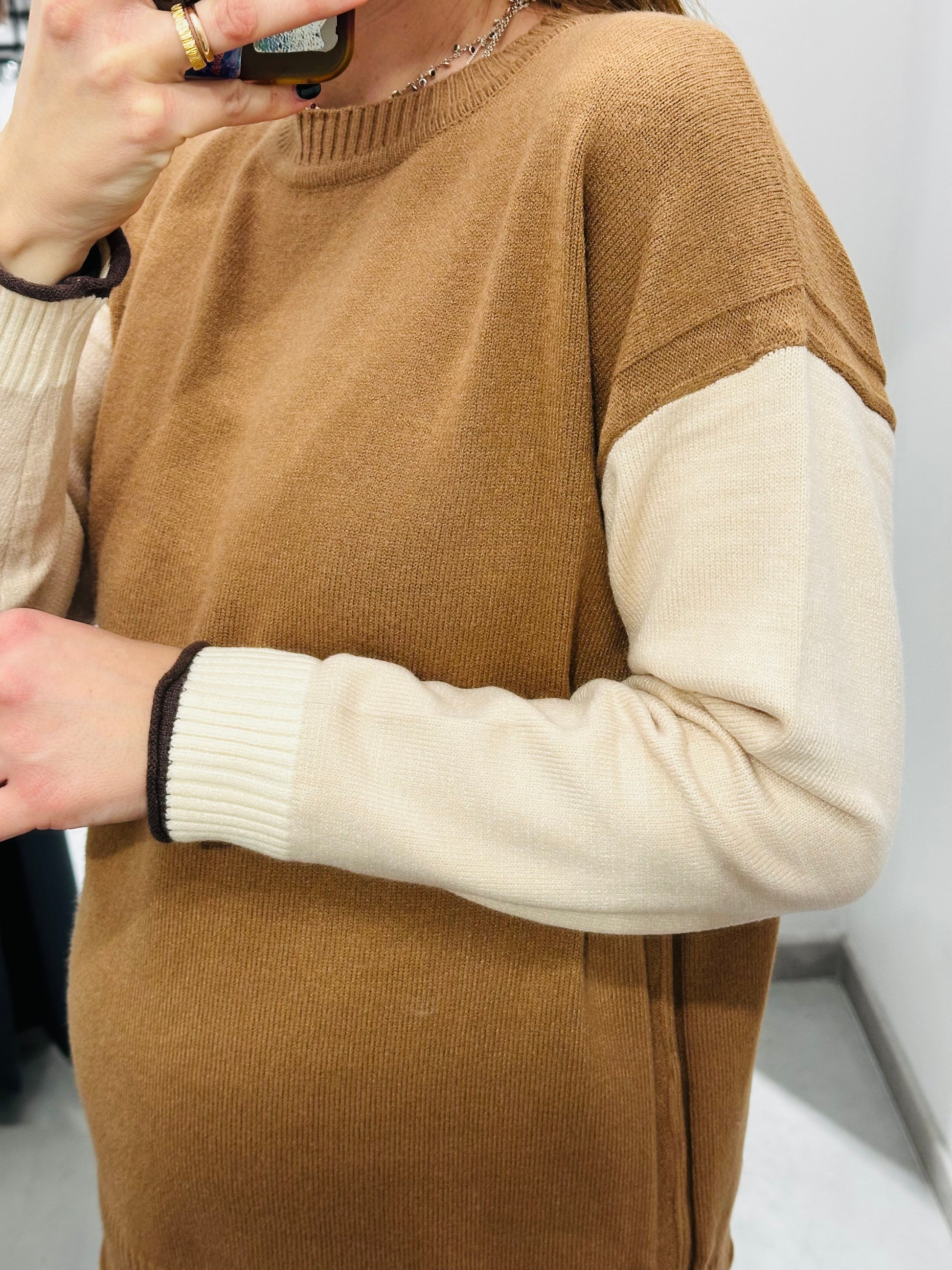 Maglione in calda viscosa, maniche di colore diverso. Vestibilità morbida